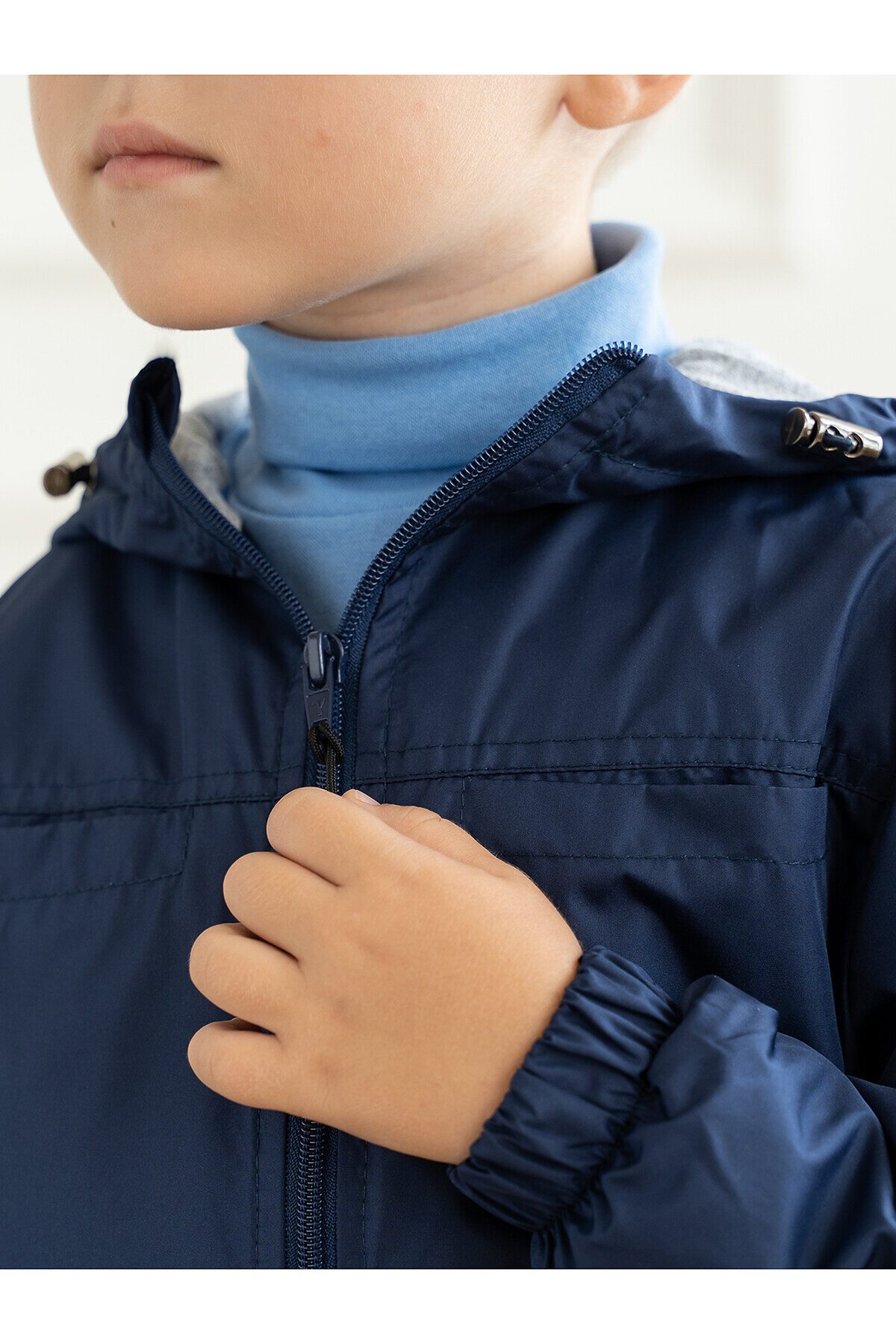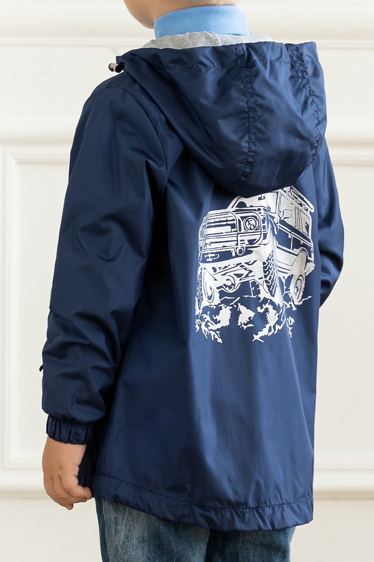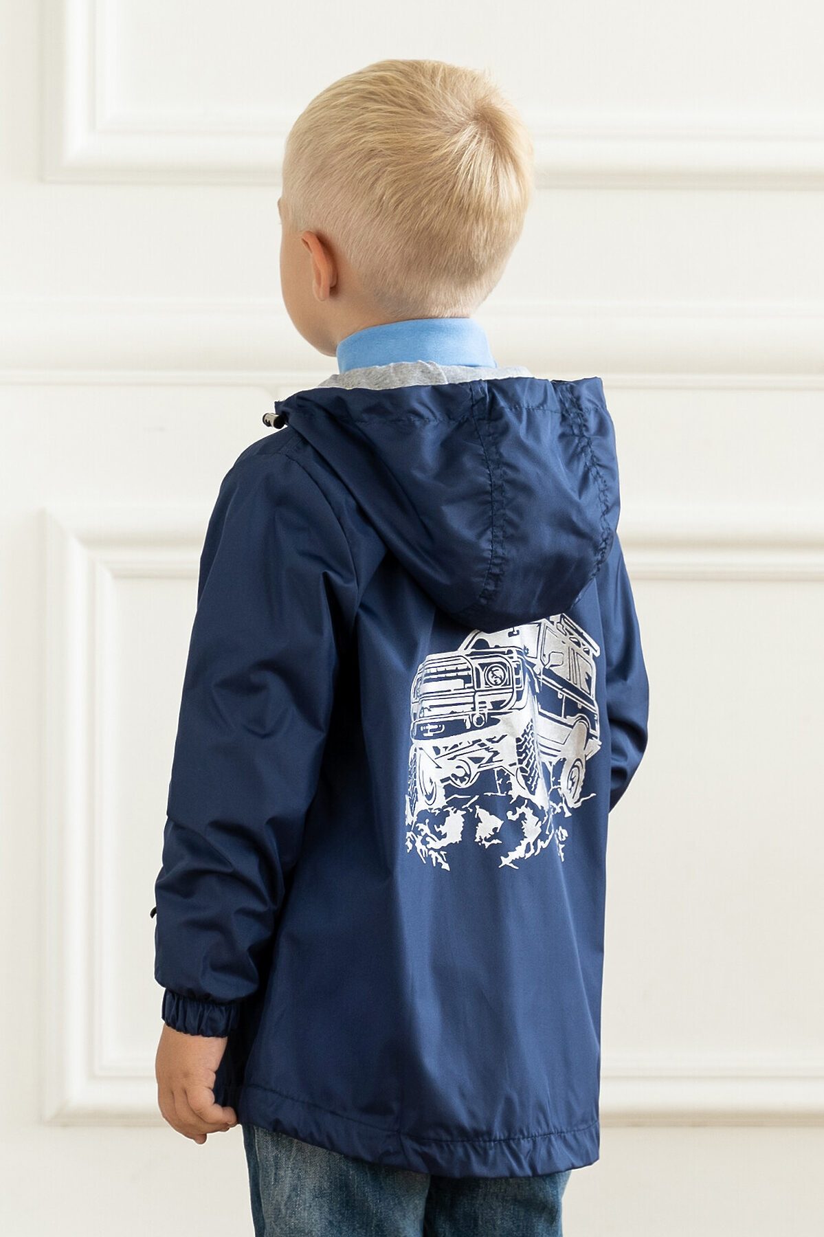 Детская ветровка для мальчиков из однотонной синей курточной ткани Дюспо на прямой молнии. Сверху клапан для бегунка, пластиковый удобный пуллер. Несъемный капюшон, который можно отрегулировать. Подкладка из мягкой нежной дышащей кулирки. Наверху два врезных кармана, по бокам два диагональных кармана на молнии. По низу внутренней стороны куртки утяжка с фиксаторами. Сзади на спине и снизу у кармана принт. >