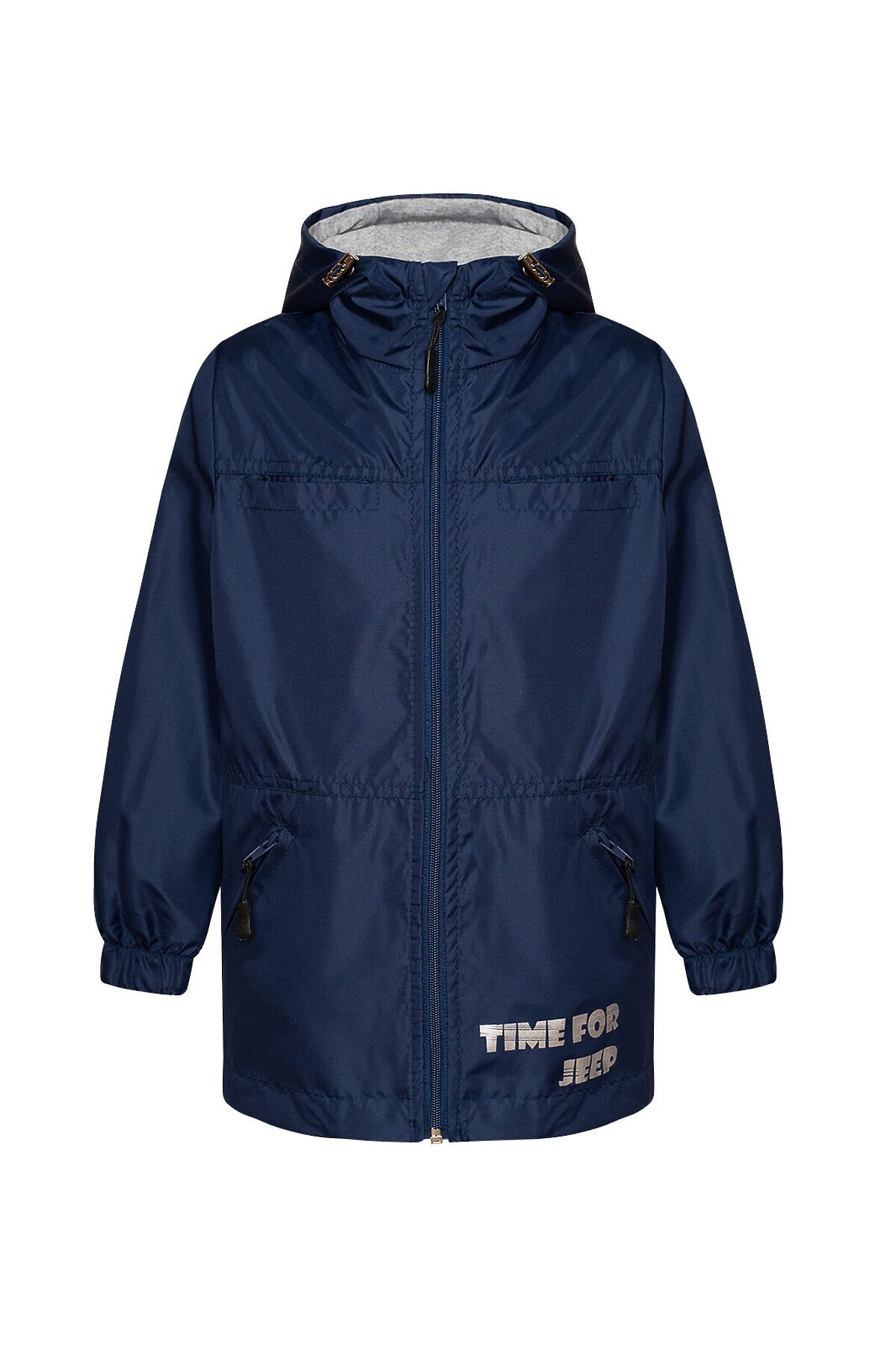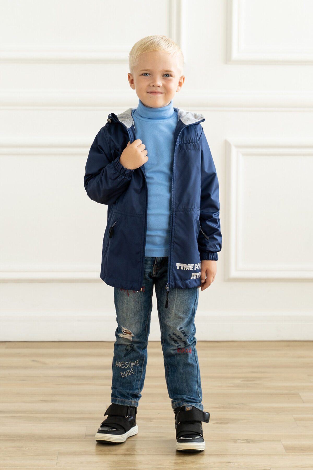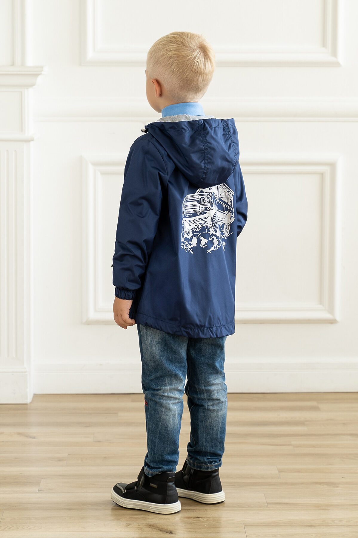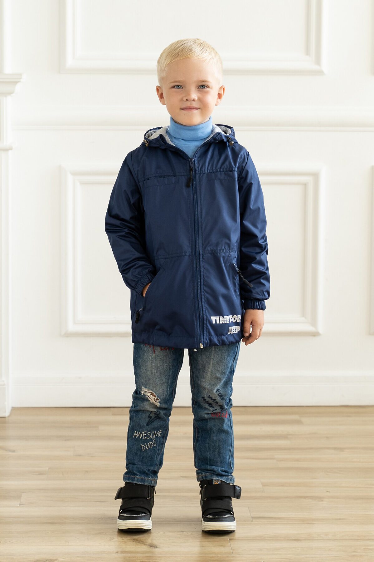 Детская ветровка для мальчиков из однотонной синей курточной ткани Дюспо на прямой молнии. Сверху клапан для бегунка, пластиковый удобный пуллер. Несъемный капюшон, который можно отрегулировать. Подкладка из мягкой нежной дышащей кулирки. Наверху два врезных кармана, по бокам два диагональных кармана на молнии. По низу внутренней стороны куртки утяжка с фиксаторами. Сзади на спине и снизу у кармана принт. >