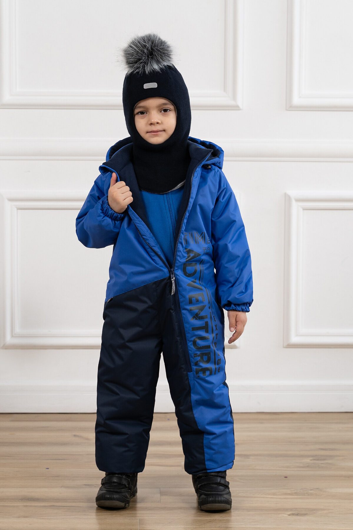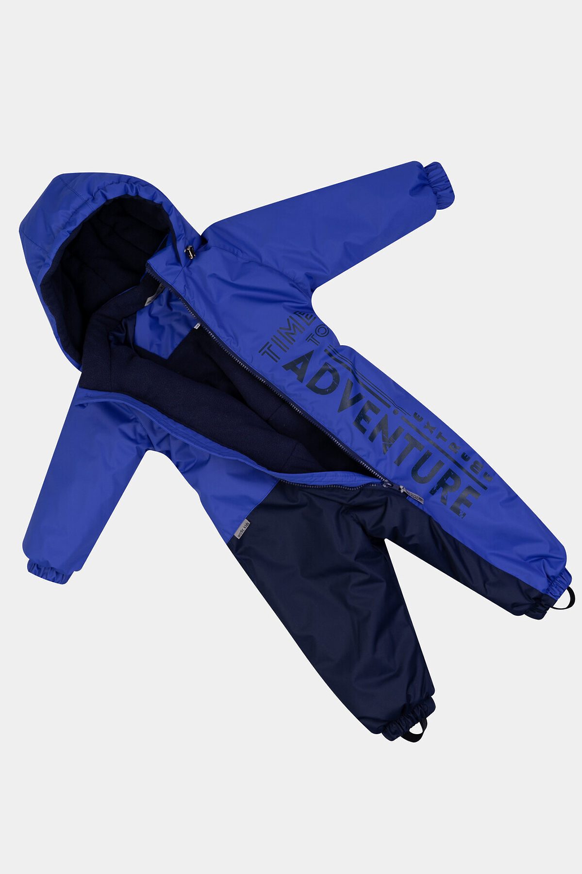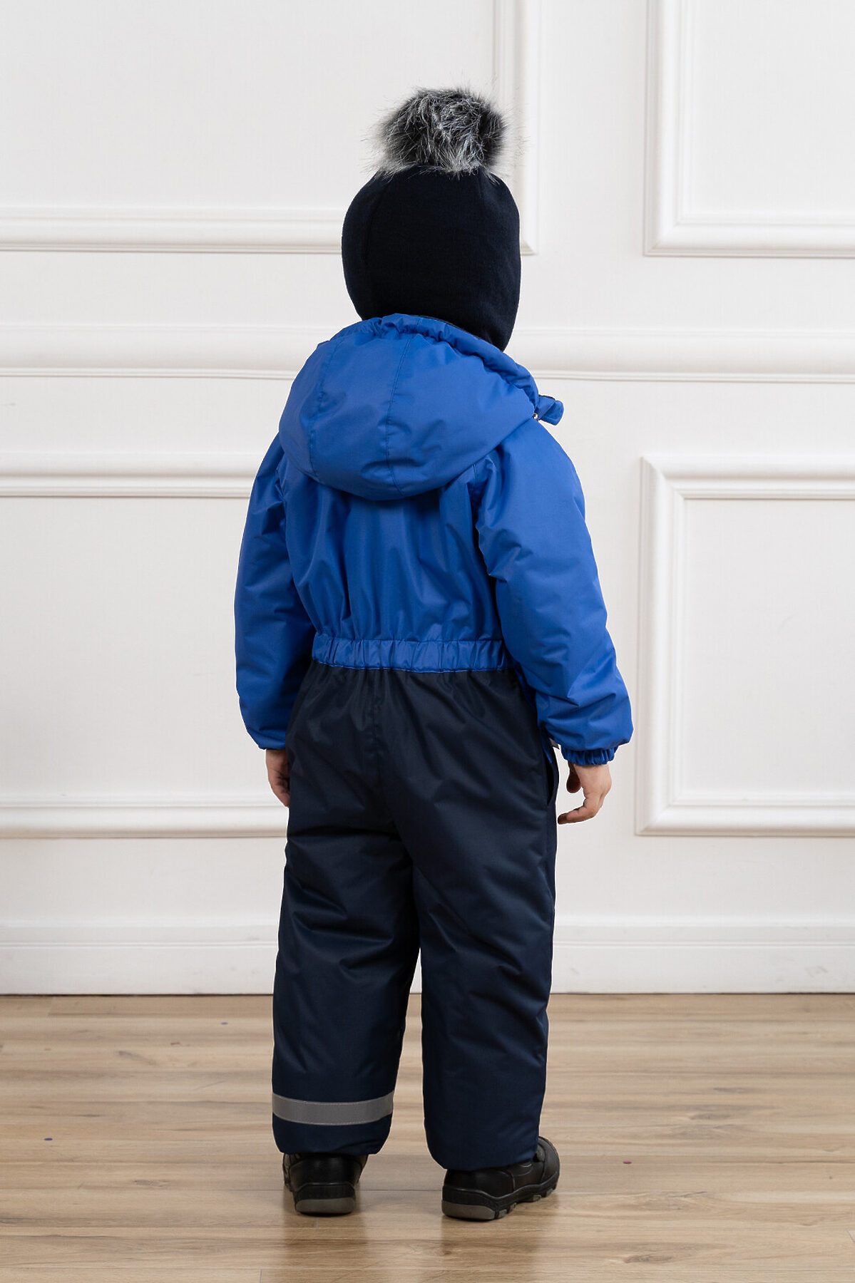 Комбинезон из мембраны и с утеплителем тинсулейном пригодится детям для прогулок зимой до -25 градусов. Подклад капюшона и основной части изделия сшит из тёплого флиса, в рукавах и в штанинах - подклад из таффеты. Комбинезон имеет утяжку в капюшоне, косую молнию, внутреннюю планку и чехол для бегунка на воротнике. Край рукавов оформлен манжетами с флисовым подкладом и с резинкой внутри. На штанинах есть штрипки и манжеты на резинке. Изделие выполнено с боковыми карманами, резинкой в области поясницы и с пуллером на бегунке. Комбинезон комбинированного синего и темно-синего цвета>