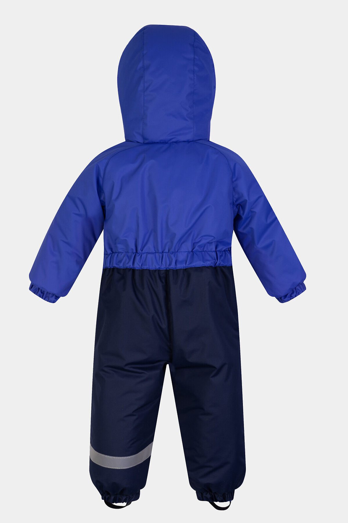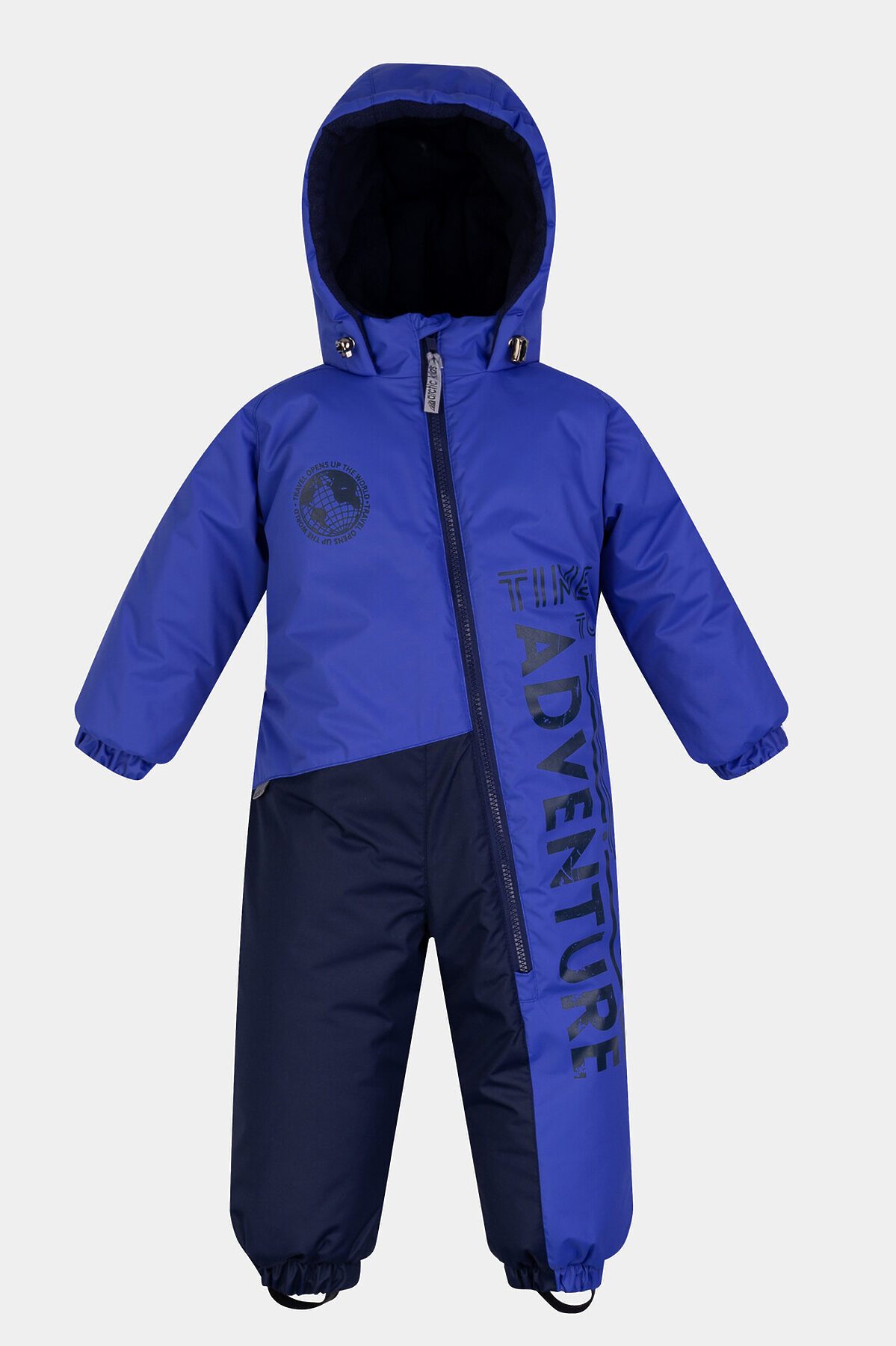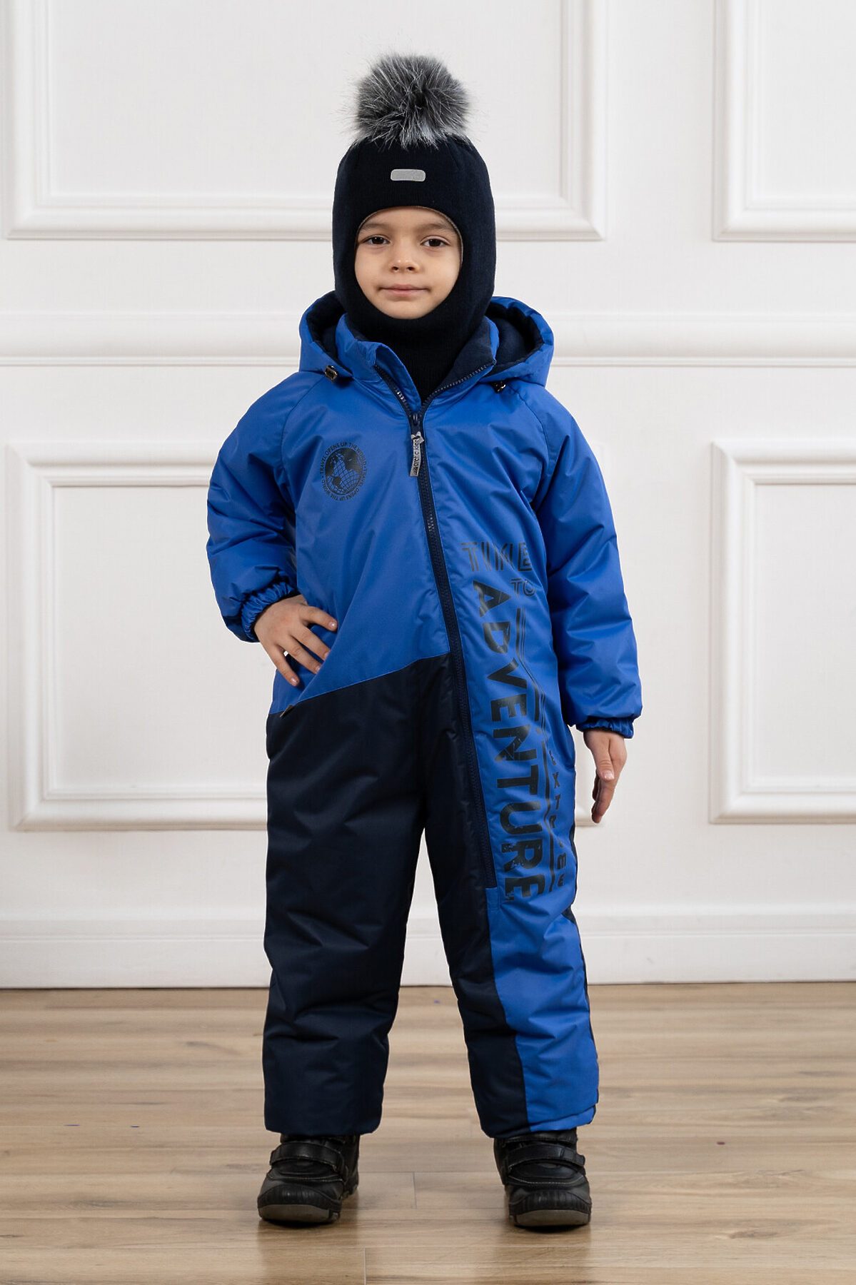 Комбинезон из мембраны и с утеплителем тинсулейном пригодится детям для прогулок зимой до -25 градусов. Подклад капюшона и основной части изделия сшит из тёплого флиса, в рукавах и в штанинах - подклад из таффеты. Комбинезон имеет утяжку в капюшоне, косую молнию, внутреннюю планку и чехол для бегунка на воротнике. Край рукавов оформлен манжетами с флисовым подкладом и с резинкой внутри. На штанинах есть штрипки и манжеты на резинке. Изделие выполнено с боковыми карманами, резинкой в области поясницы и с пуллером на бегунке. Комбинезон комбинированного синего и темно-синего цвета>