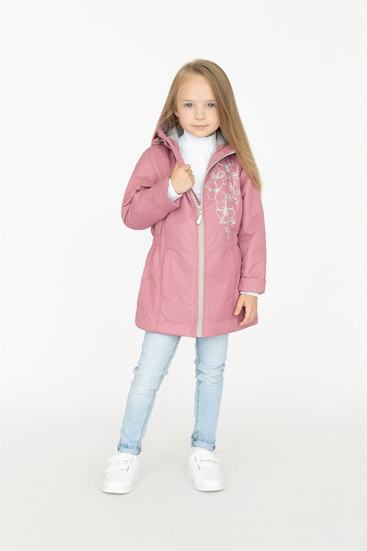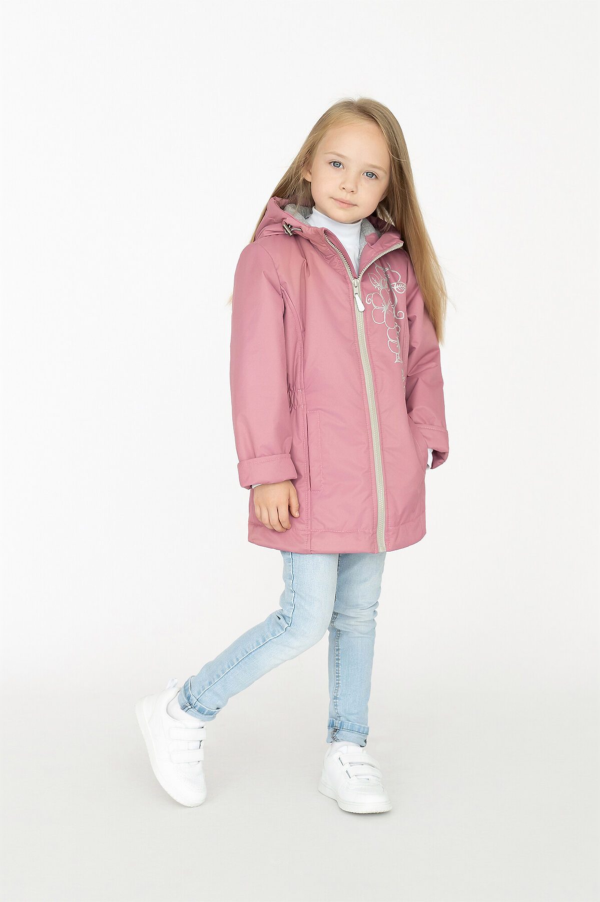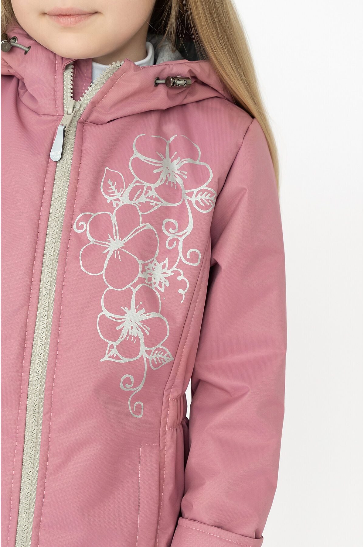 Детская демисезонная куртка для девочки пыльно-розового цвета. Несъемный капюшон, приталенный силуэт. Выполнена из однотонной мембраны. Утеплитель – тинсулейн 100гр/м2, хлопковая подкладка основной части, гладкая таффета в рукавах. Застежка молния, внутренняя ветрозащитная планка, высокий воротник с клапаном для бегунка. Капюшон регулируется фиксаторами. По бокам два кармана. Спереди и на спинке рисунок. >