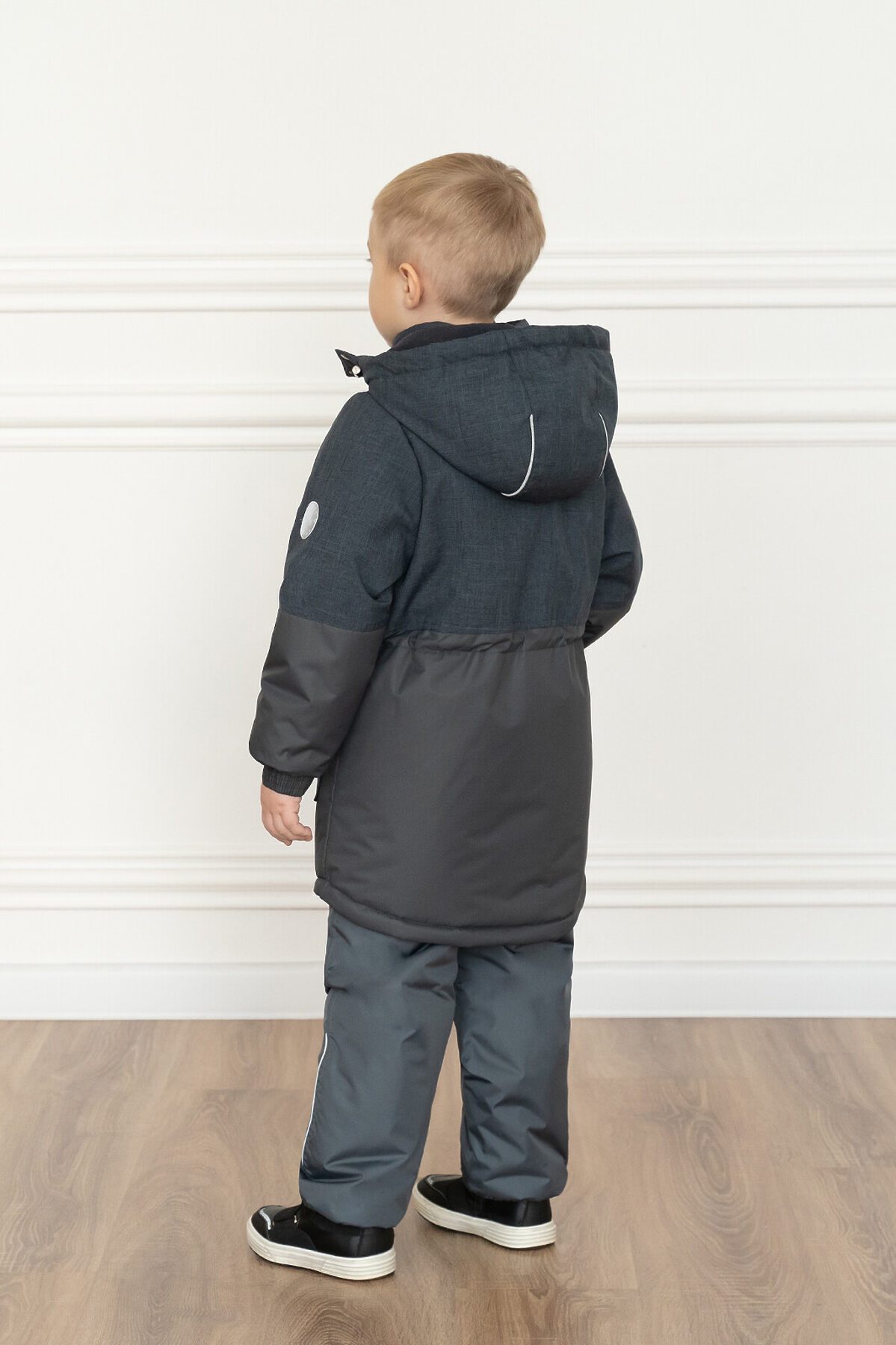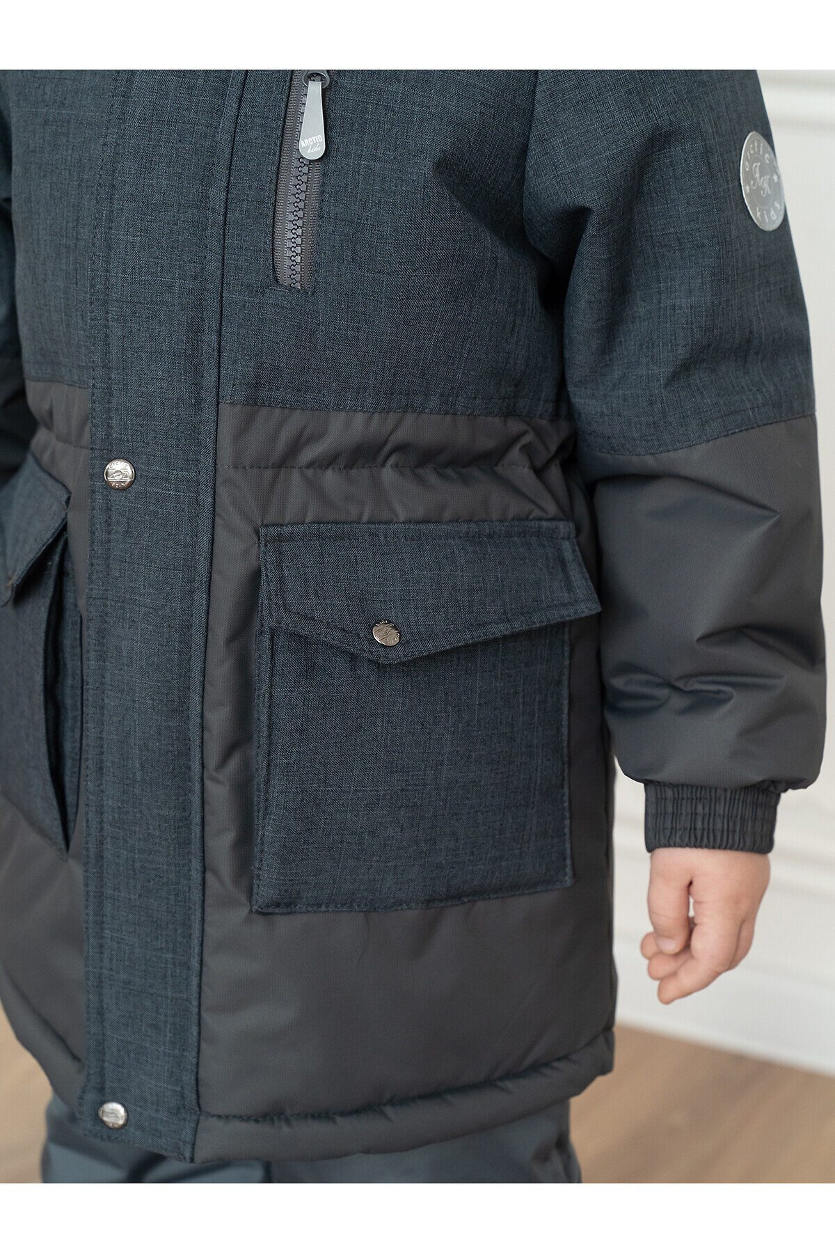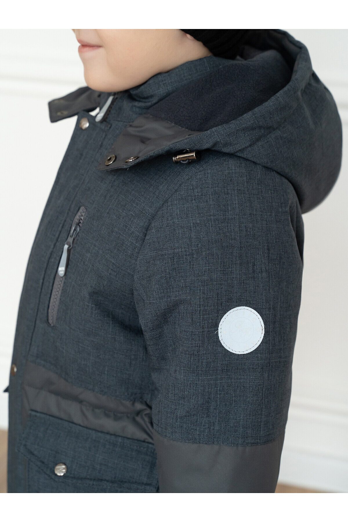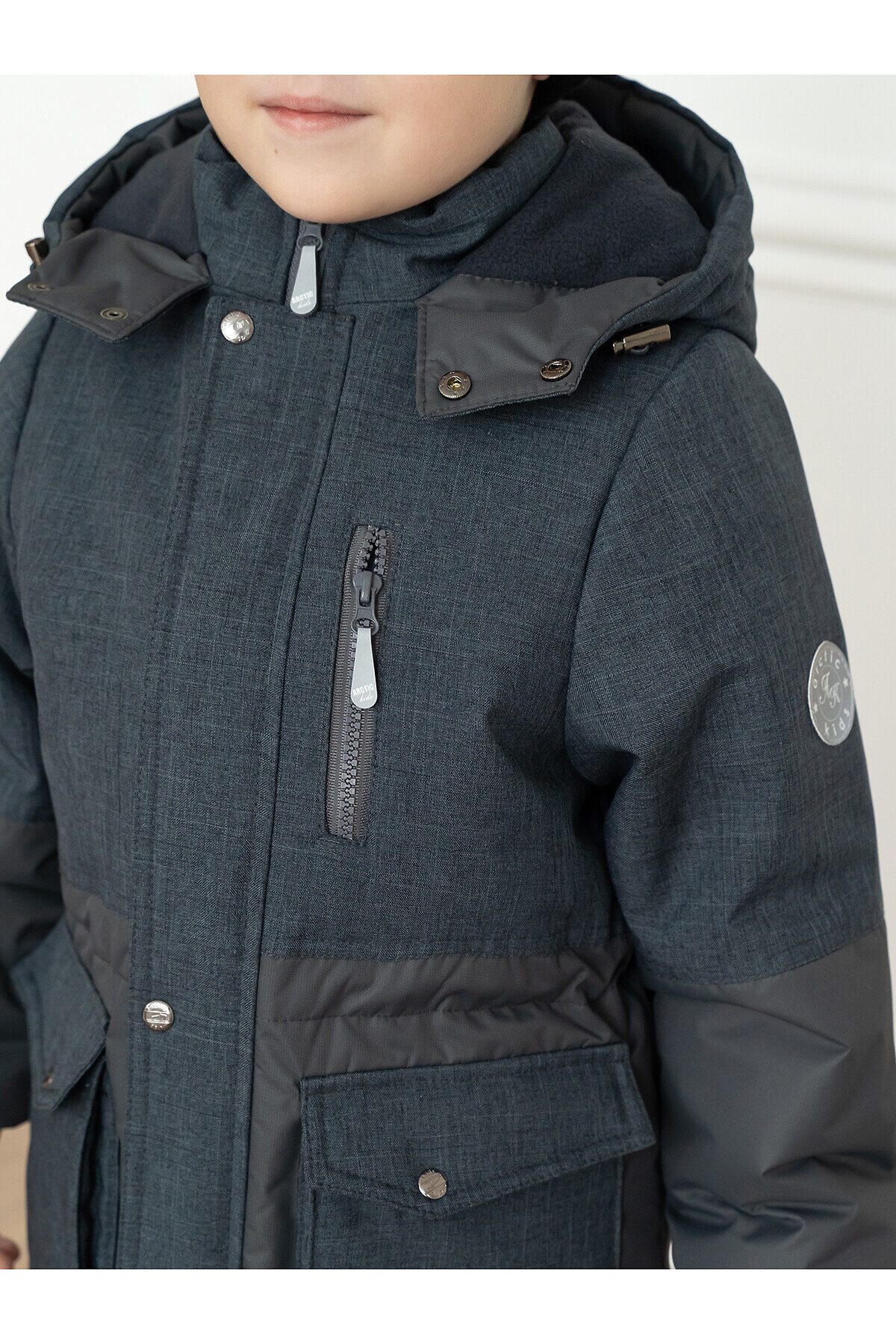 Детская зимняя мембранная удлиненная куртка цвета графит комбинированная. Несъемный глубокий капюшон с застежкой на кнопках, со светоотражающими полосами сзади. Для регулировки взята резинкой с фиксаторами. Высокий воротник. Застегивается на молнию. Внутренняя и внешняя ветрозащитная планка с кнопками. Защитный клапан для бегунка молнии. Один нагрудный каhман на молнии. Два накладных кармана с клапанами снизу. По талии внутренняя кулиска для уменьшения объема с фиксаторами. Подклад до половины основной части и в капюшоне - мягкий флис. Нижняя часть и рукава подкладка из таффеты. По низу рукавов манжеты-резинки. По верху одного из рукавов светоотражающая нашивка. >