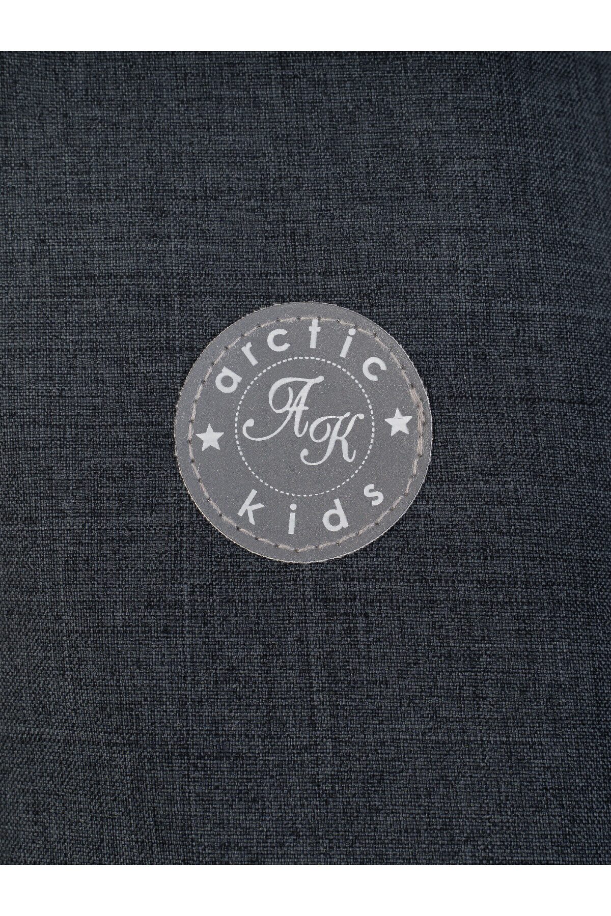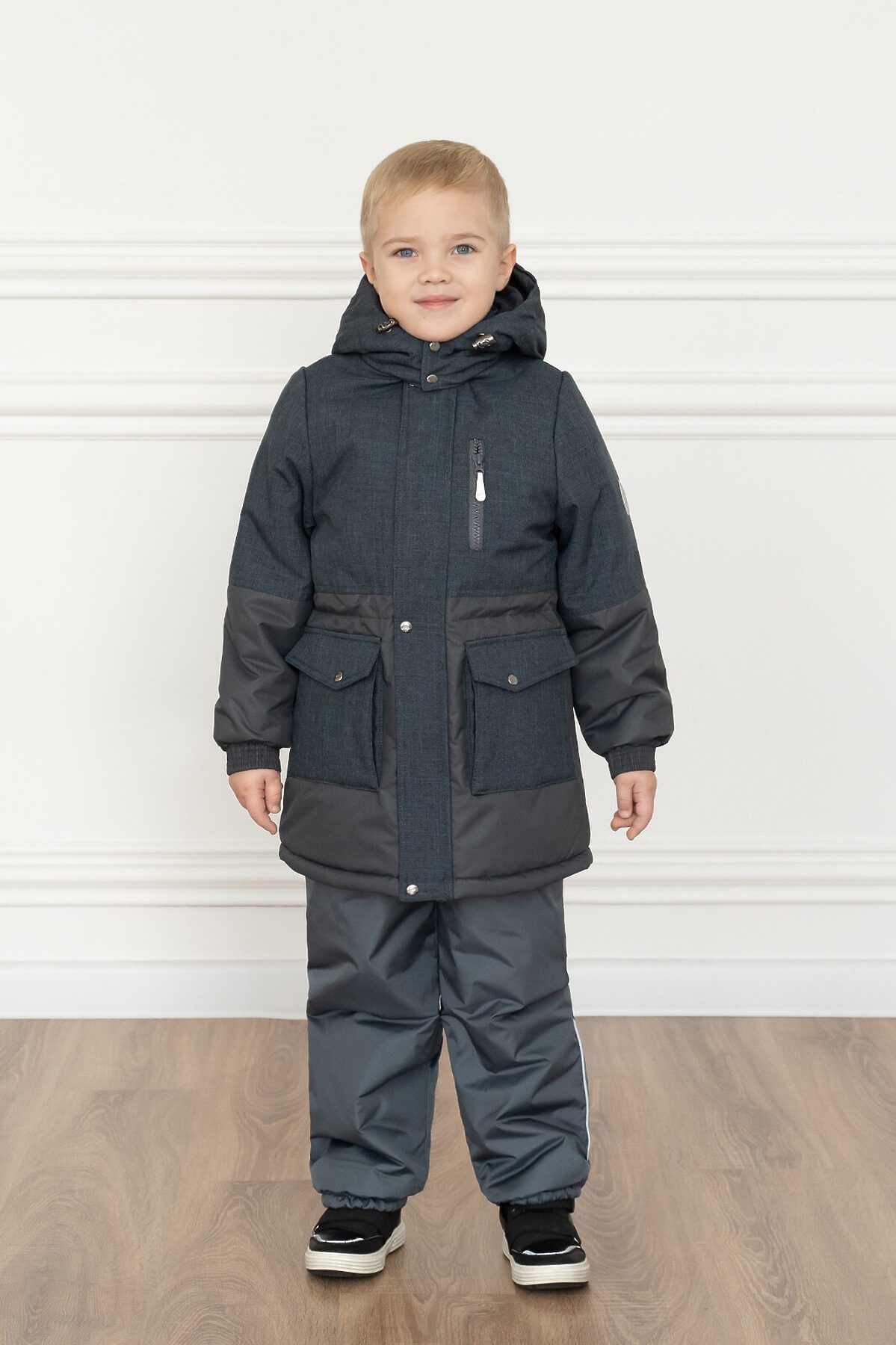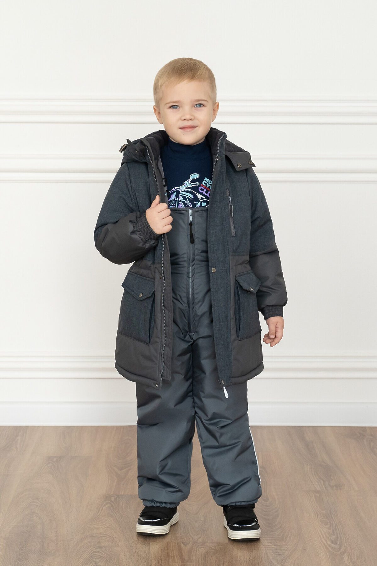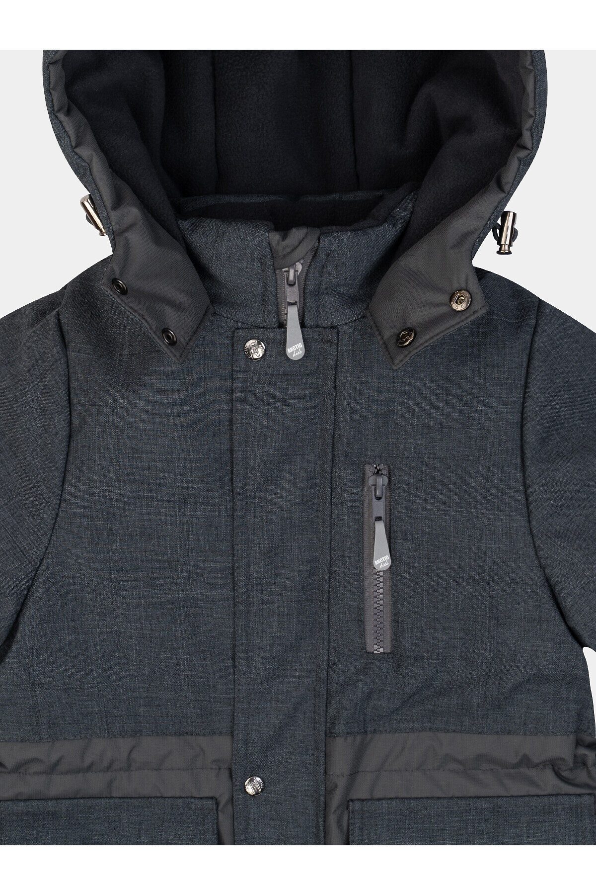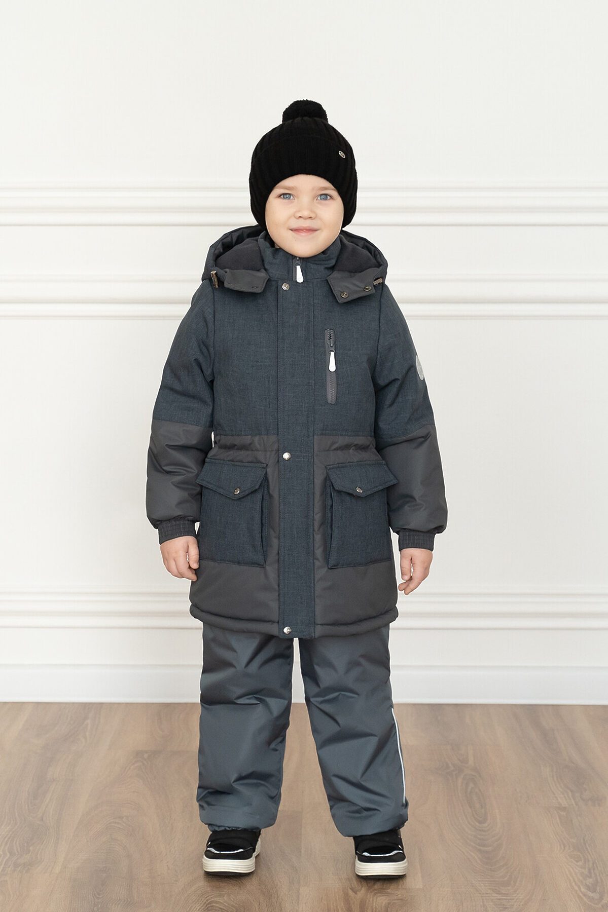 Детская зимняя мембранная удлиненная куртка цвета графит комбинированная. Несъемный глубокий капюшон с застежкой на кнопках, со светоотражающими полосами сзади. Для регулировки взята резинкой с фиксаторами. Высокий воротник. Застегивается на молнию. Внутренняя и внешняя ветрозащитная планка с кнопками. Защитный клапан для бегунка молнии. Один нагрудный каhман на молнии. Два накладных кармана с клапанами снизу. По талии внутренняя кулиска для уменьшения объема с фиксаторами. Подклад до половины основной части и в капюшоне - мягкий флис. Нижняя часть и рукава подкладка из таффеты. По низу рукавов манжеты-резинки. По верху одного из рукавов светоотражающая нашивка. >