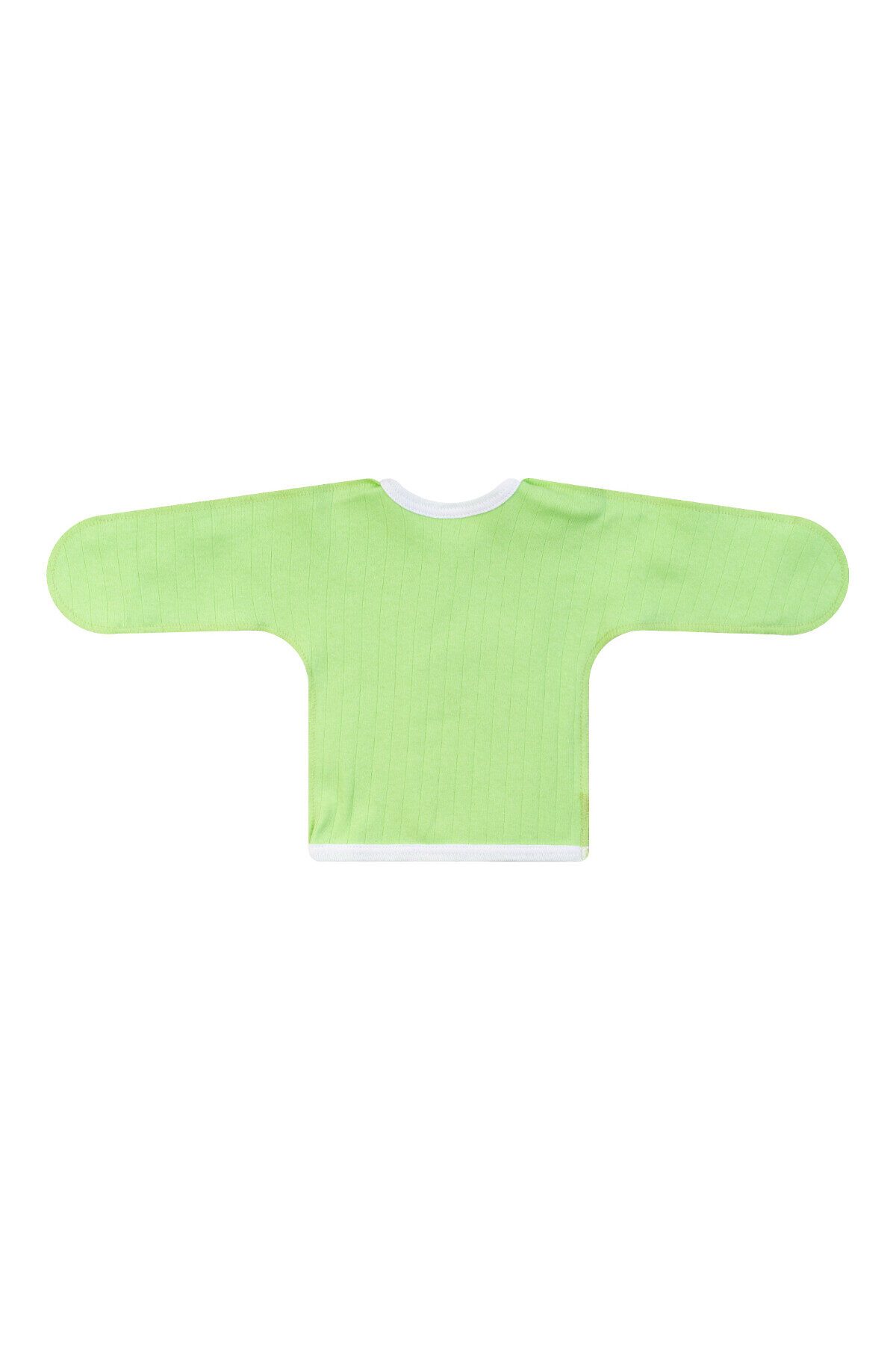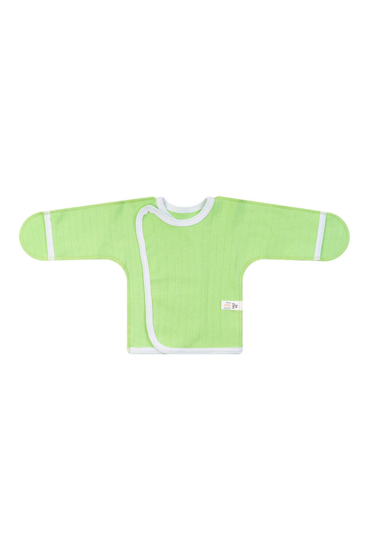 Мягкий, гладкий на ощупь, эластичный трикотаж салатового цвета. Особенности модели: кофточка-распашонка. Сшита швами наружу. По краю обработана трикотажной бейкой. Кнопка-застёжка спереди. На рукавах клапаны для открытого или закрытого положения рук. >