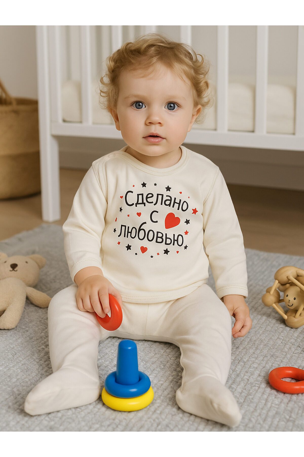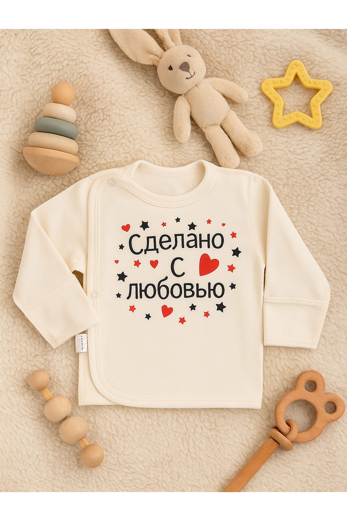 Тонкий, дышащий, приятный к телу трикотаж. Ясельная трикотажная распашонка с длинными рукавами. Сшита швами наружу. Застёгивается спереди на клёпки. На рукавах клапаны для открытого/закрытого положения рук. Край обработан трикотажной бейкой. Спереди надпись "Сделано с любовью" >