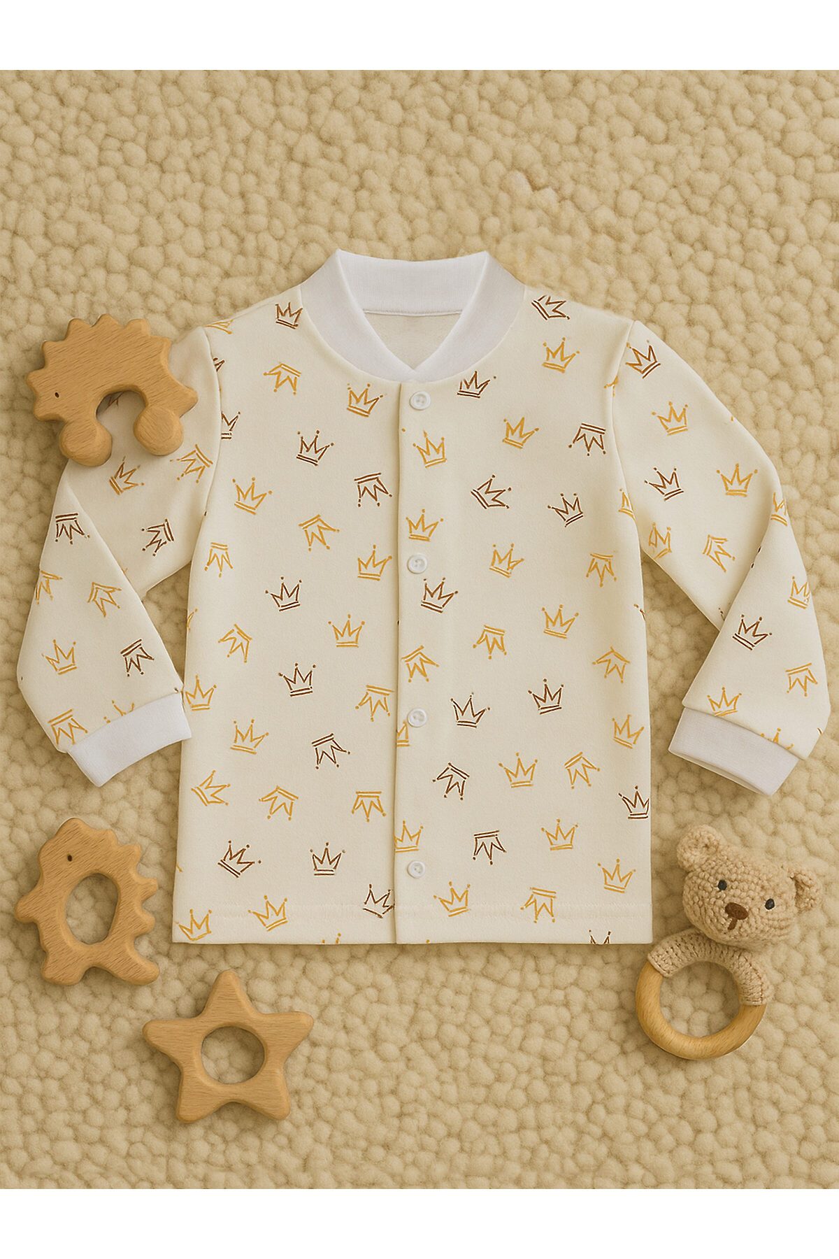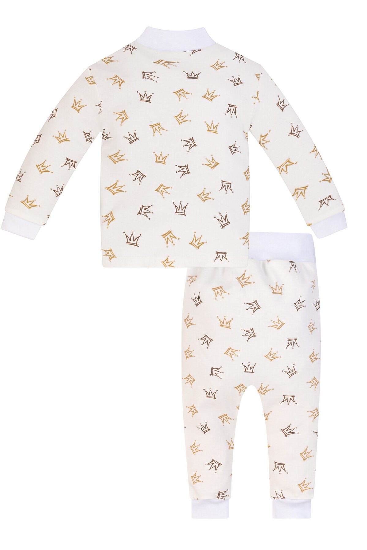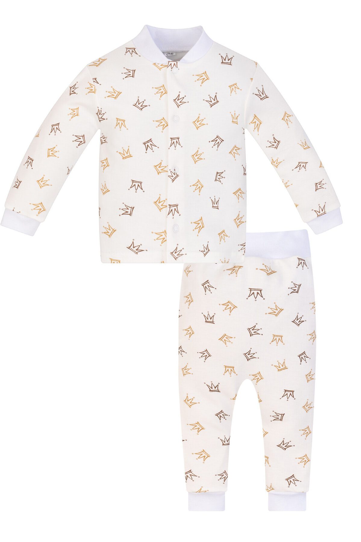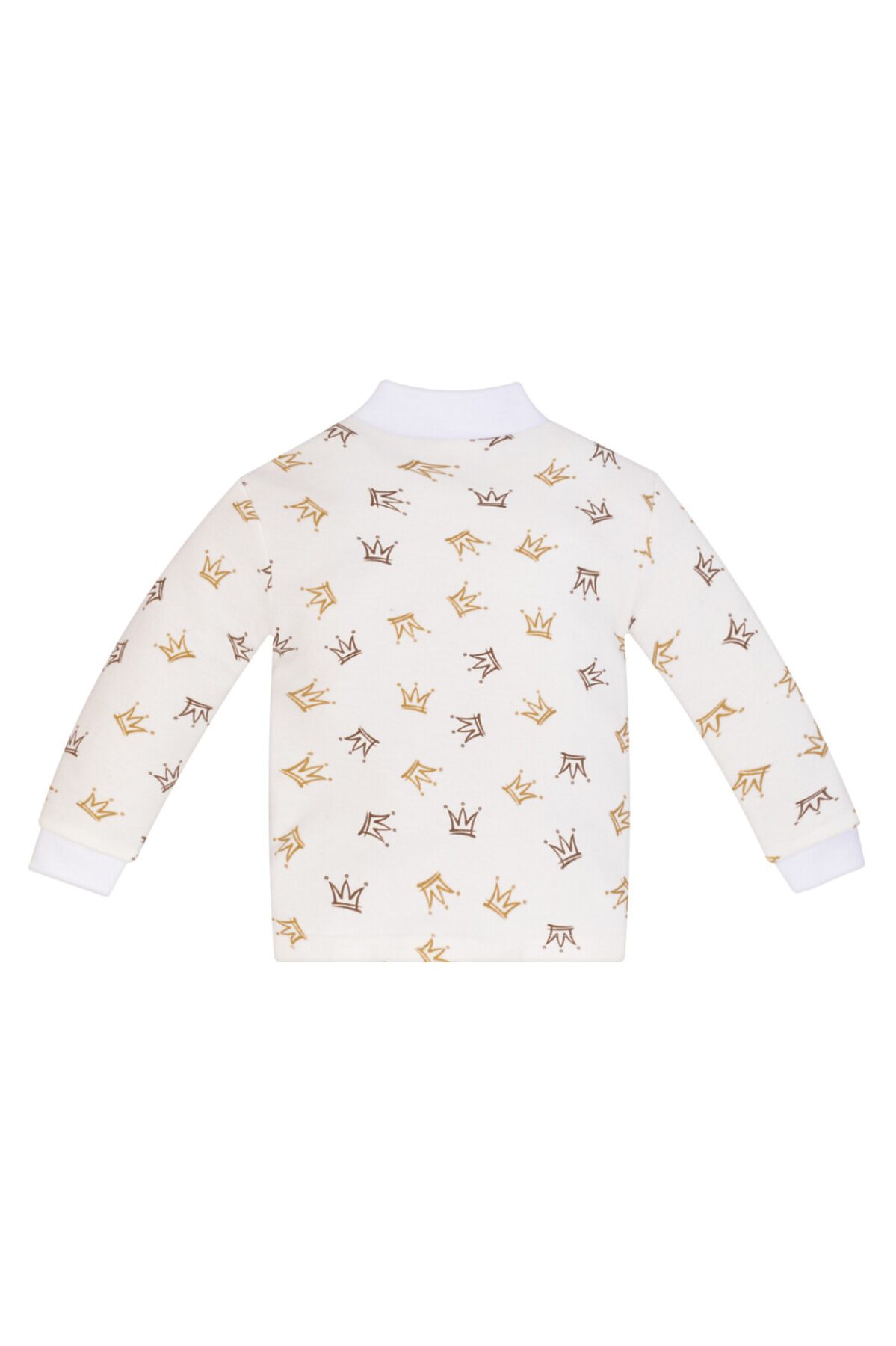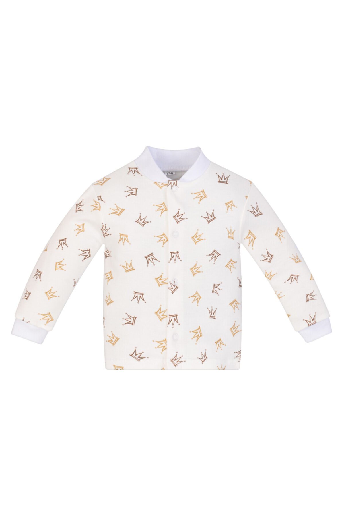 Ясельная кофточка для малышей с длинными рукавами на манжете из приятного к телу, мягкого износостойкого трикотажа молочного цвета, рисунок короны. Воротник-стойка. Застёжка спереди на кнопки.
