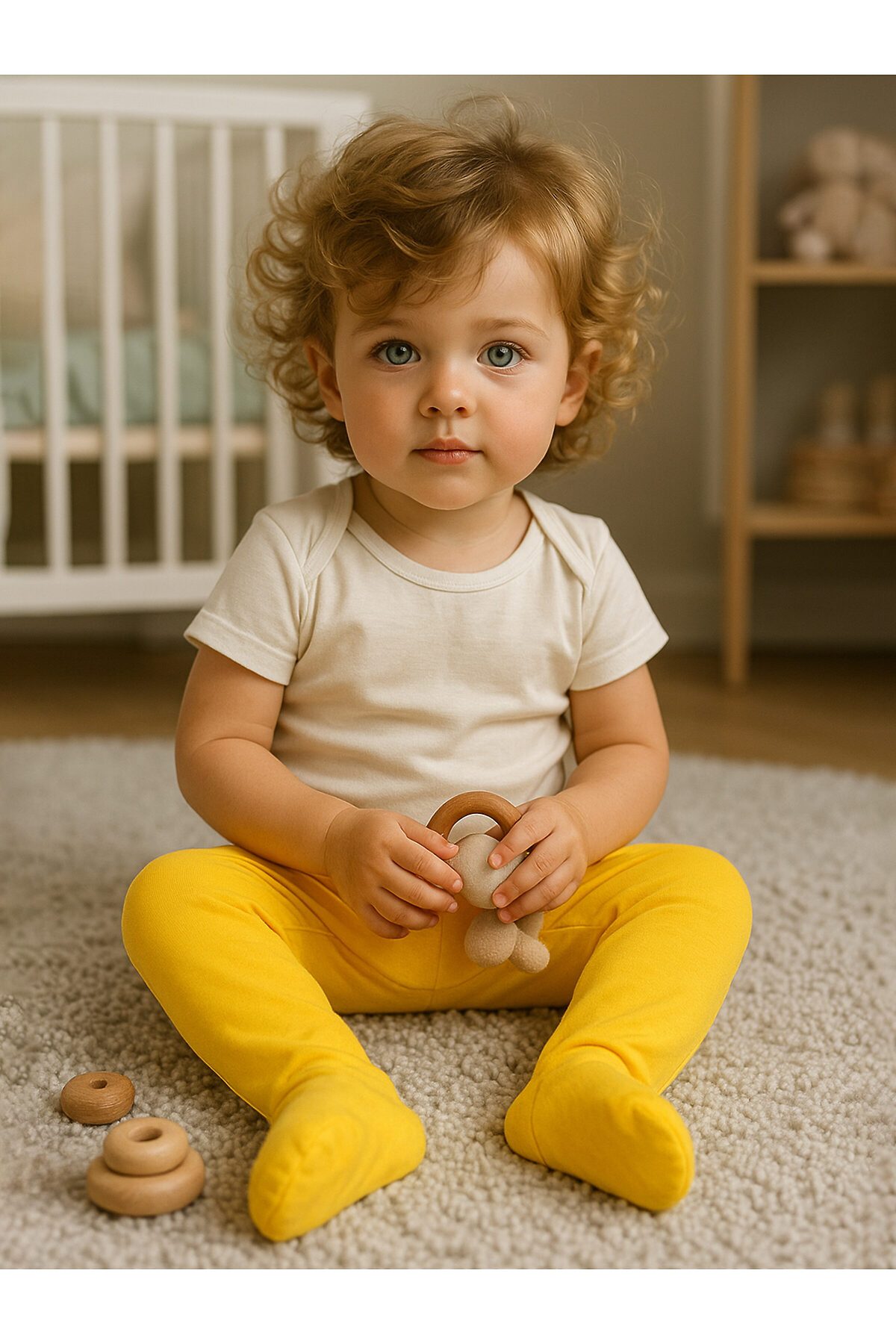 Классические ползунки для малышей с закрытой лапкой. Пригодятся для каждодневной носки в первые месяцы жизни. Ползуночки изготовлены из мягкой, гладкой хлопковой ткани кулирного полотна желтого цвета. Все швы бережно оверложены деликатными нитками, а в поясок ползунков вставлена тонкая резиночка. >