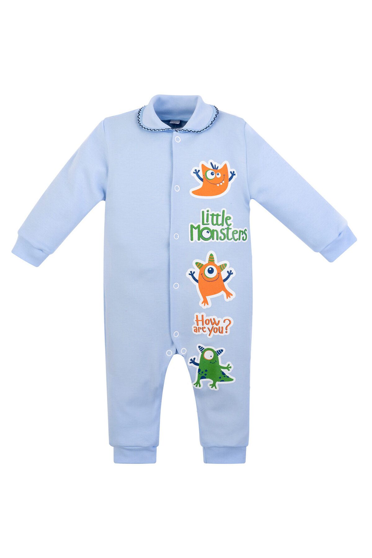 Трикотажный ясельный комбинезон пригодится малышам для носки в прохладные дни. Модель выпускается из гладкого и мягкого на ощупь интерлока. Изделие имеет отложной округлый воротничок, закрытые стопы на штанинах и манжеты на рукавах. Прочные кнопки-застёжки проходят по передней стороне комбинезона. >