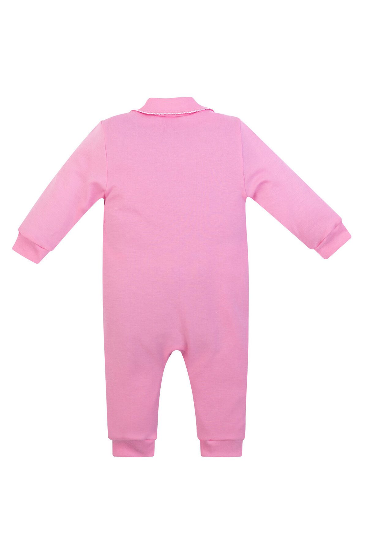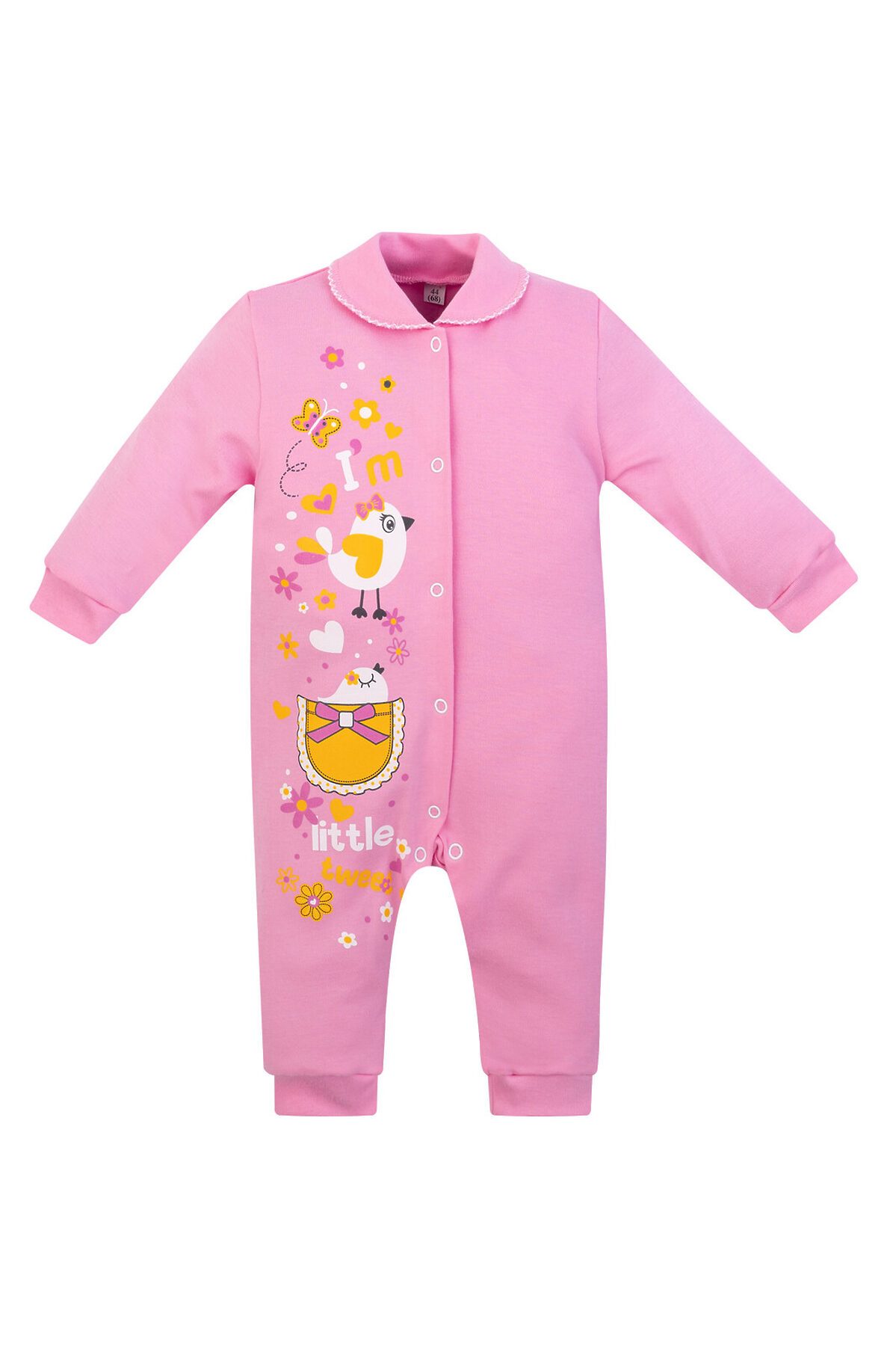 Трикотажный ясельный комбинезон пригодится малышам для носки в прохладные дни. Модель выпускается из гладкого и мягкого на ощупь интерлока розового цвета. Изделие имеет отложной округлый воротничок, открытые ножки, на штанинах и на рукавах манжеты. Прочные кнопки-застёжки проходят по передней стороне комбинезона. На одной половинке спереди принт поющие птички >