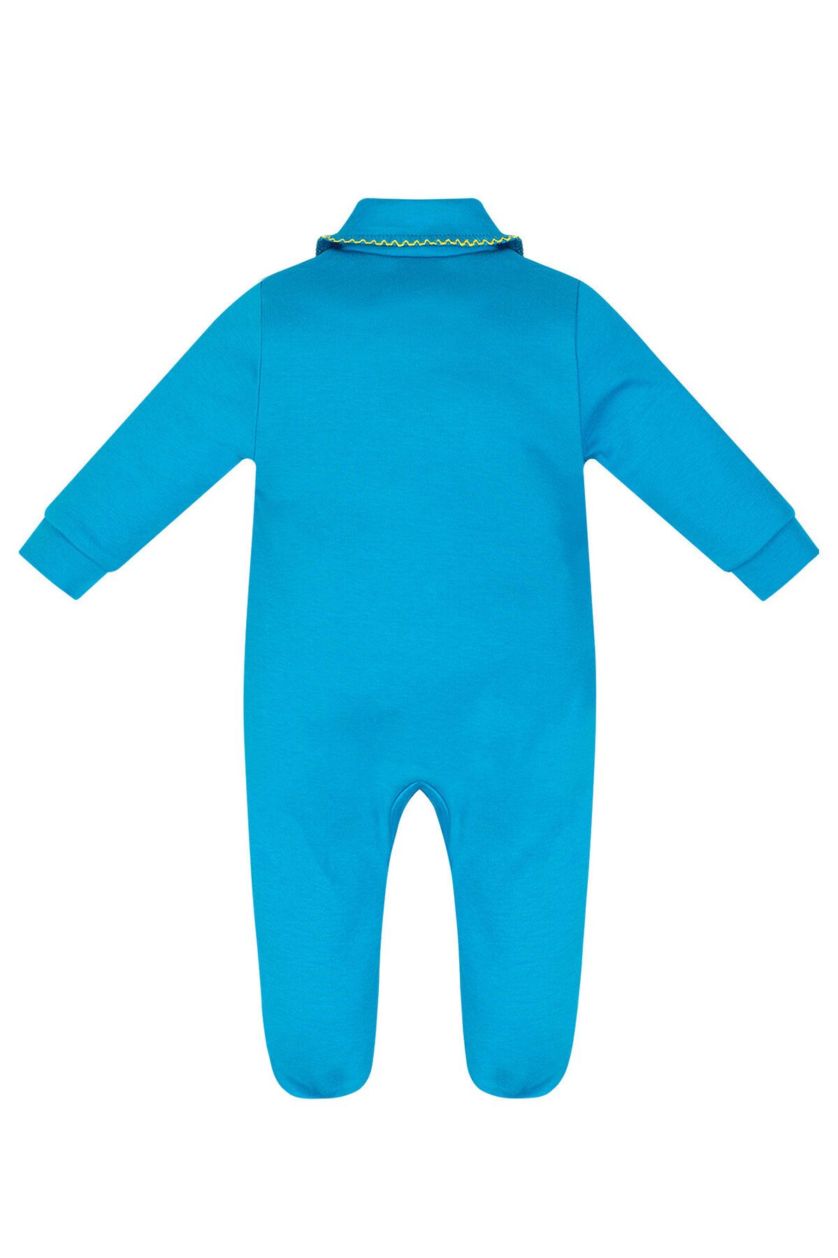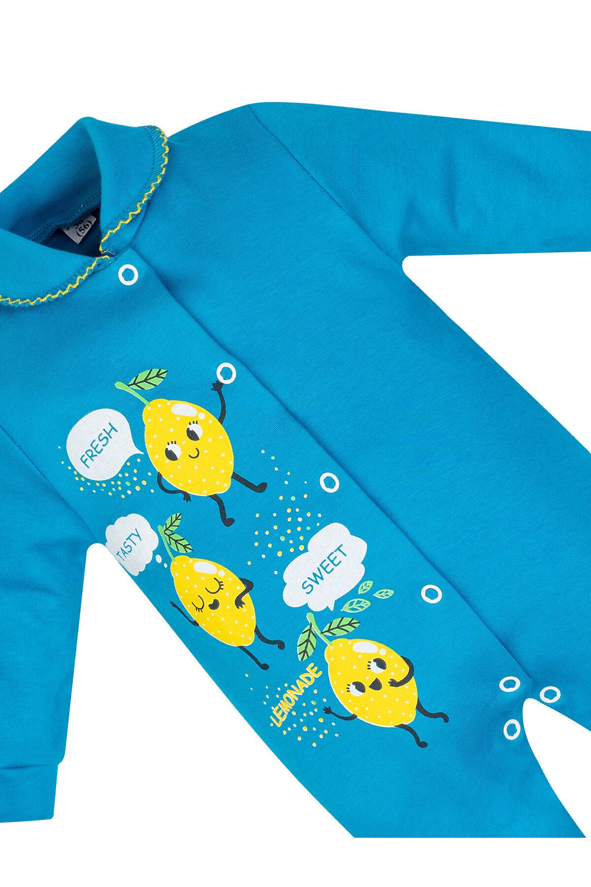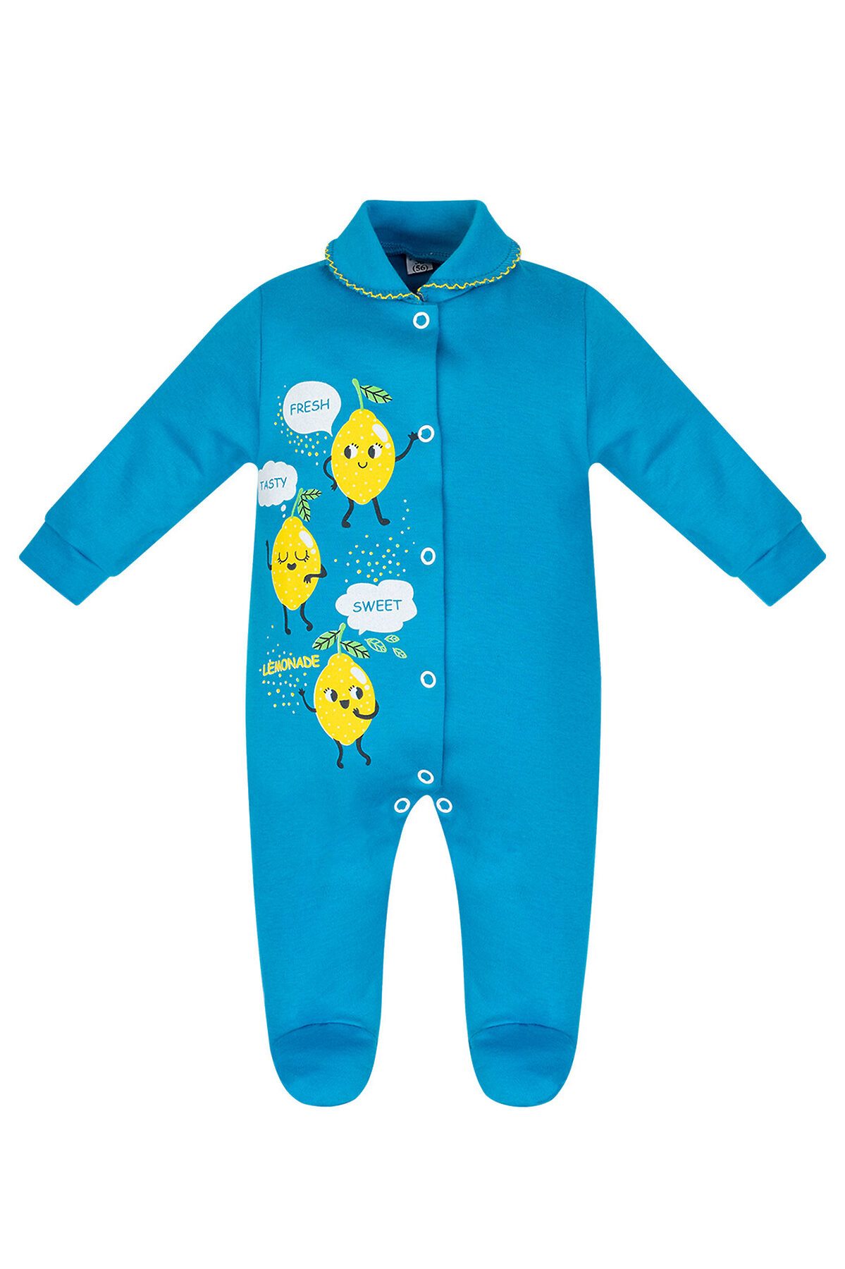 Трикотажный ясельный комбинезон пригодится малышам для носки в прохладные дни. Модель выпускается из гладкого и мягкого на ощупь интерлока бирюзового цвета с принтом лимоны. Изделие имеет отложной округлый воротничок, закрытые стопы на штанинах и манжеты на рукавах. Прочные кнопки-застёжки проходят по передней стороне комбинезона. >