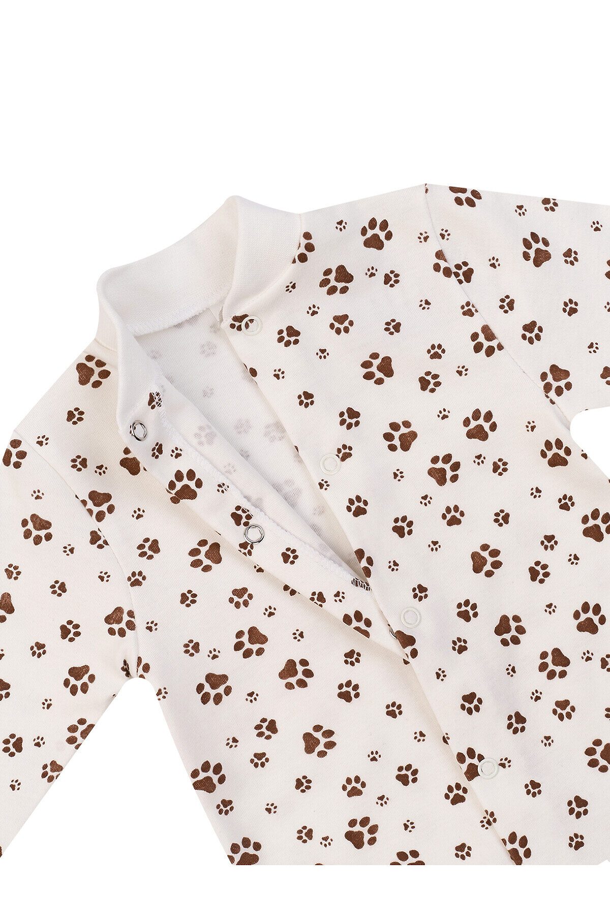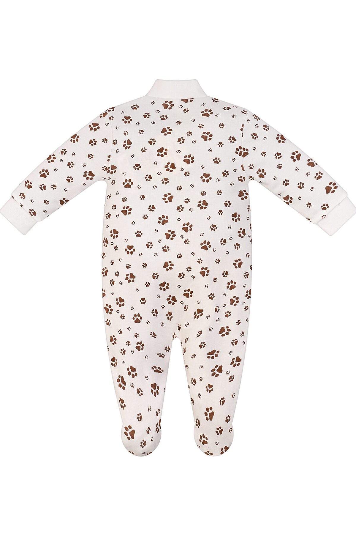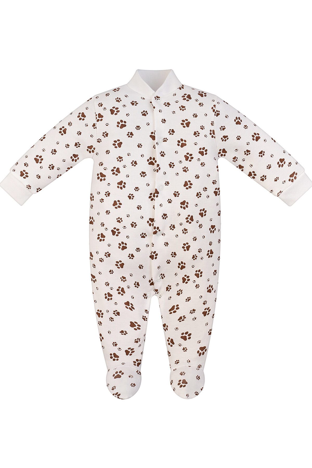 Мягкий на ощупь, приятный к телу, эластичный трикотаж. Особенности модели: Ясельный комбинезон с закрытыми ножками молочного цвета с принтом лапки. Манжеты на рукавах. Мягкий воротник-стойка. Ластовица. Клёпки-застёжки спереди. >