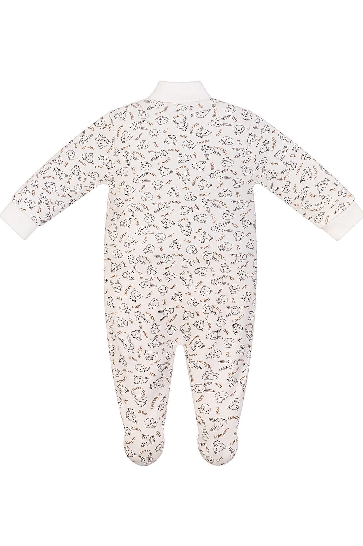 Мягкий на ощупь, приятный к телу, эластичный трикотаж молочного цвета с принтом зайчики. Особенности модели: Ясельный комбинезон с закрытыми ножками. Манжеты на рукавах. Мягкий воротник-стойка. Ластовица. Клёпки-застёжки спереди. >