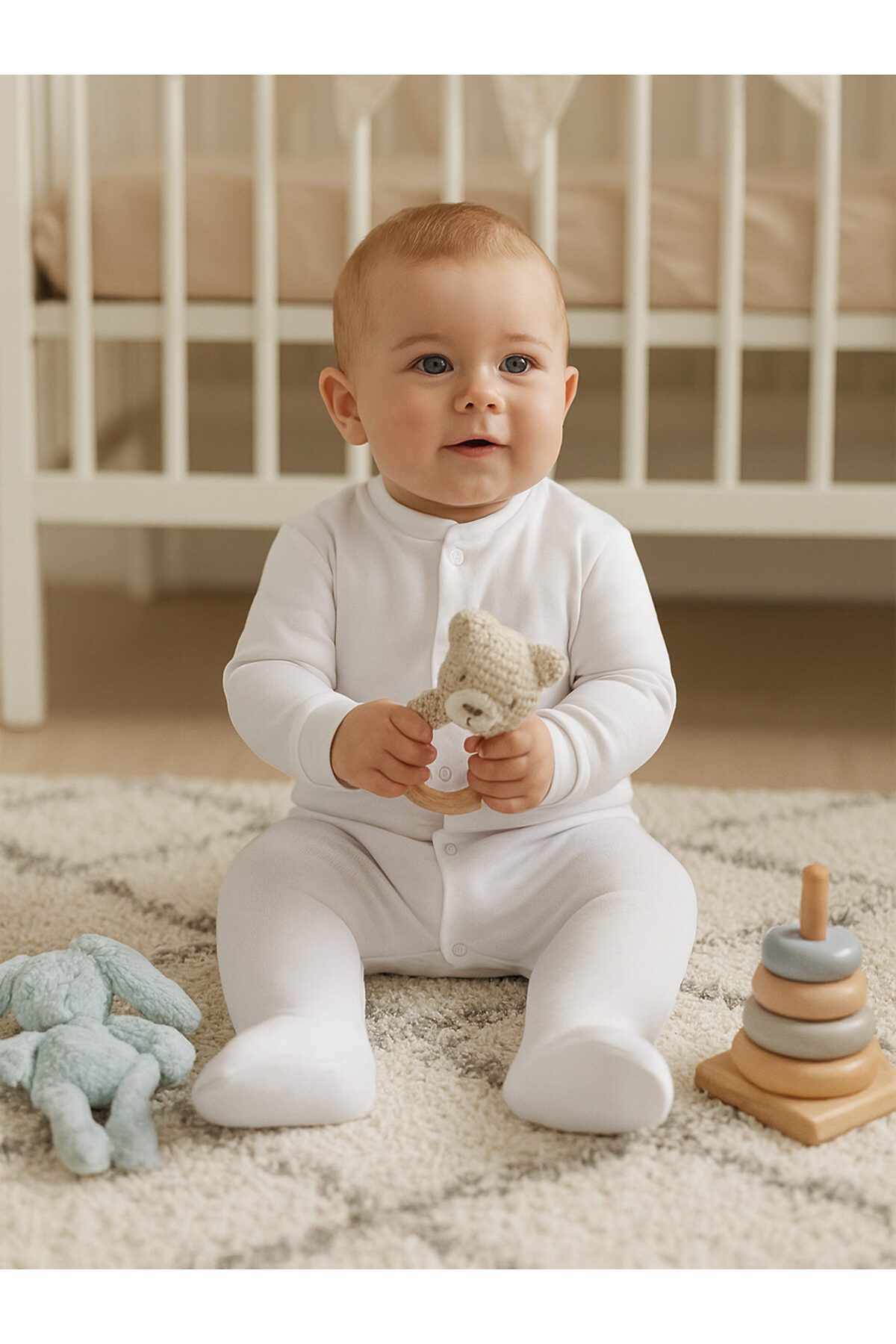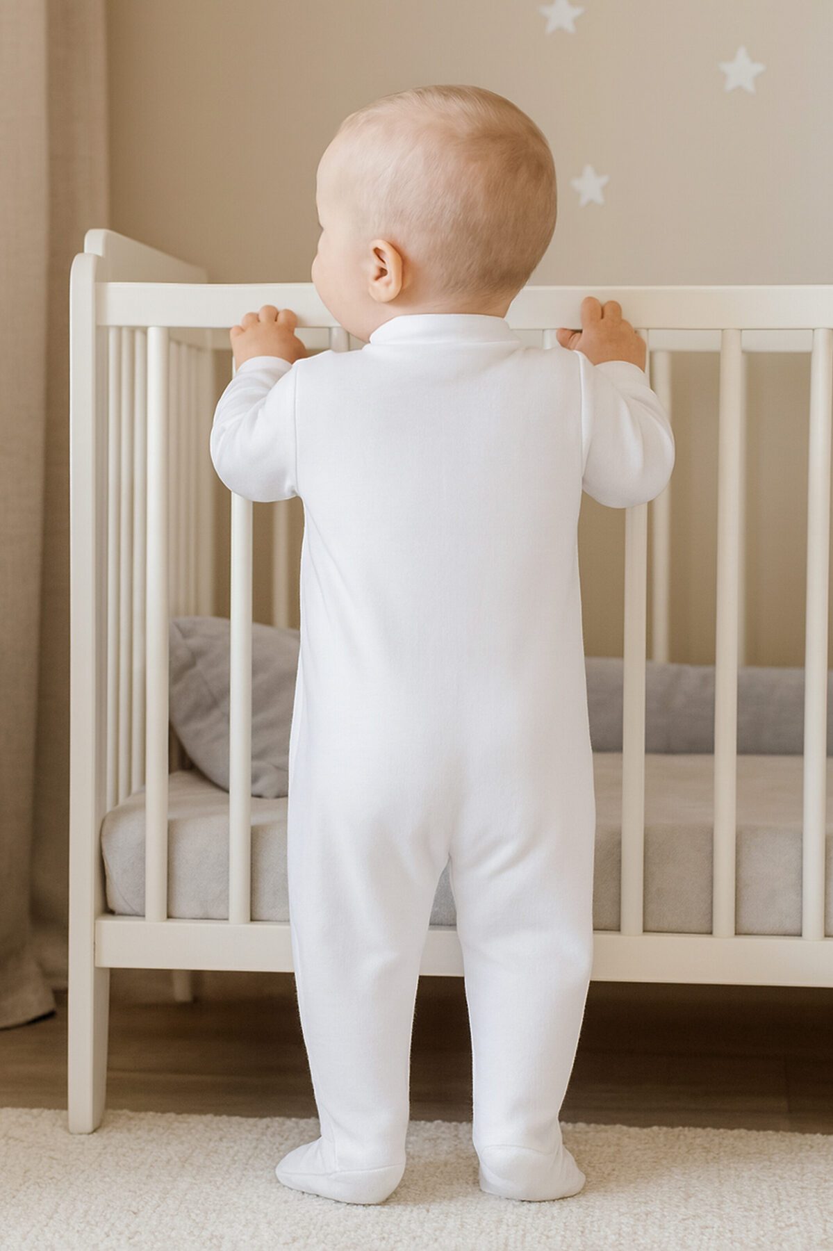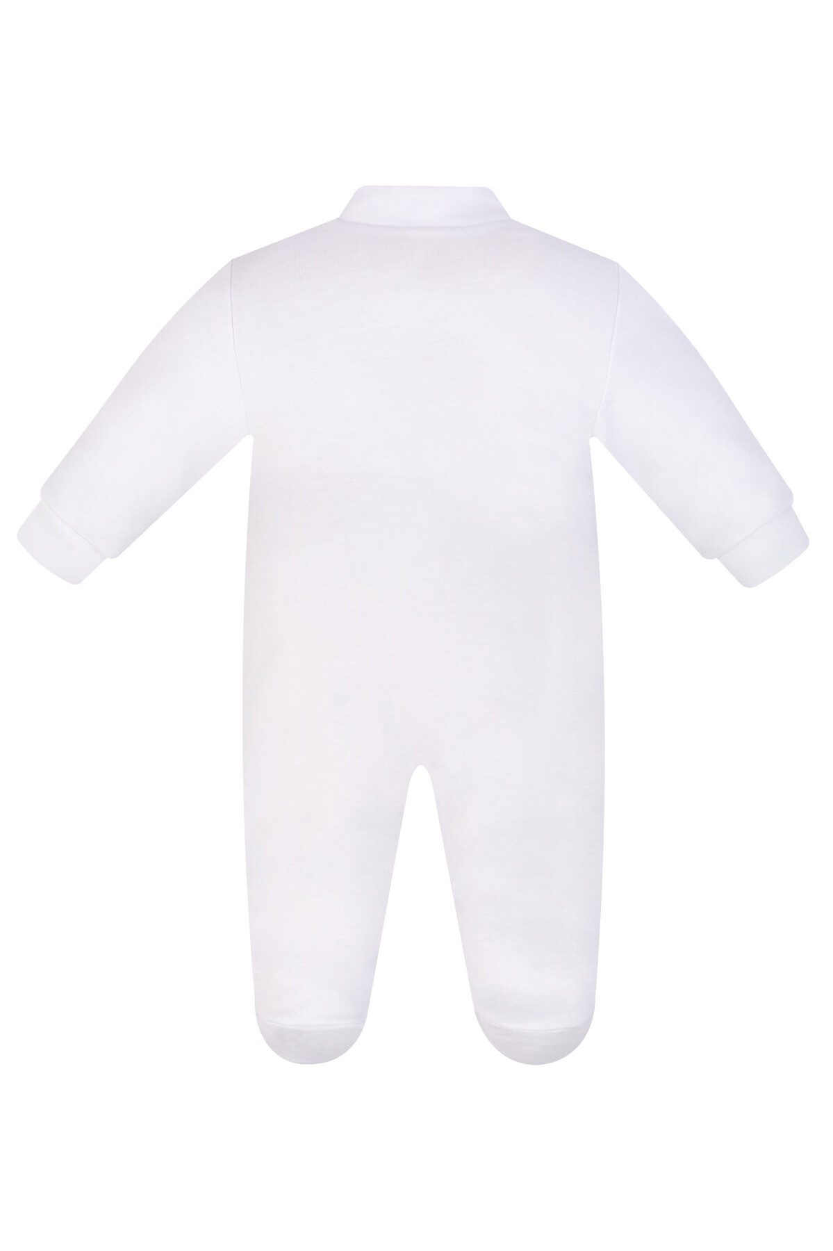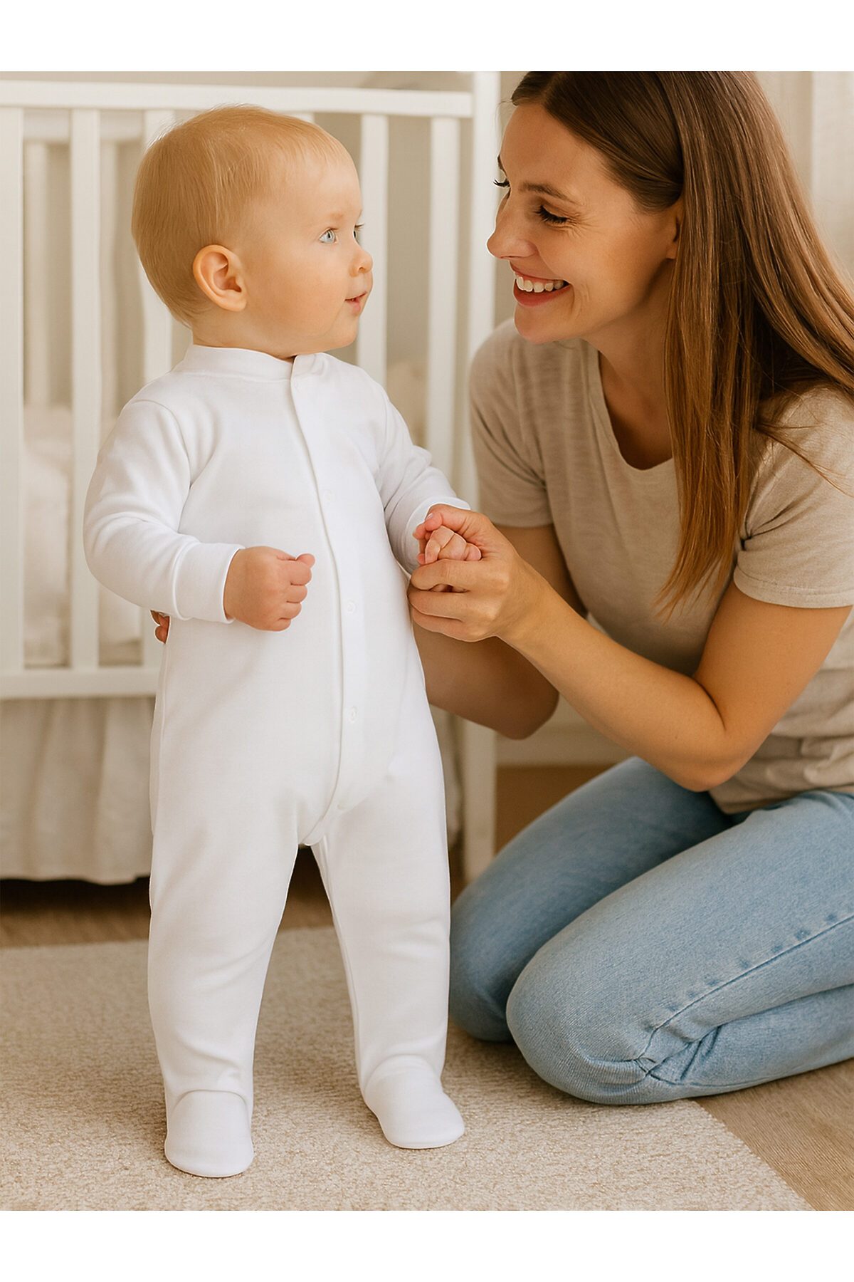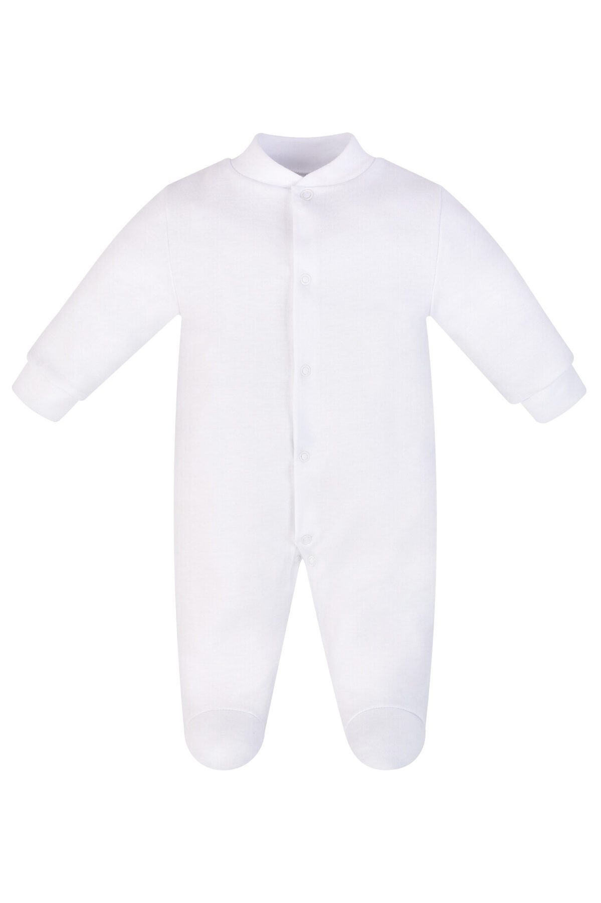 Мягкий на ощупь, приятный к телу, дышащий трикотаж. Особенности модели: трикотажный ясельный комбинезон для детей белого цвета. На рукавах мягкие манжеты, мягкий воротник-стойка. Застежка на кнопки спереди. Закрытые ножки >