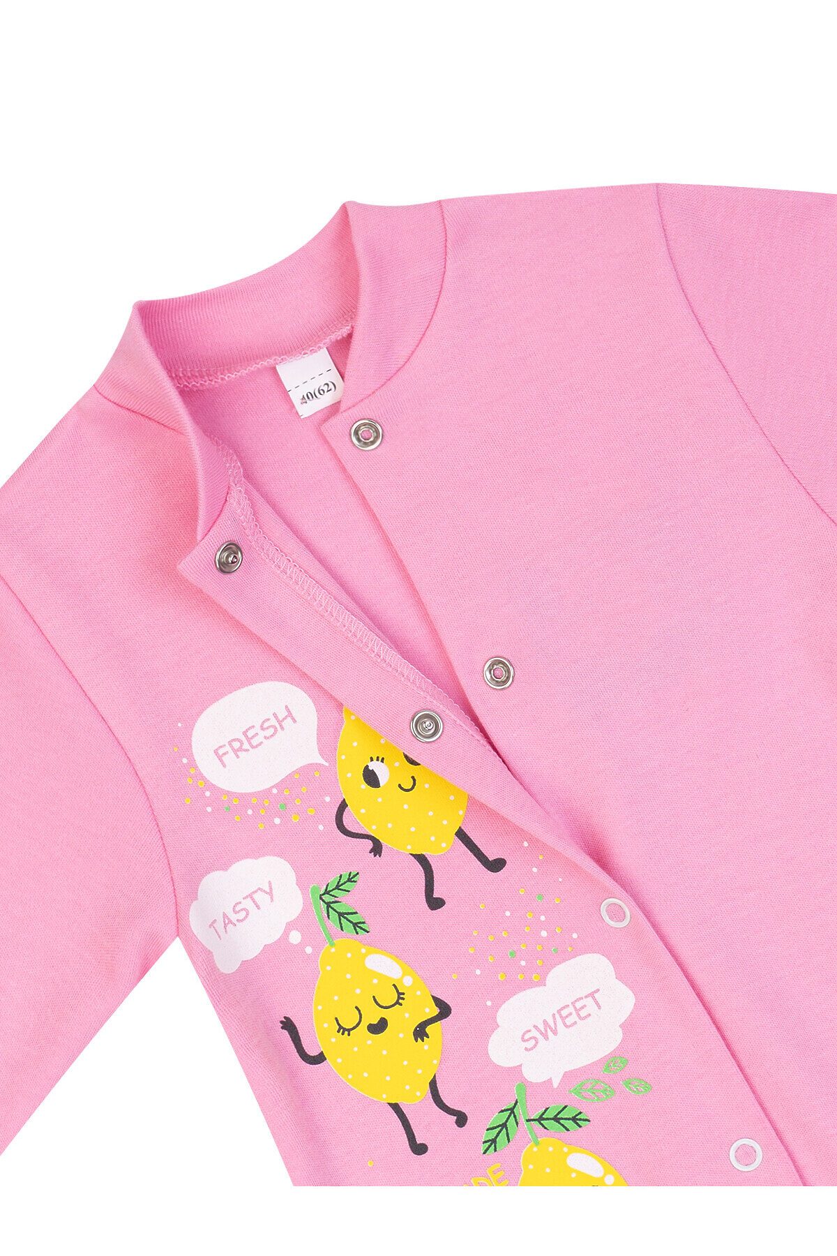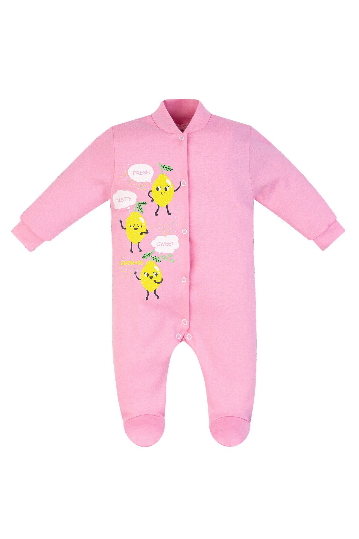 Превосходный трикотажный комбинезон с закрытыми ножками очень удобно использовать в нежаркие деньки. Комбинезончик выполнен из высококачественного хлопкового интерлока розового цвета, весьма нежненького, приятного и мягкого. Открытые длинные рукава оформлены эластичными манжетами, а воротничок-стойка изготовлен из такого же материала. От горловины и до проймы ножек проходит удобная застёжка в виде кнопочек. Спереди принт лимончики и надписи. >