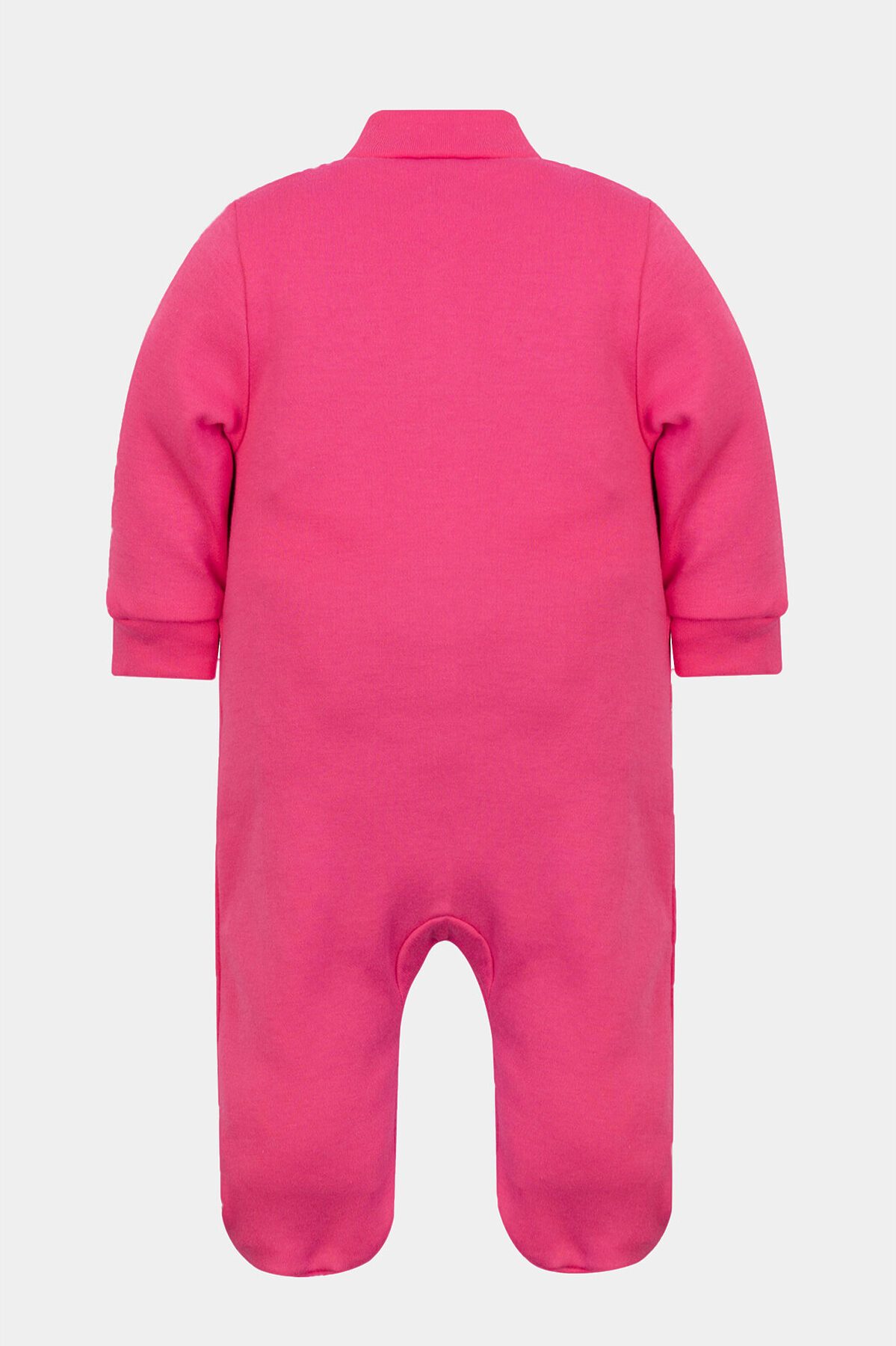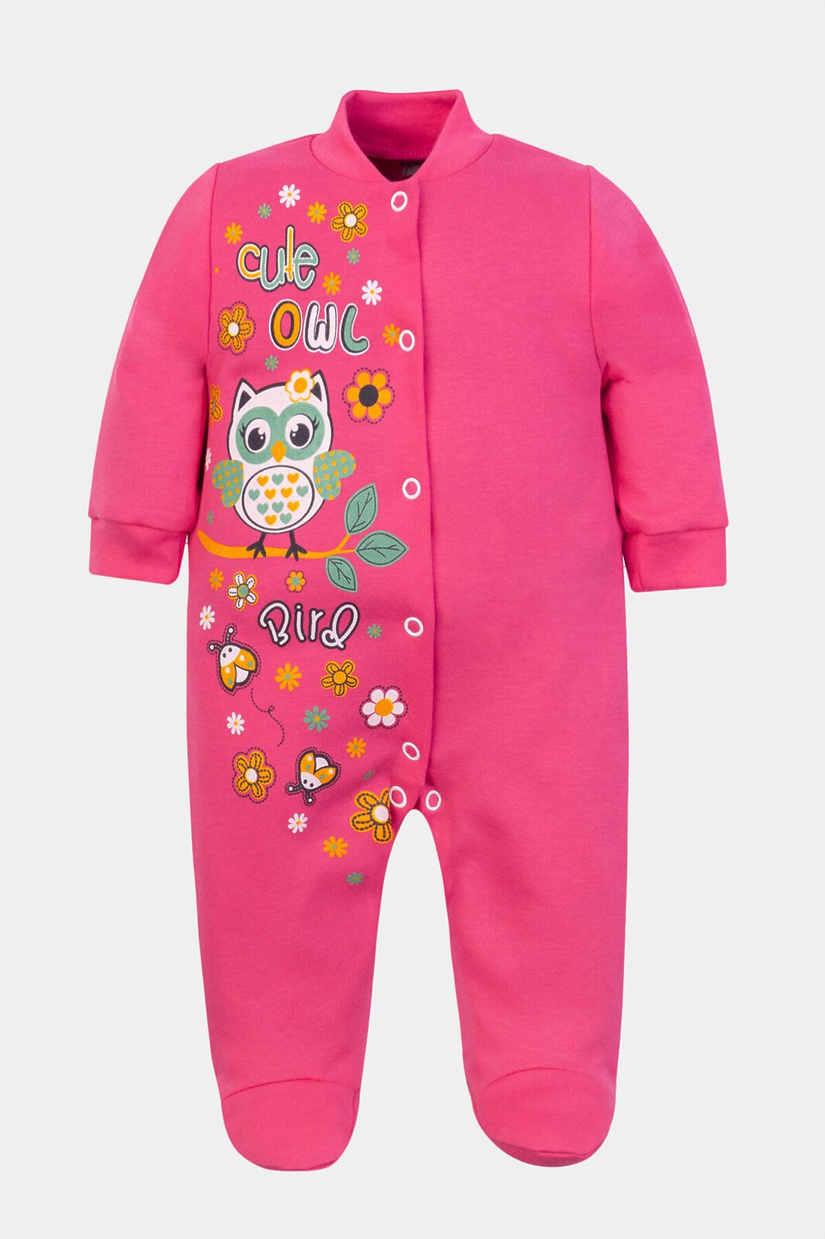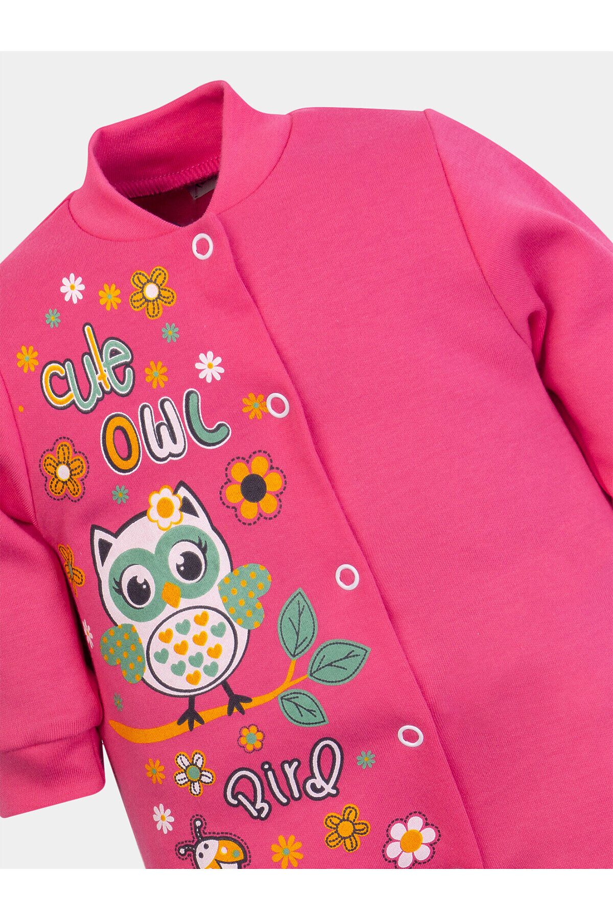Превосходный трикотажный комбинезон с закрытыми ножками очень удобно использовать в нежаркие деньки. Комбинезончик выполнен из высококачественного хлопкового интерлока цвета фуксии, весьма нежненького, приятного и мягкого. Открытые длинные рукава оформлены эластичными манжетами, а воротничок-стойка изготовлен из такого же материала. От горловины и до проймы ножек проходит удобная застёжка в виде кнопочек. Спереди принт сова на ветке с надписью Cute owl bird. >