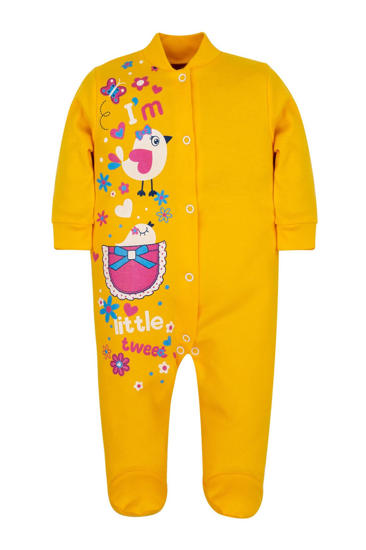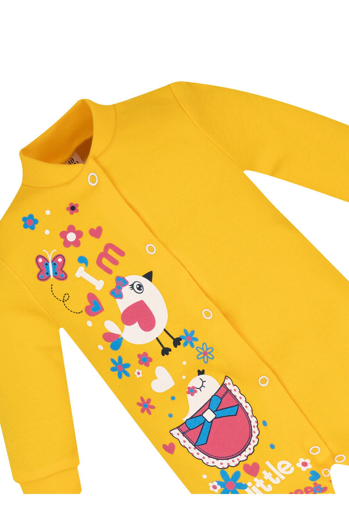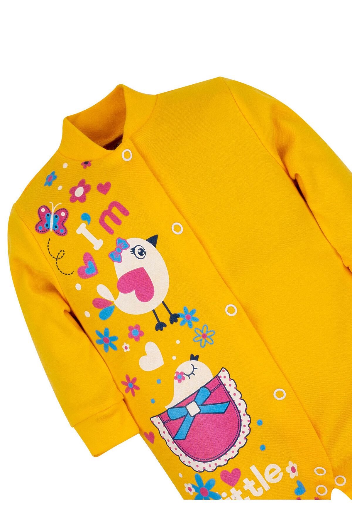 Превосходный трикотажный комбинезон с закрытыми ножками очень удобно использовать в нежаркие деньки. Комбинезончик выполнен из высококачественного хлопкового интерлока желтого цвета, весьма нежненького, приятного и мягкого. Открытые длинные рукава оформлены эластичными манжетами, а воротничок-стойка изготовлен из такого же материала. От горловины и до проймы ножек проходит удобная застёжка в виде кнопочек. Спереди принт поющие птички. >