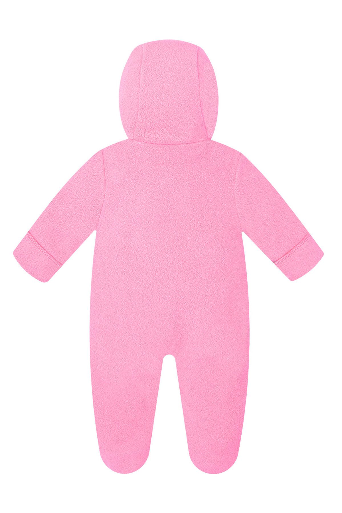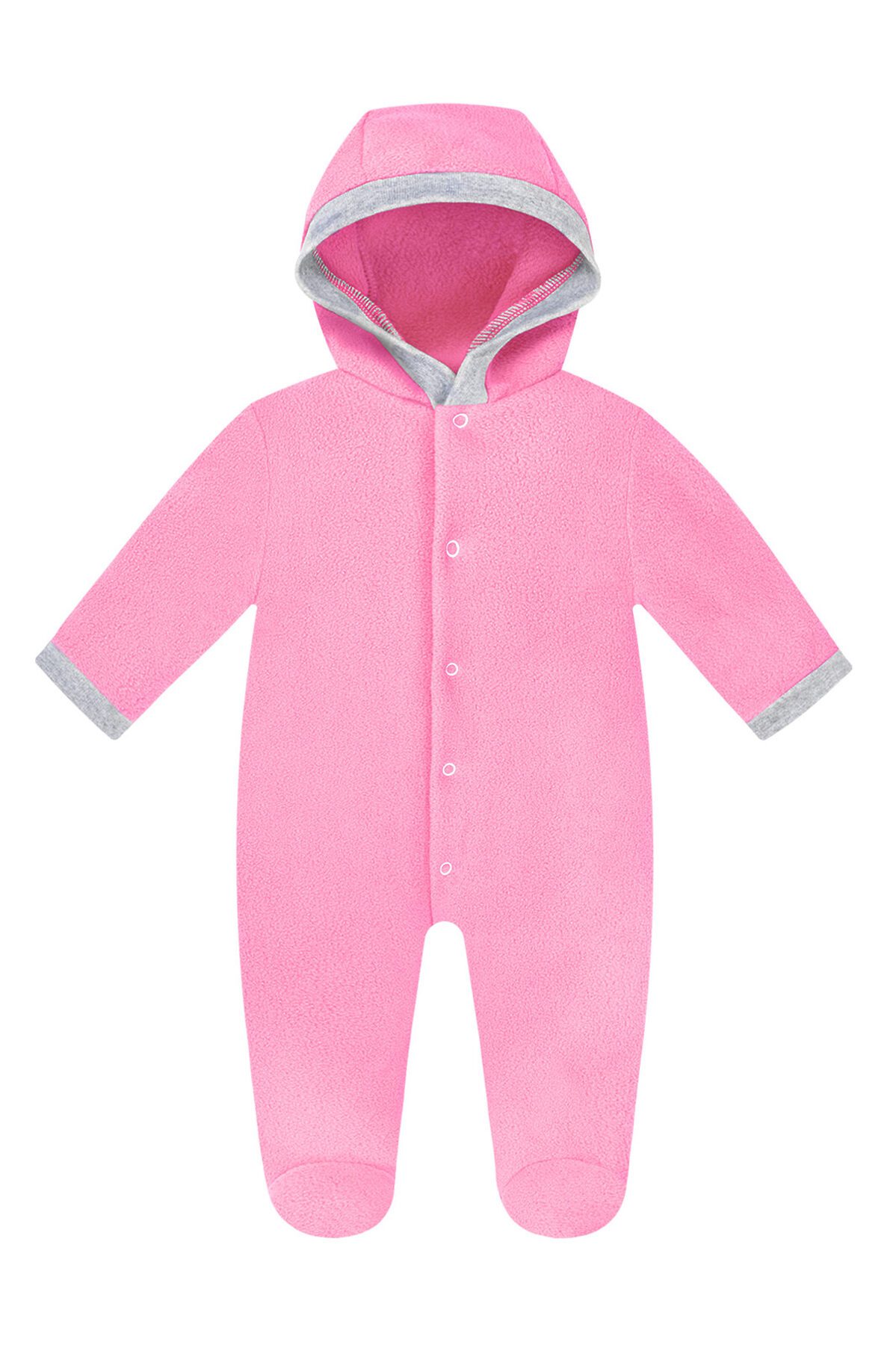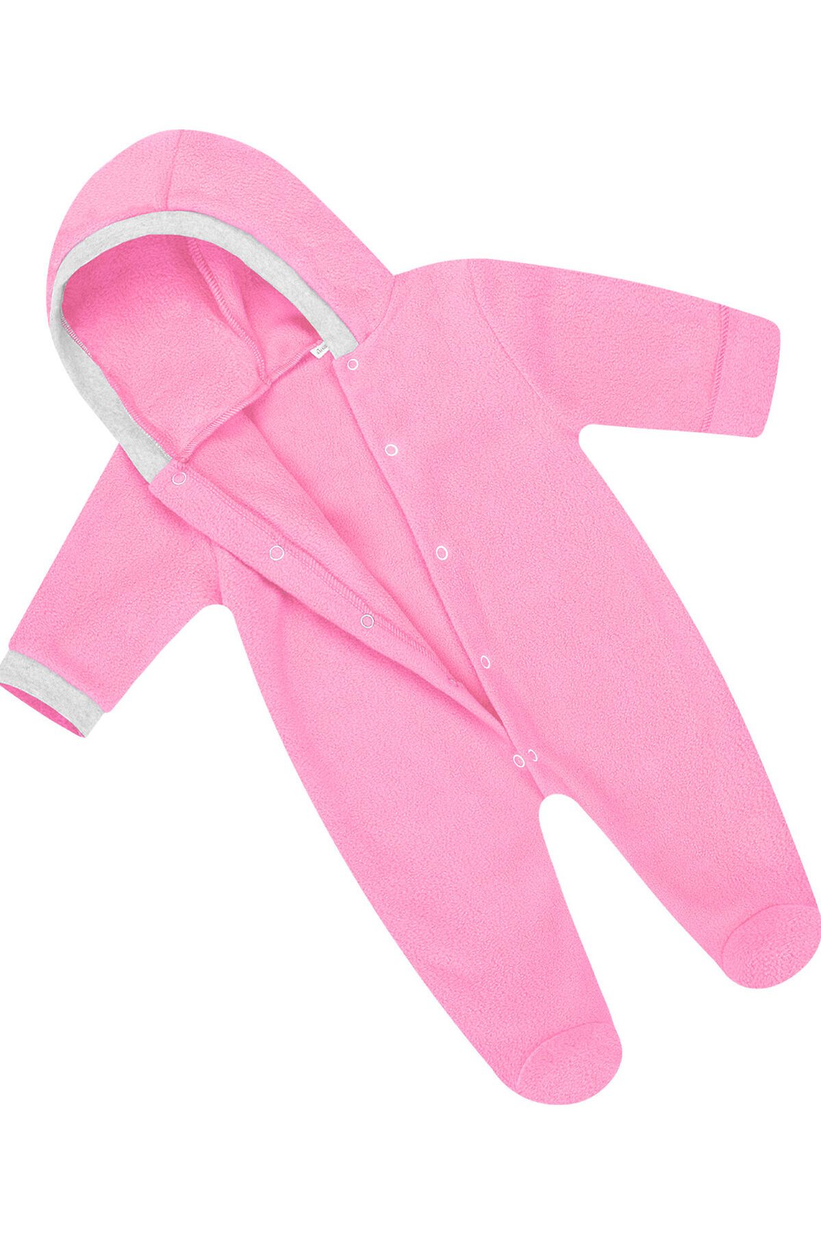Ясельный флисовый комбинезончик с закрытыми ножками однотонного розового цвета с капюшоном. Может быть пижамой, если дома прохладно, поддевой зимой, самостоятельным предметом одежды. На ручках клапаны антицарапки. Рукава и край капюшона отделаны мягкой трикотажной серой рибаной. Комбинезон застегивается на прочные кнопки.>