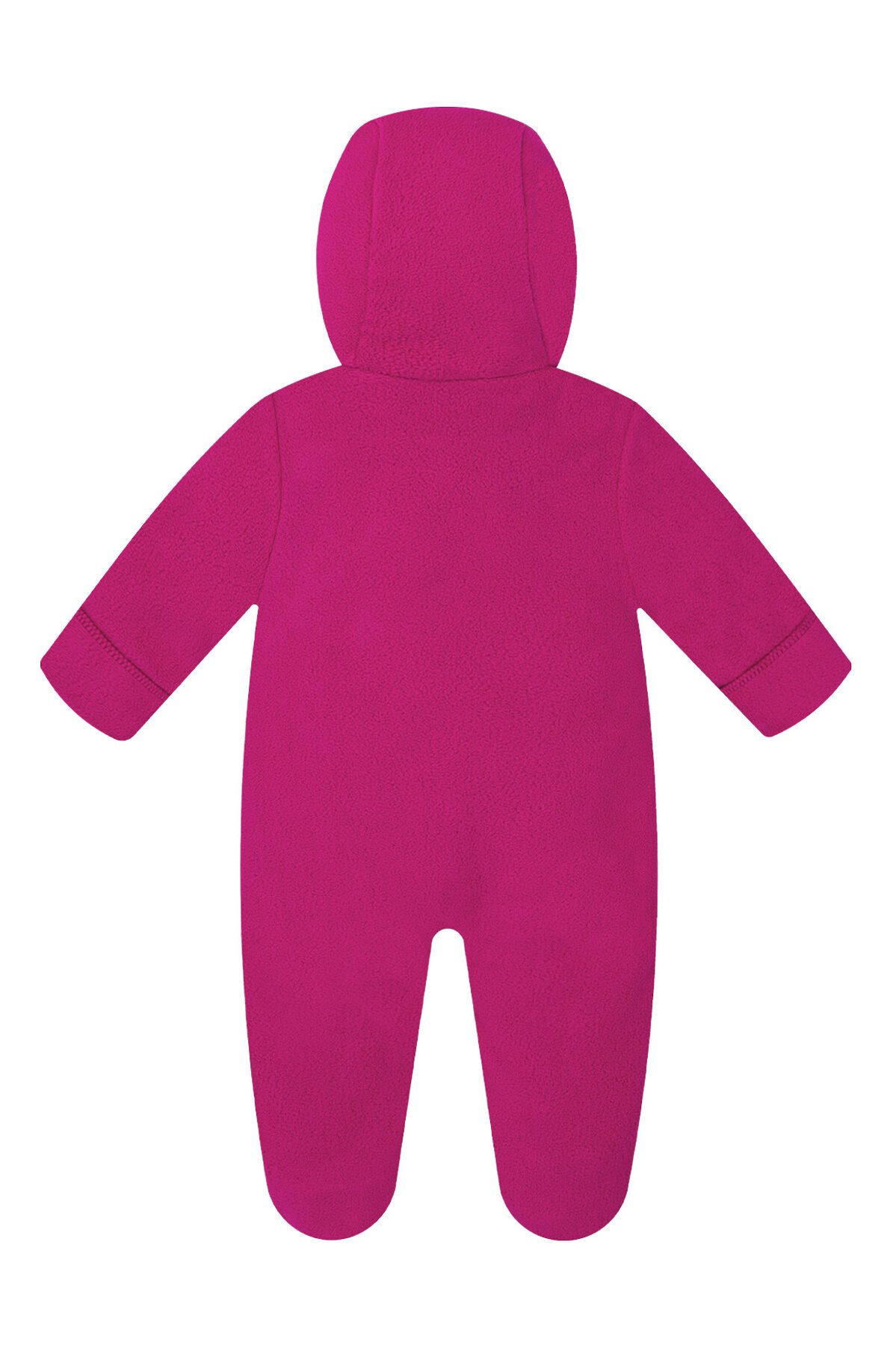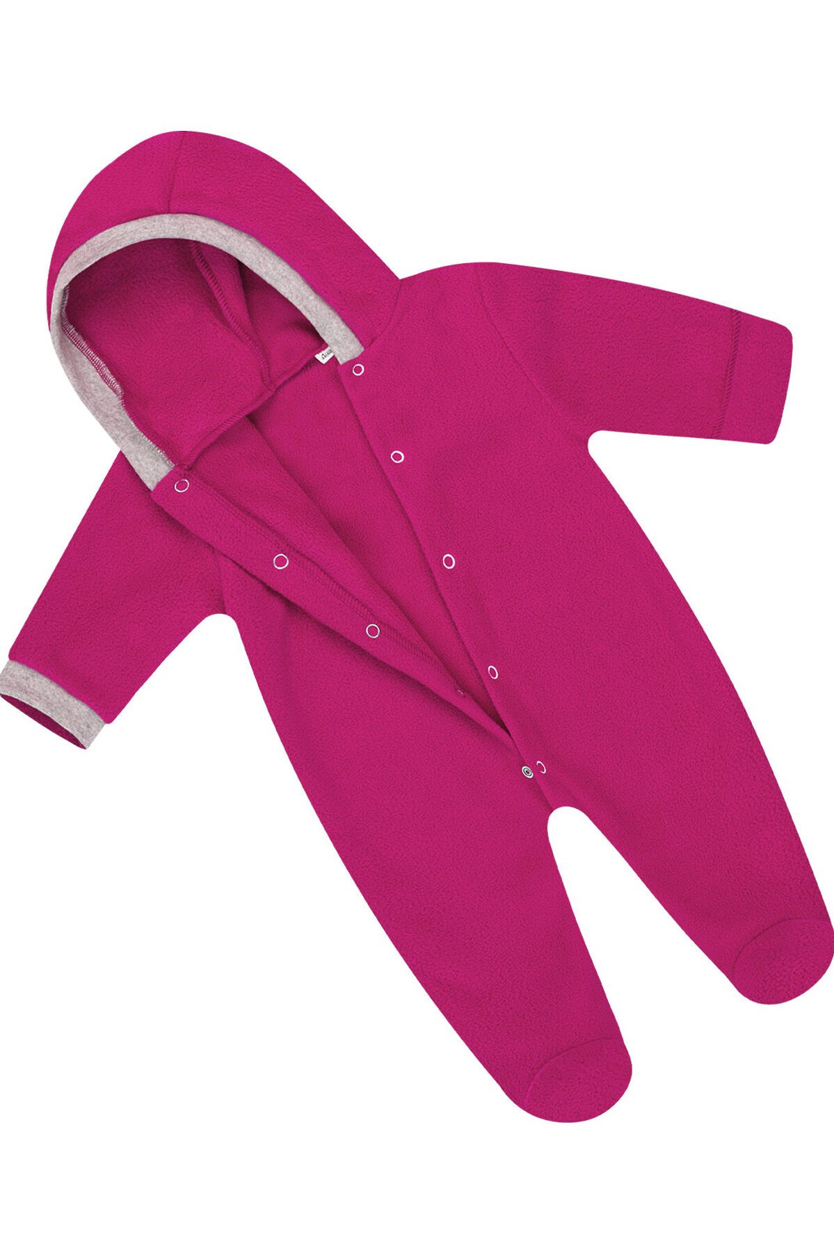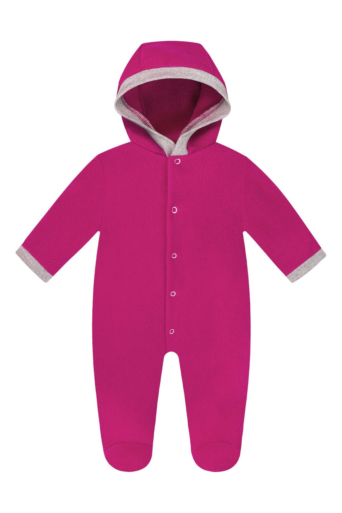 Ясельный флисовый комбинезончик с закрытыми ножками однотонного цвета фуксия с капюшоном. Может быть пижамой, если дома прохладно, поддевой зимой, самостоятельным предметом одежды. На ручках клапаны антицарапки. Рукава и край капюшона отделаны мягкой трикотажной серой рибаной. Комбинезон застегивается на прочные кнопки.>
