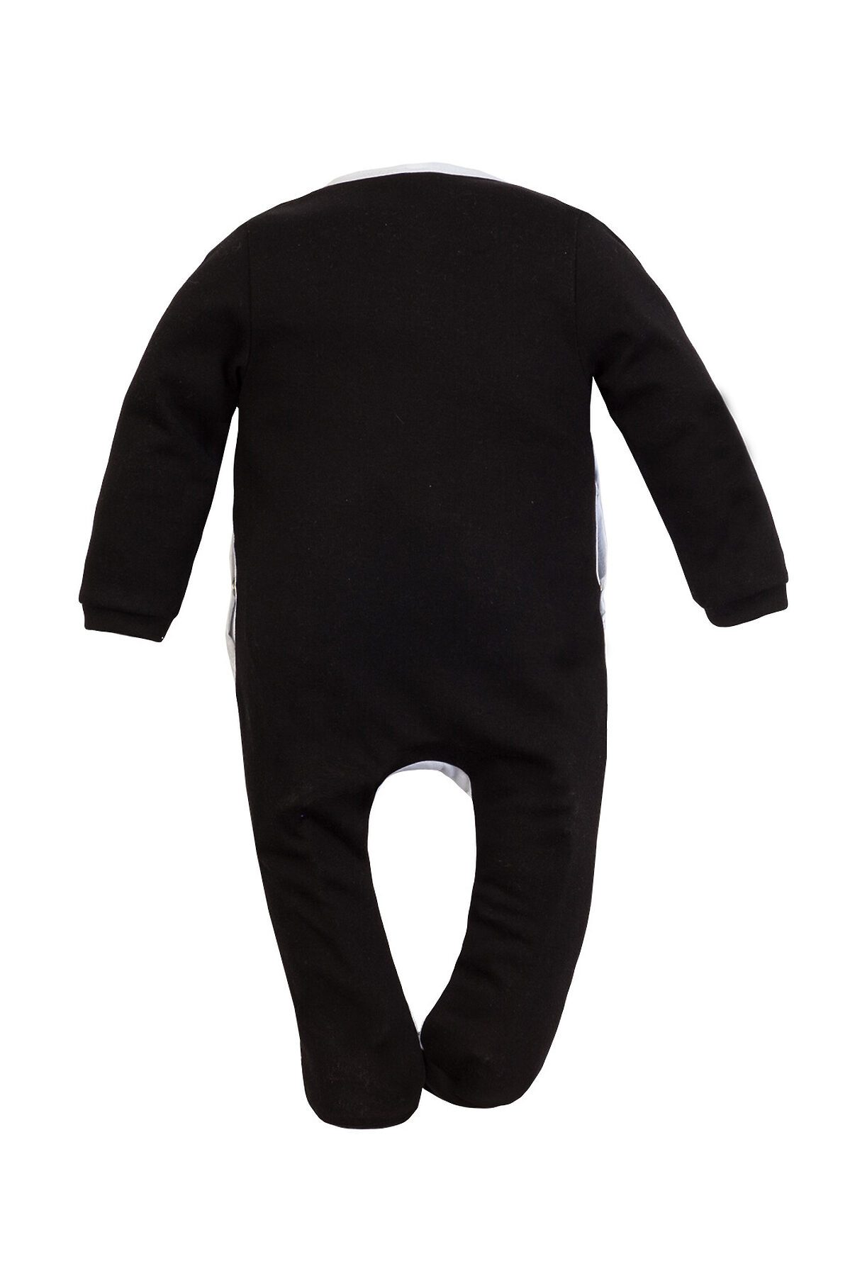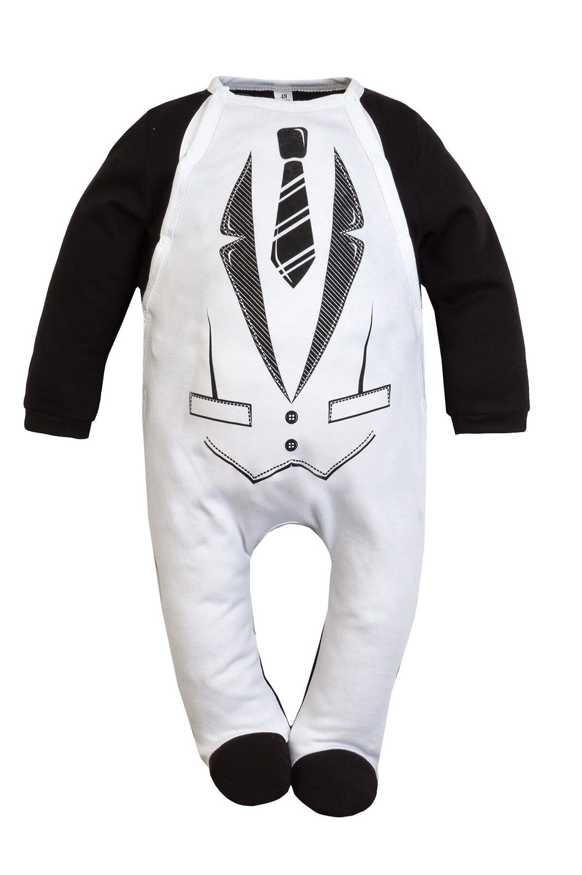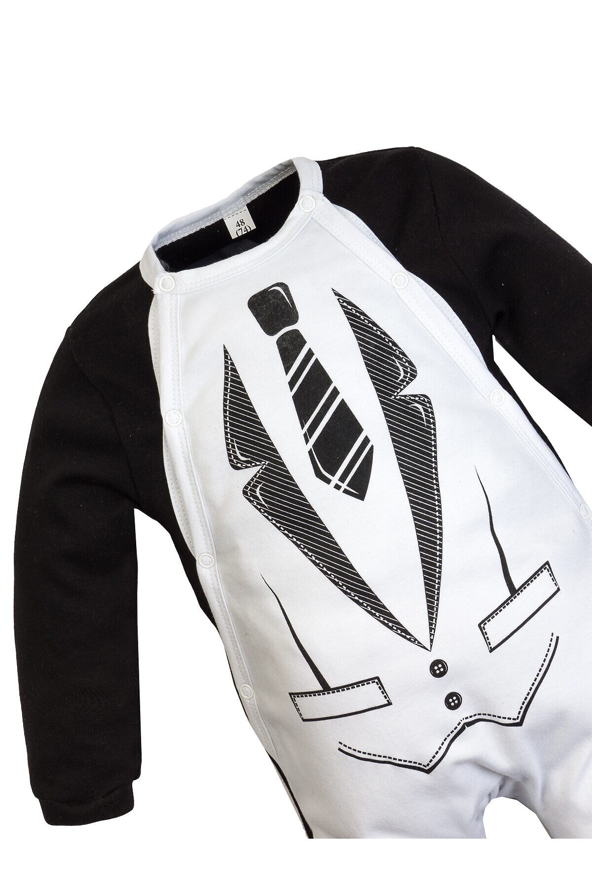 Практичный комбинезон с закрытыми ножками белого и черного цвета. Спереди принт жилетка и галстук. Горловина и края обработаны мягкой трикотажной бейкой. Застёжки-клёпки расположены спереди по диагонали. Гипоаллергенный, нежный на ощупь, дышащий, хорошо тянущийся в ширину трикотаж. Не требует сложного ухода, идеально переносит частые стирки. >