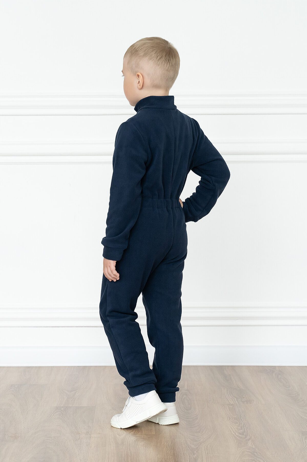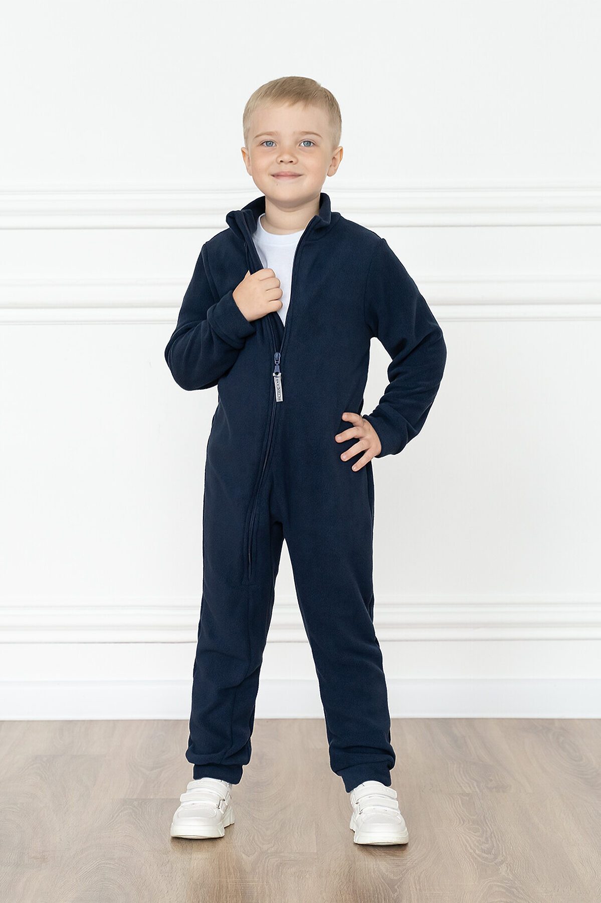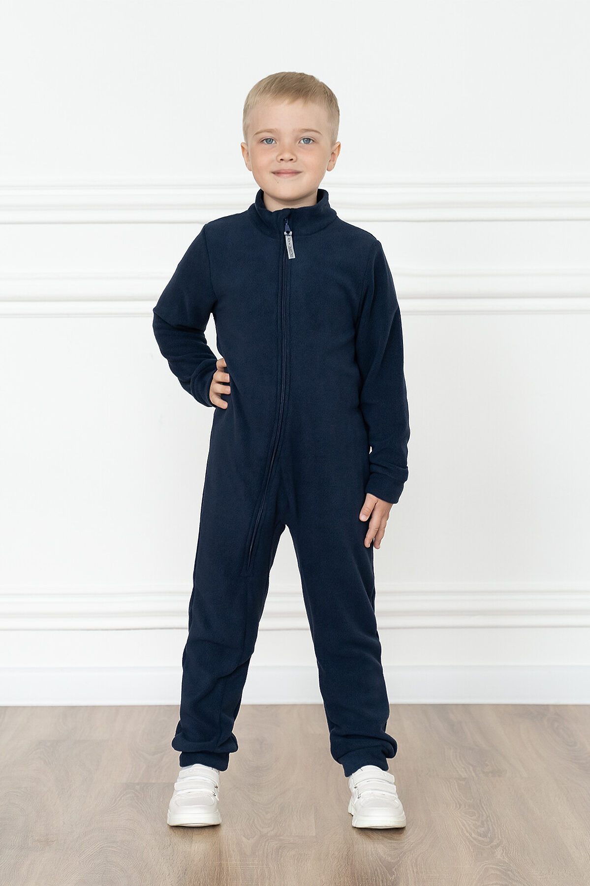 Мягкий и тёплый флис с меланжевым эффектом, хорошо сохраняет тепло, не электризуется. Особенности модели: Комбинезон однотонного темно-синего цвета. Высокий воротник, клапан для бегунка молнии. Манжеты на рукавах и штанинах. На спине резинка для лучшего прилегания. Ассиметричная застёжка-молния уходит в ножку.>