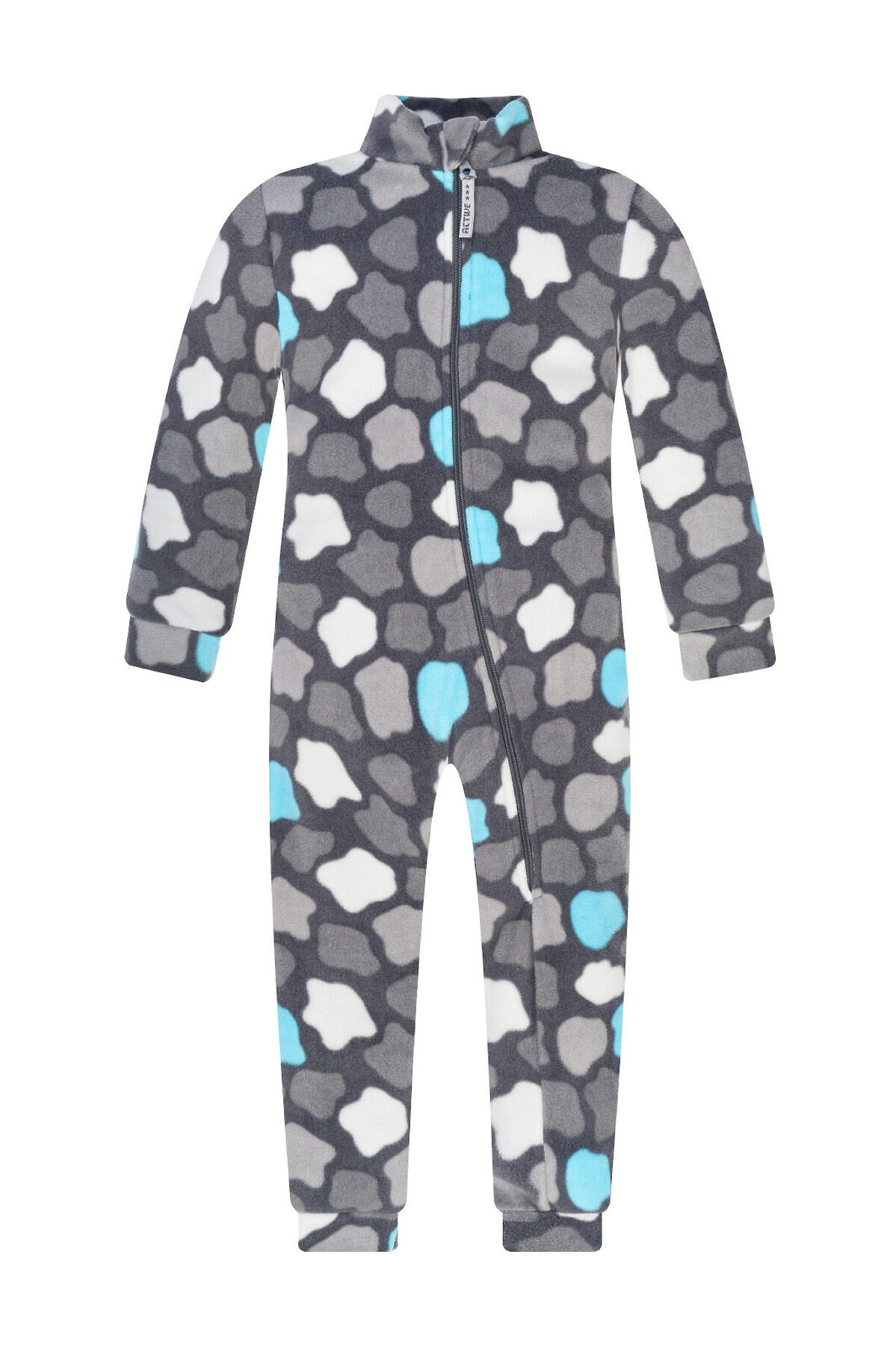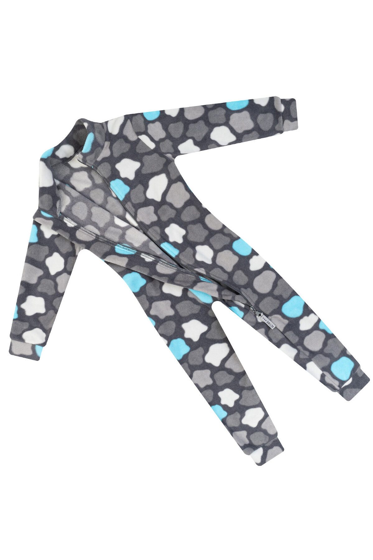 Флисовый комбинезон-поддёва с высоким воротником подойдёт детям для носки под верхнюю одежду. Модель выпускается из мягкого и нежного на ощупь флиса SHELYS плотностью 240 гр/кв.м серого цвета с принтом яркие пятна. Для недопуска холодного воздуха внутрь рукава и штанины обработаны манжетами, а в области поясницы пришита резинка. Для удобного надевания молния-застёжка расположена по косой до середины ножки. На воротнике-стойке есть клапан для бегунка молнии для защиты подбородка. >