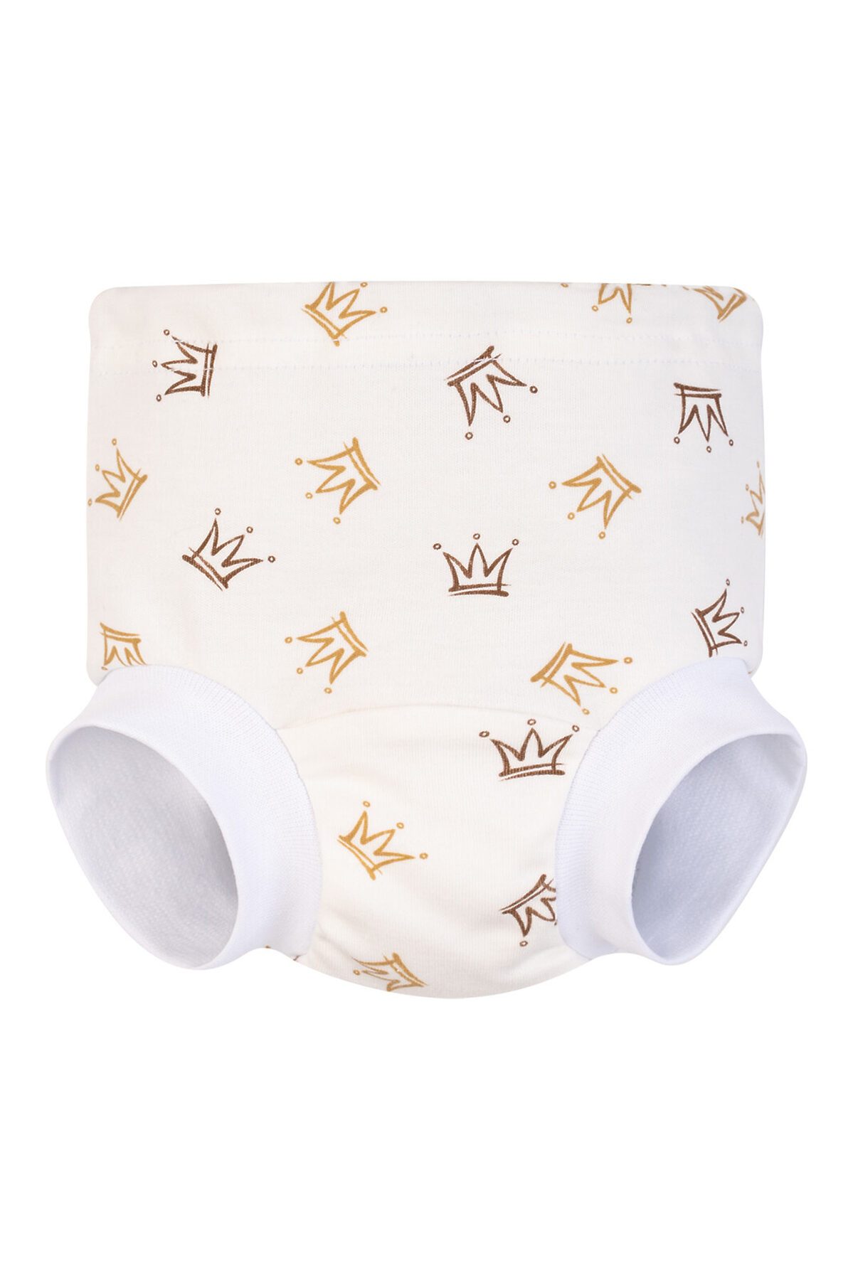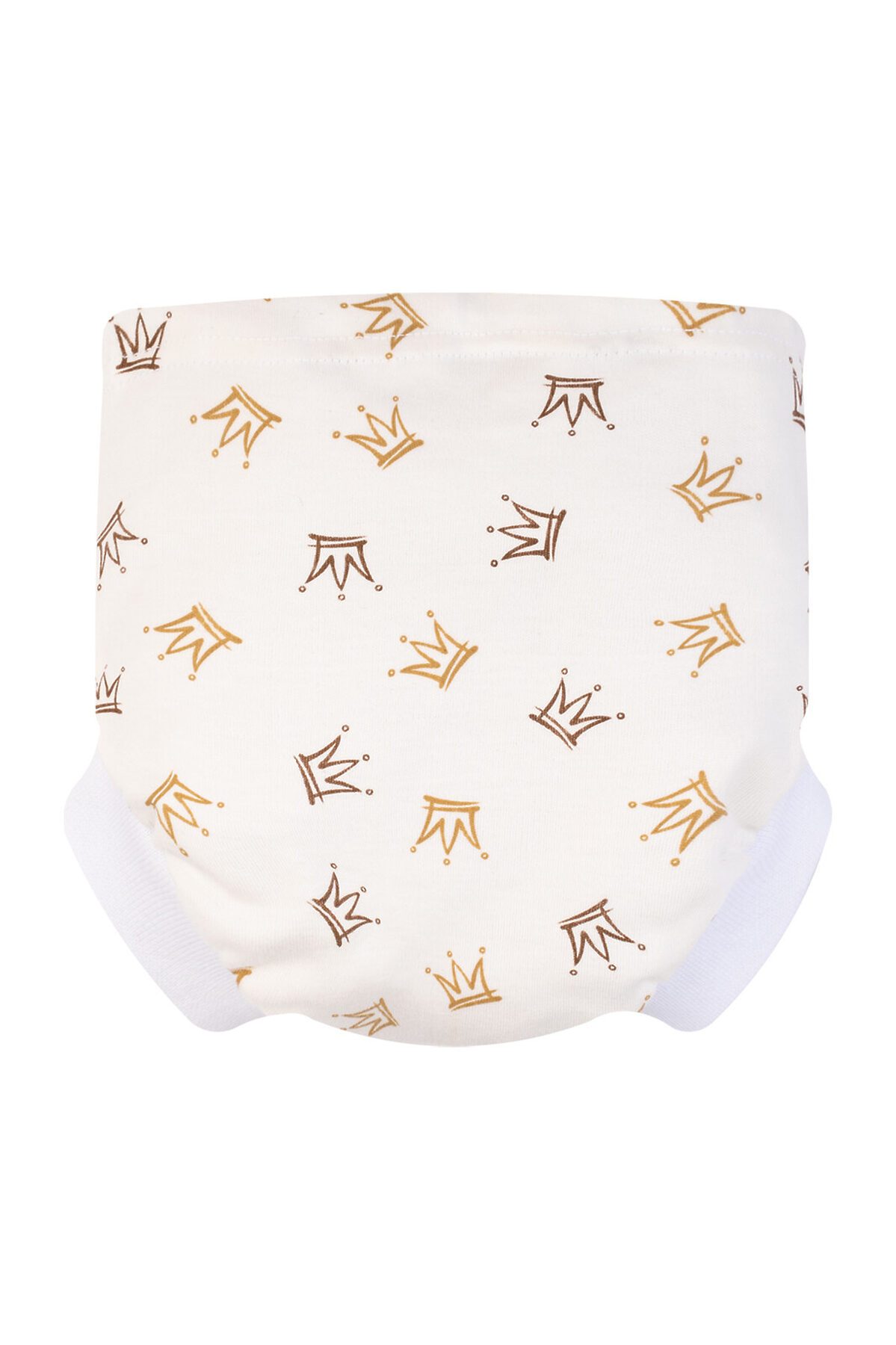 Детские трусики под памперс для мальчика и девочки в милой расцветке с принтом короны. Прилегающий силуэт. Ластовица двойная. На ножках эластичные мягкие манжеты. Пояс с регулируемой резиночкой. Сшиты из хлопкового гипоаллергенного набивного интерлока. >