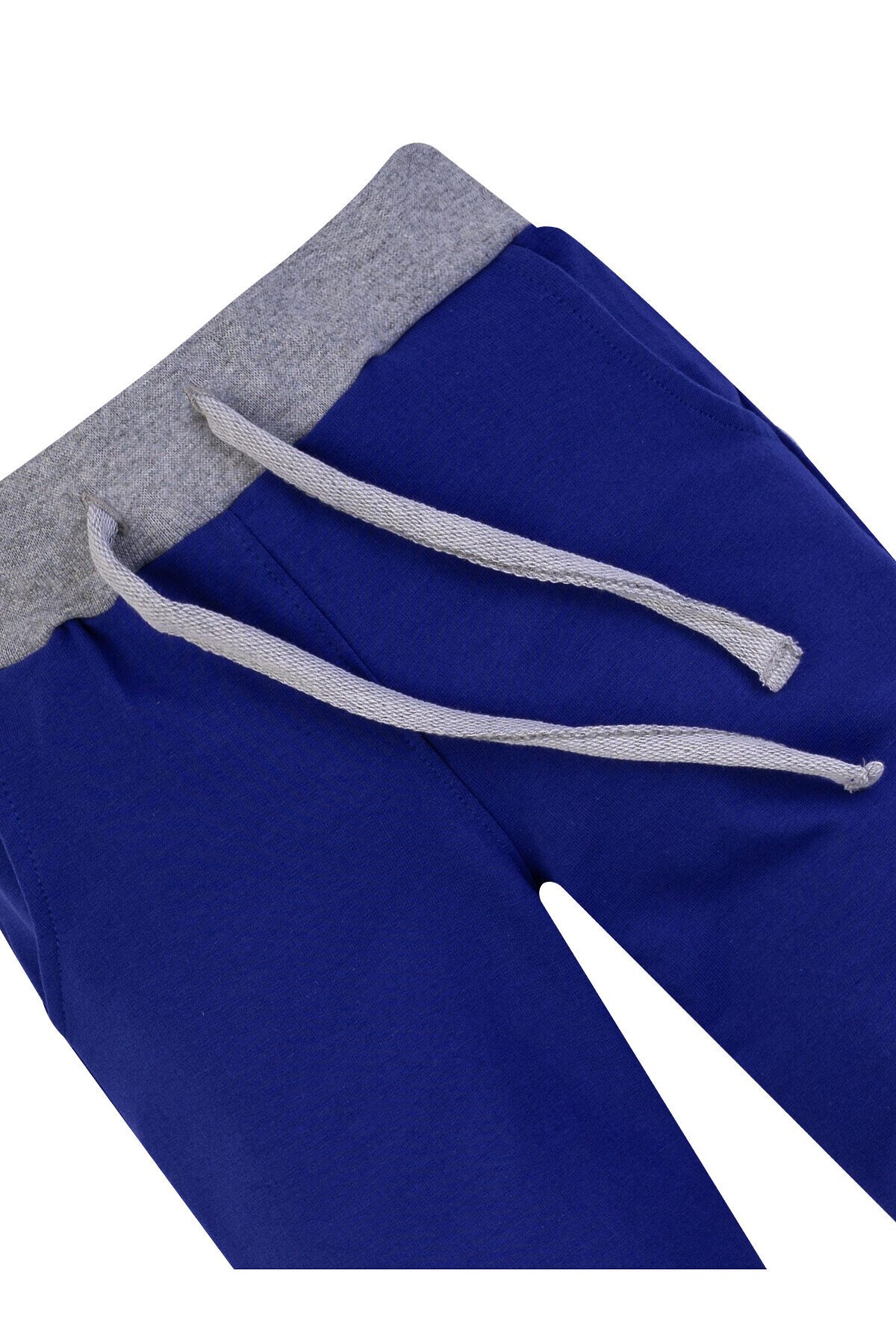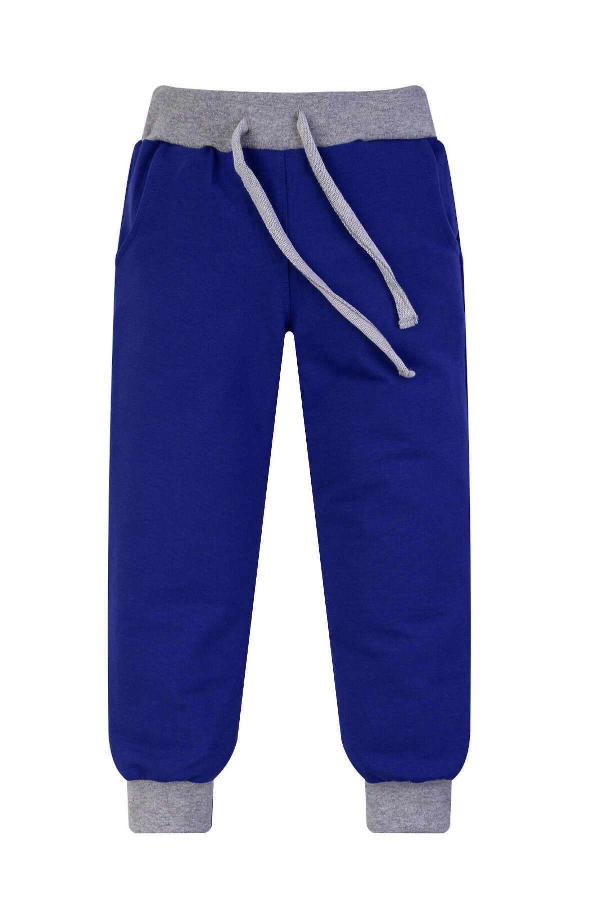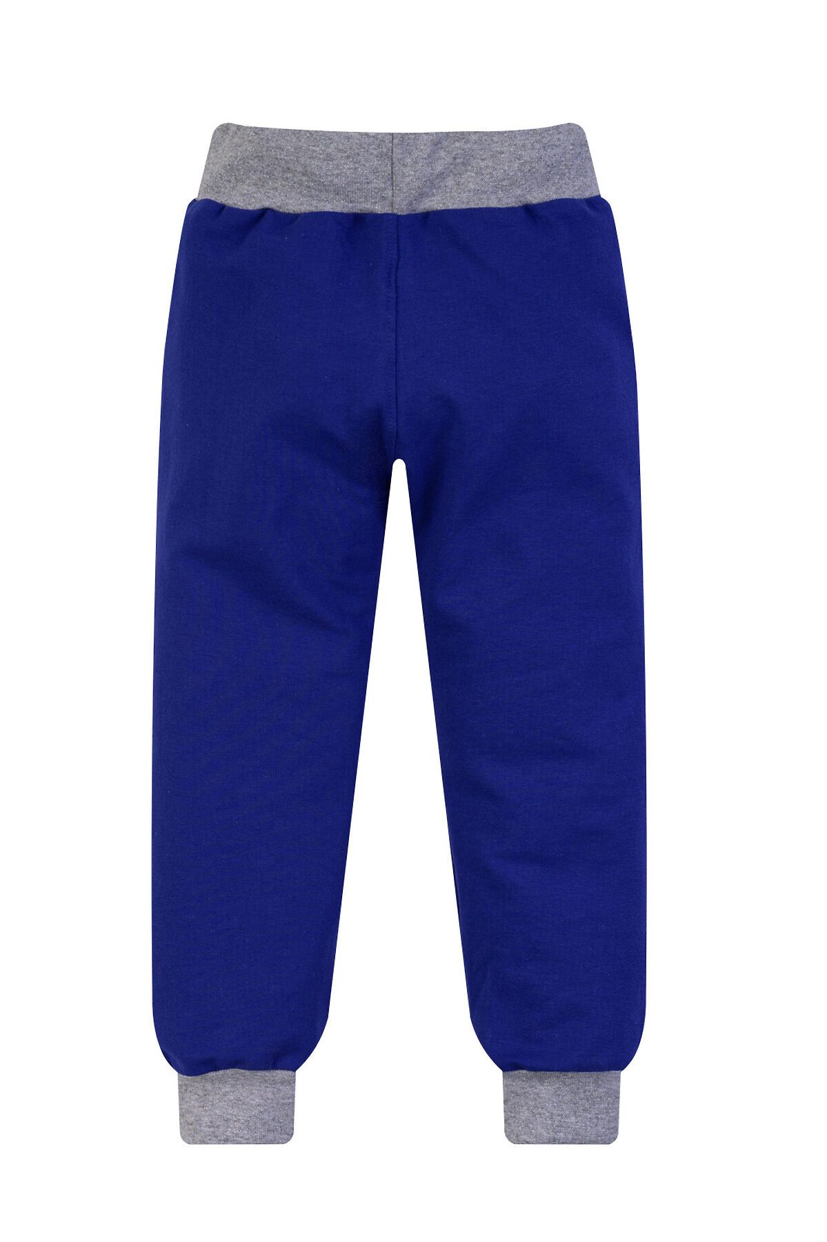 Практичные брюки синие свободного кроя не стеснят движений ребёнка. Модель выполнена из мягкого и плотного футера с добавлением лайкры. Брюки имеют трикотажный пояс со шнуром-утяжкой внутри и глубокие карманы по бокам. Низ штанин обработан эластичными манжетами. >