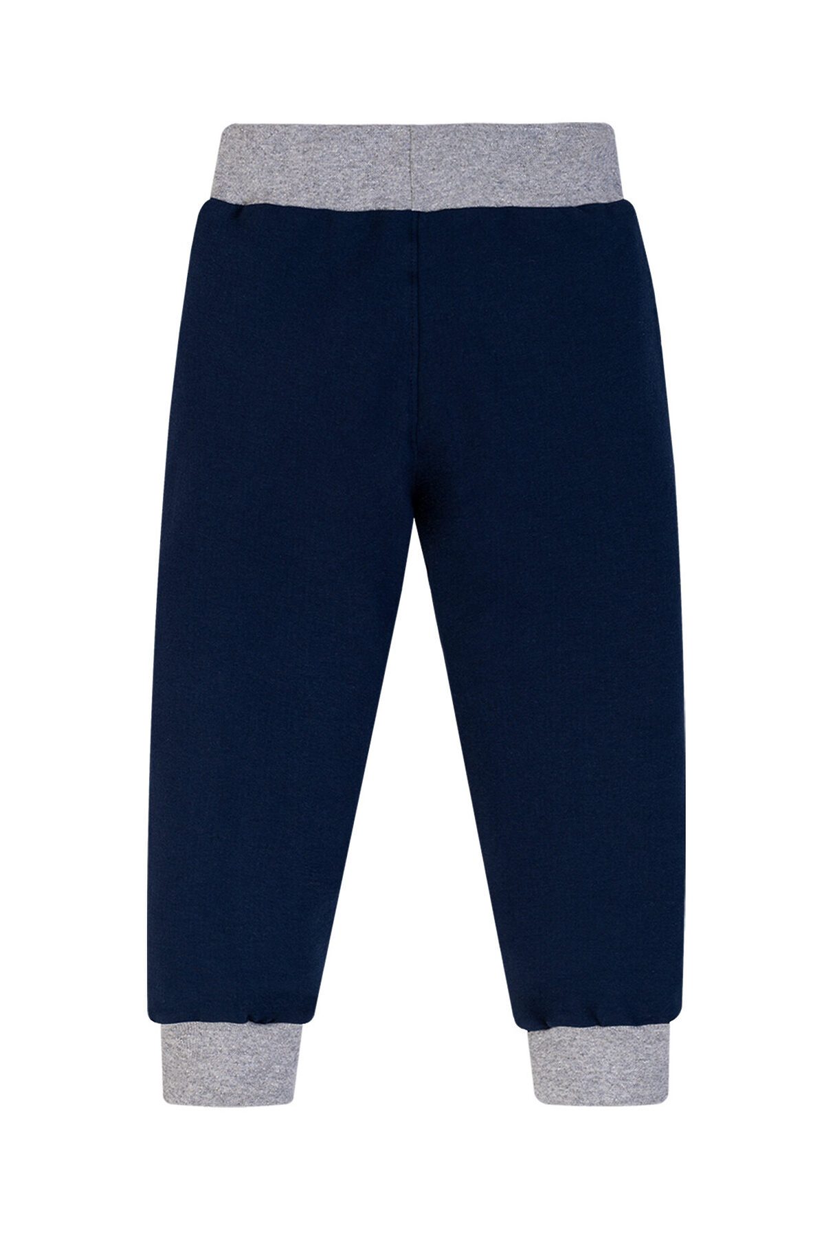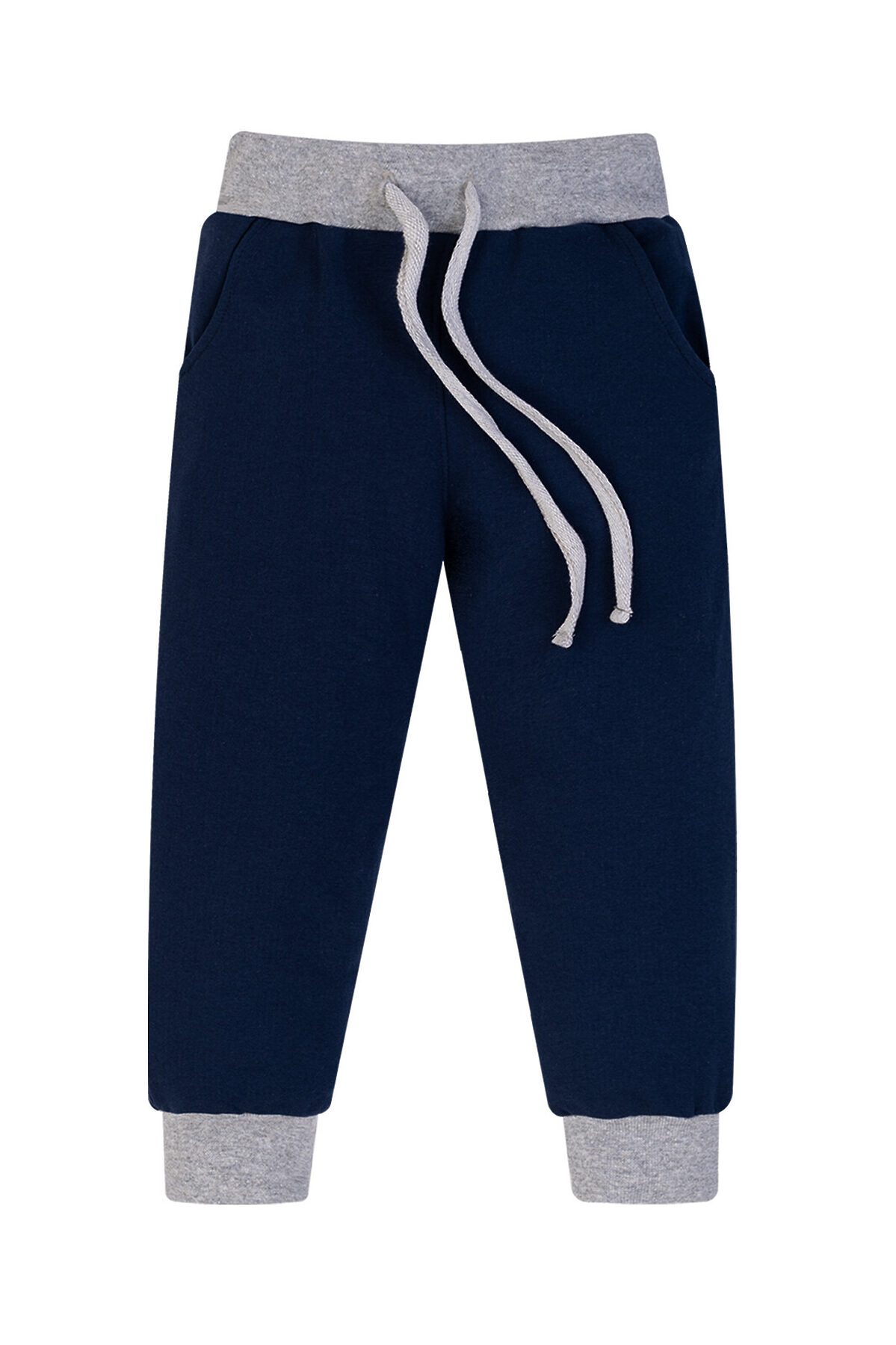 Практичные брюки темно-синие свободного кроя не стеснят движений ребёнка. Модель выполнена из мягкого и плотного футера с добавлением лайкры. Брюки имеют трикотажный пояс со шнуром-утяжкой внутри и глубокие карманы по бокам. Низ штанин обработан эластичными манжетами. >