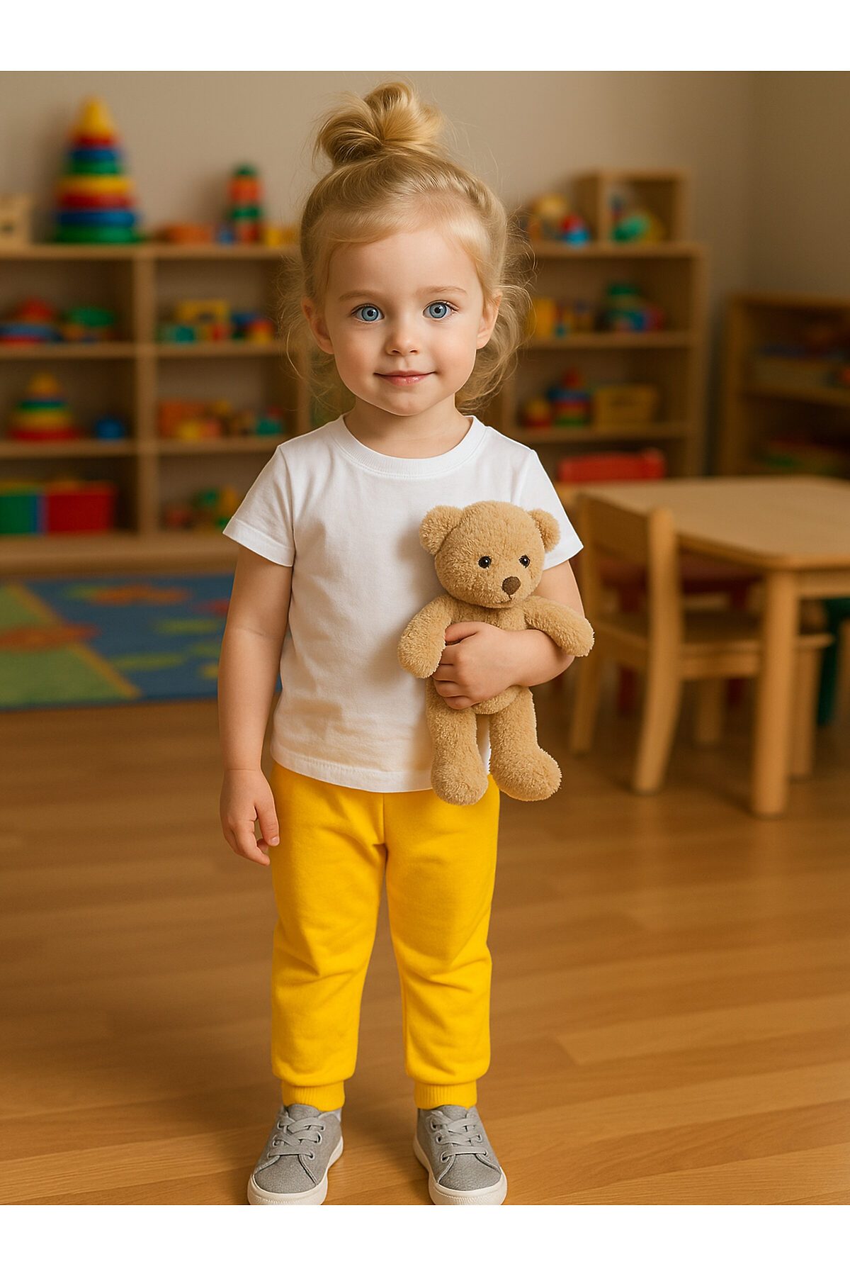 Для повседневной носки мальчикам и девочкам пригодятся комфортные трикотажные штанишки. Модель выпускается из мягкого, приятного и нежного на ощупь хлопкового интерлока однотонного желтого цвета. Брюки имеют широкую резинку в поясе и двуслойные манжеты внизу штанин. >