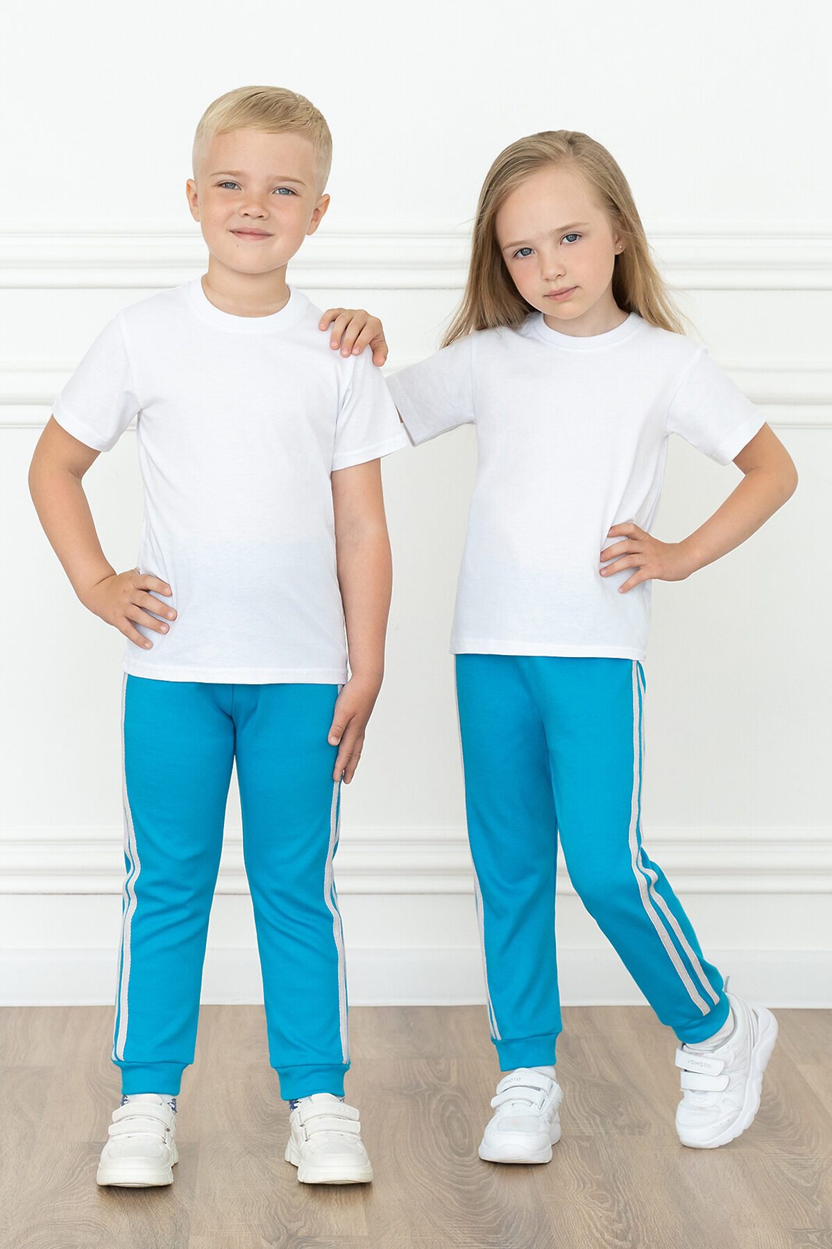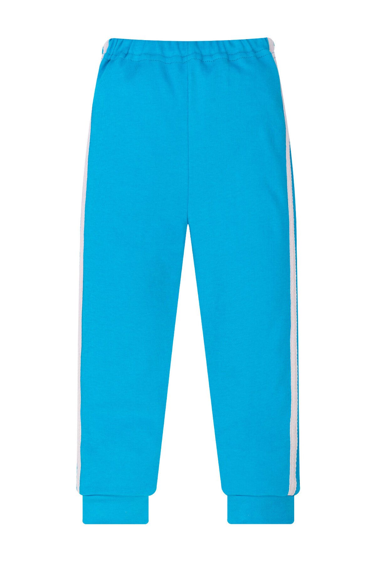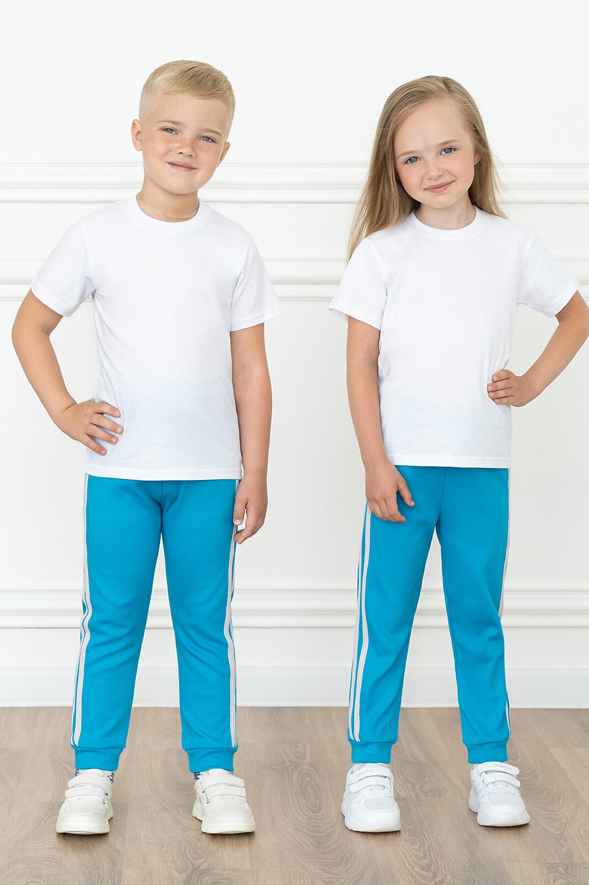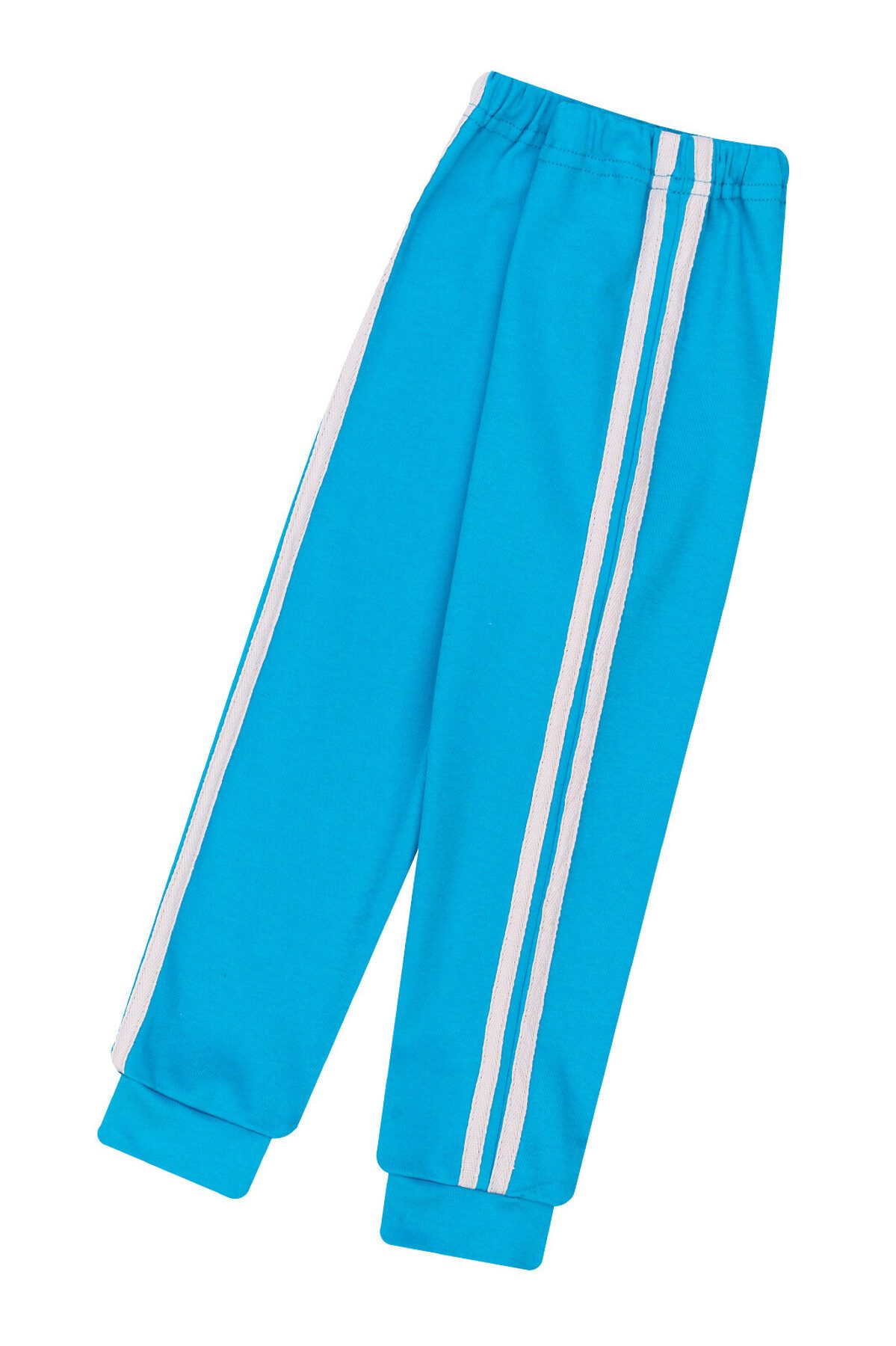 Детские трикотажные домашние штанишки бирюзового цвета для мальчиков и девочек. Подходят для повседневной носки дома, прогулок на улице и занятий спортом. Сшиты из мягкого и нежного хлопкового трикотажа. Полуприлегающий силуэт. Пояс на резинке. По низу штанин двуслойные манжеты. По бокам две декоративные белые полоски (лампасы).>