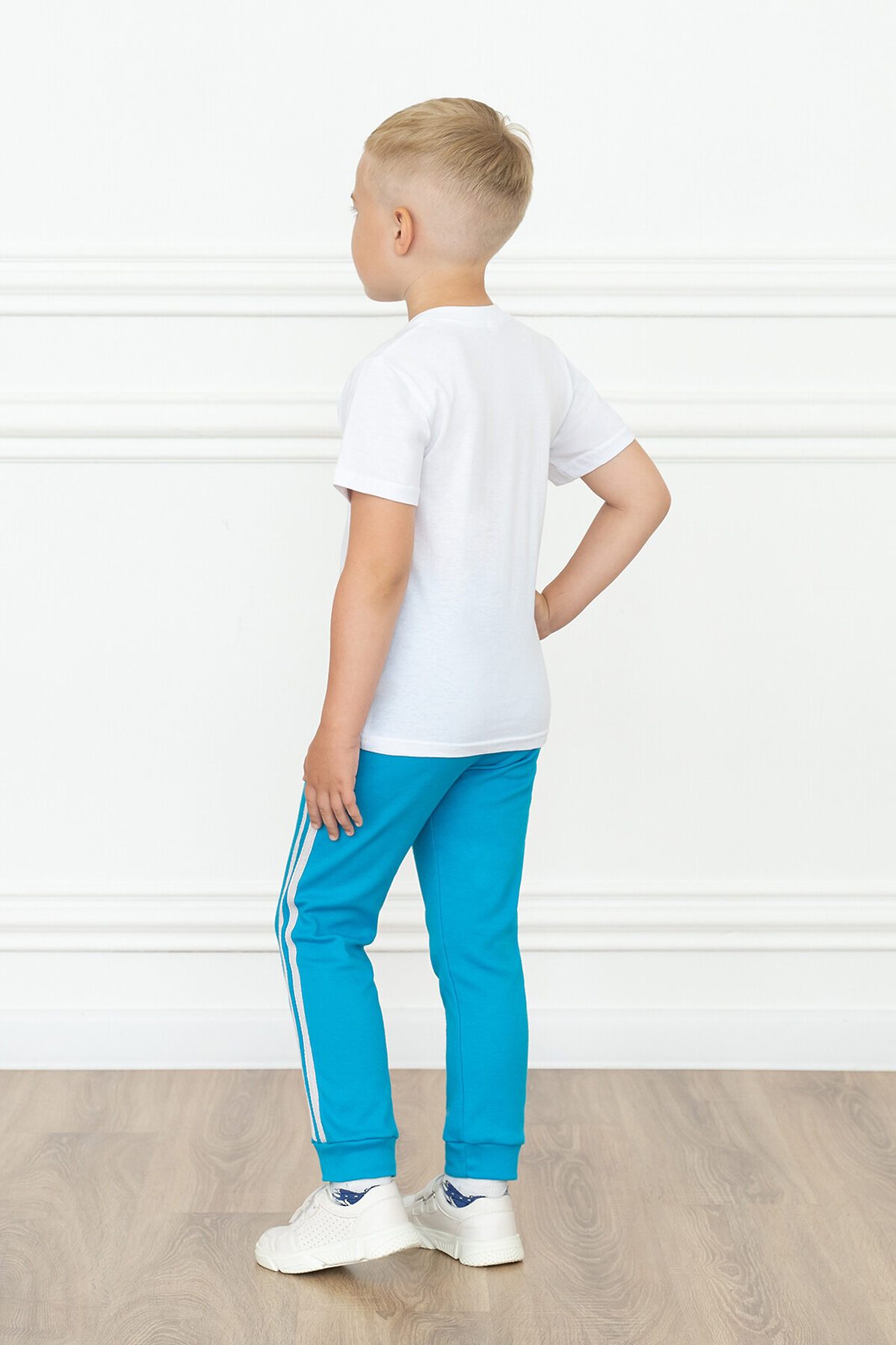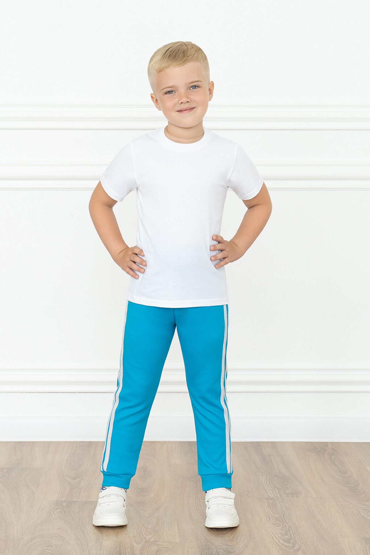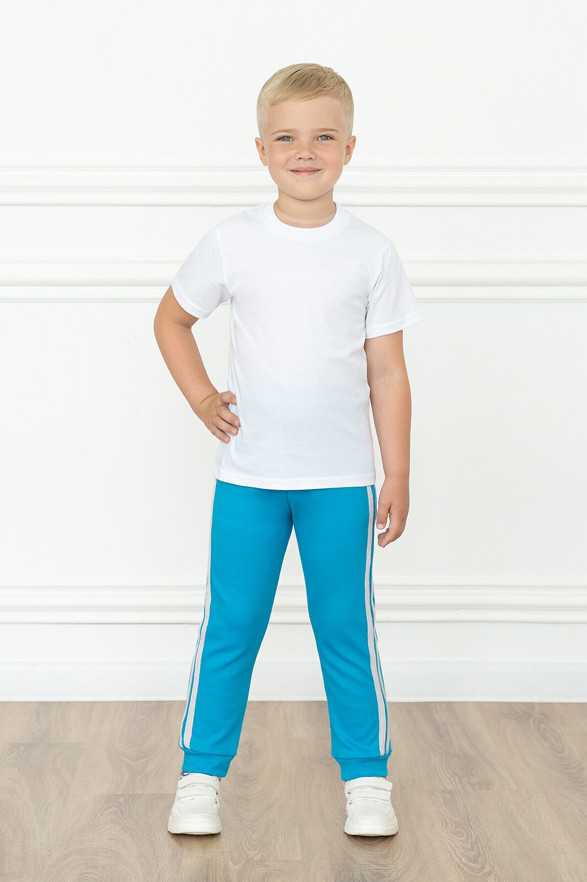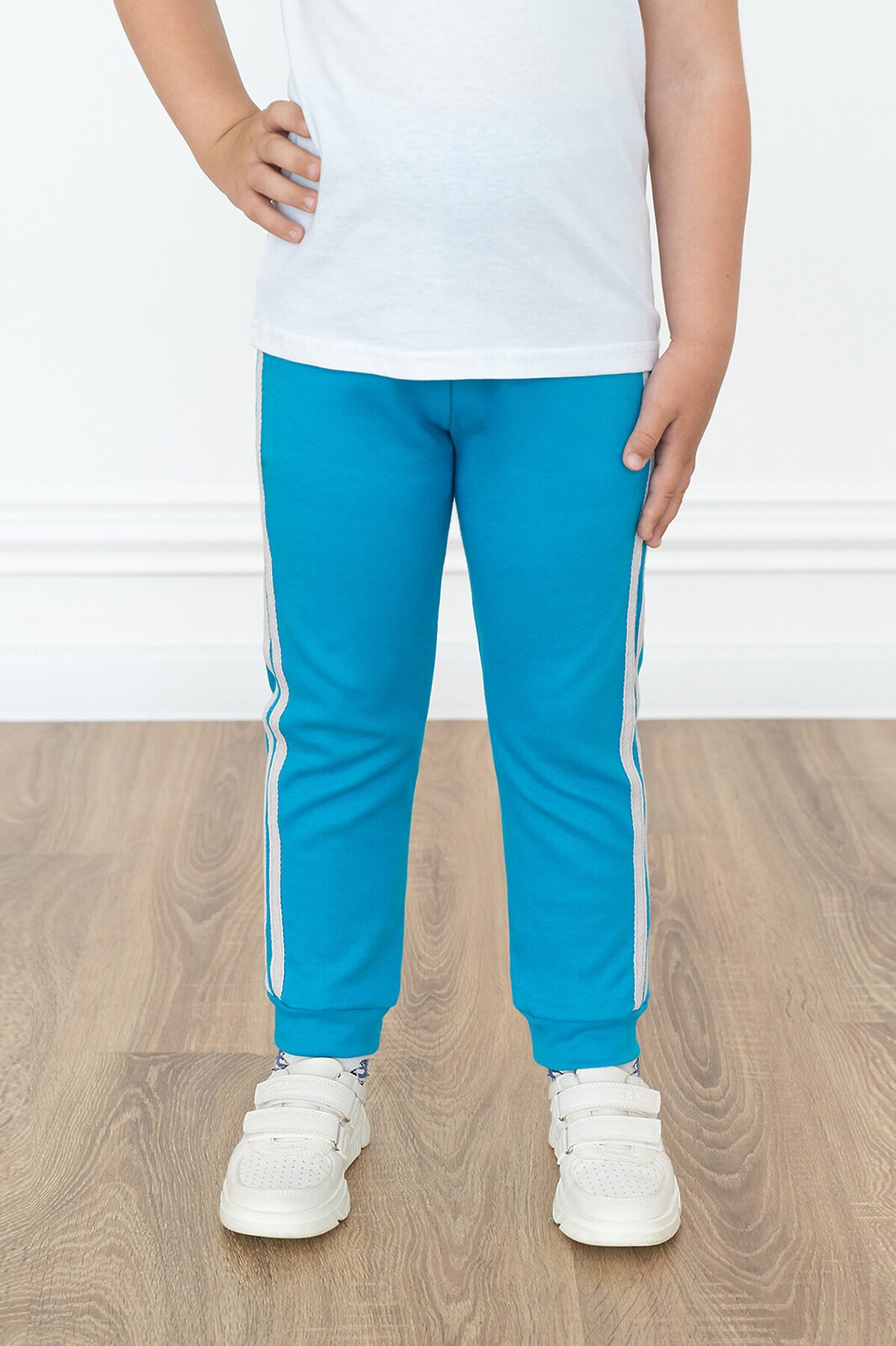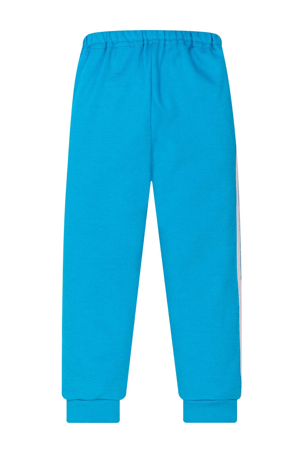 Детские трикотажные домашние штанишки бирюзового цвета для мальчиков и девочек. Подходят для повседневной носки дома, прогулок на улице и занятий спортом. Сшиты из мягкого и нежного хлопкового трикотажа. Полуприлегающий силуэт. Пояс на резинке. По низу штанин двуслойные манжеты. По бокам две декоративные белые полоски (лампасы).>