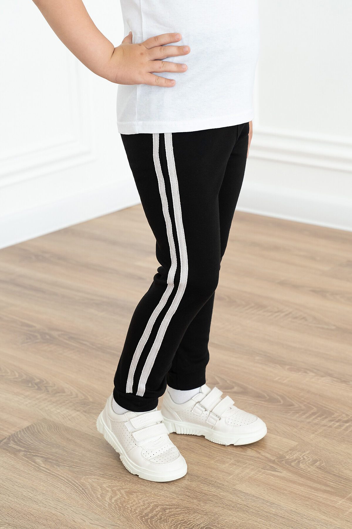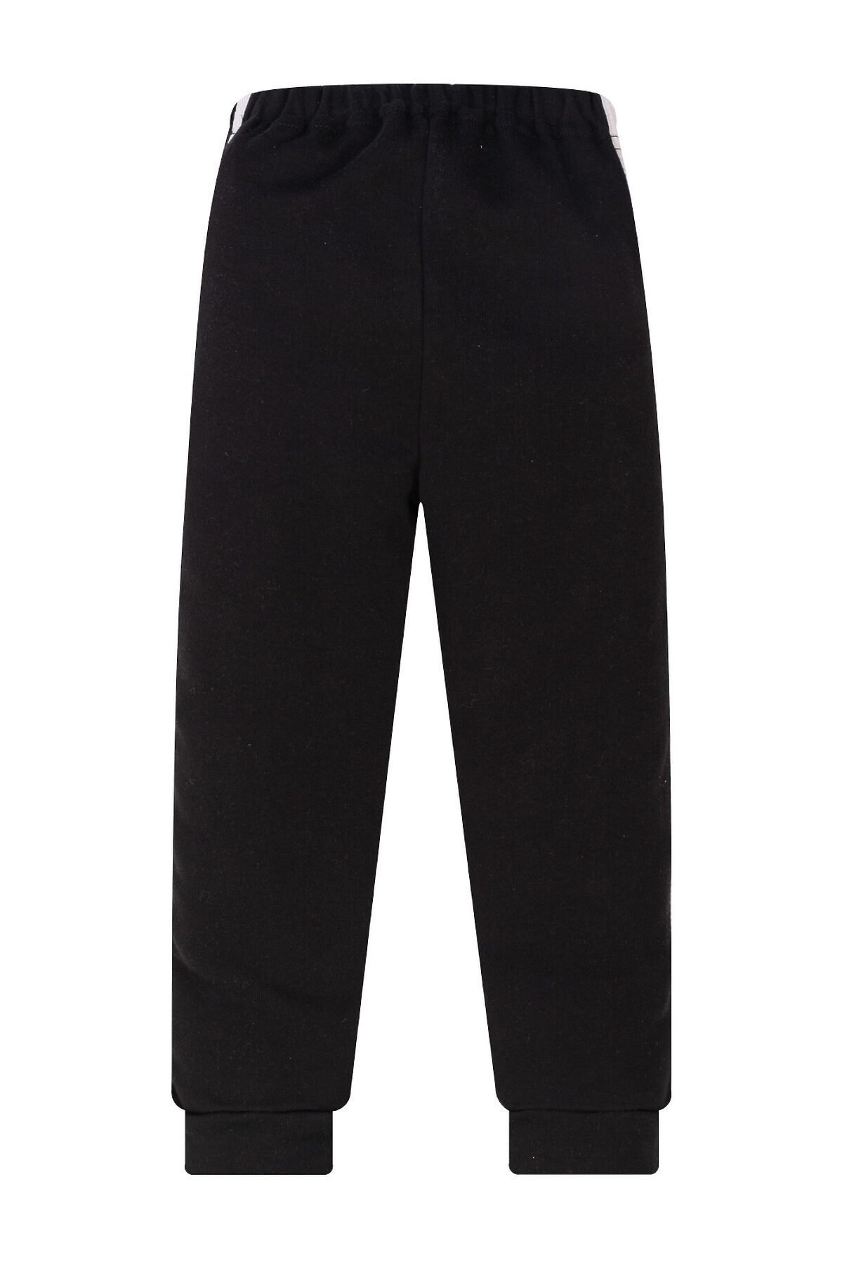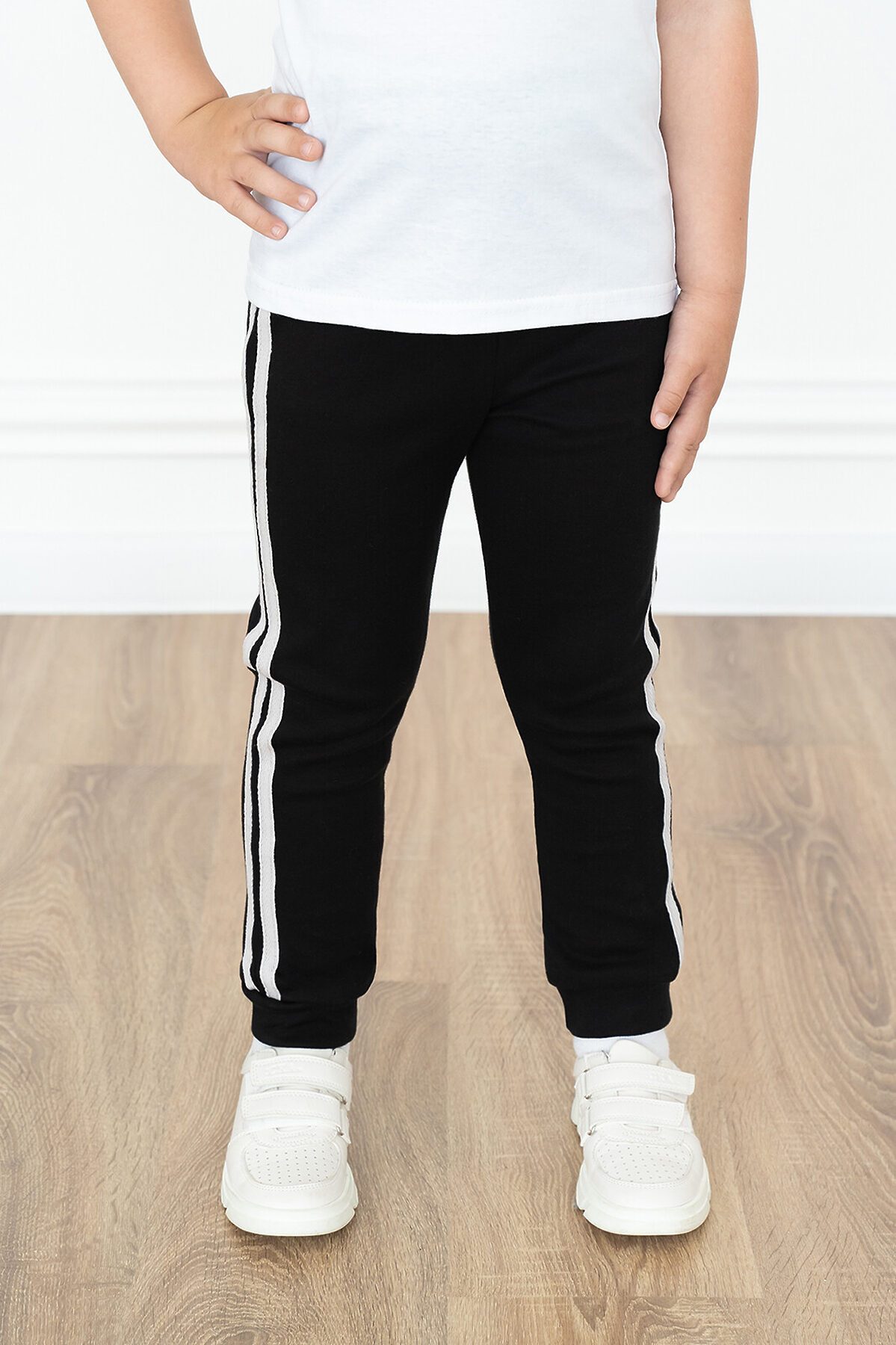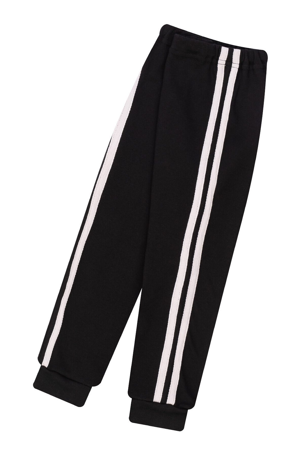 Детские трикотажные домашние штанишки черного цвета для мальчиков и девочек. Подходят для повседневной носки дома, прогулок на улице и занятий спортом. Сшиты из мягкого и нежного хлопкового трикотажа. Полуприлегающий силуэт. Пояс на резинке. По низу штанин двуслойные манжеты. По бокам две декоративные белые полоски (лампасы). >