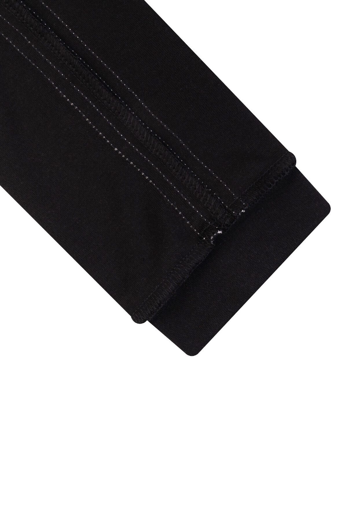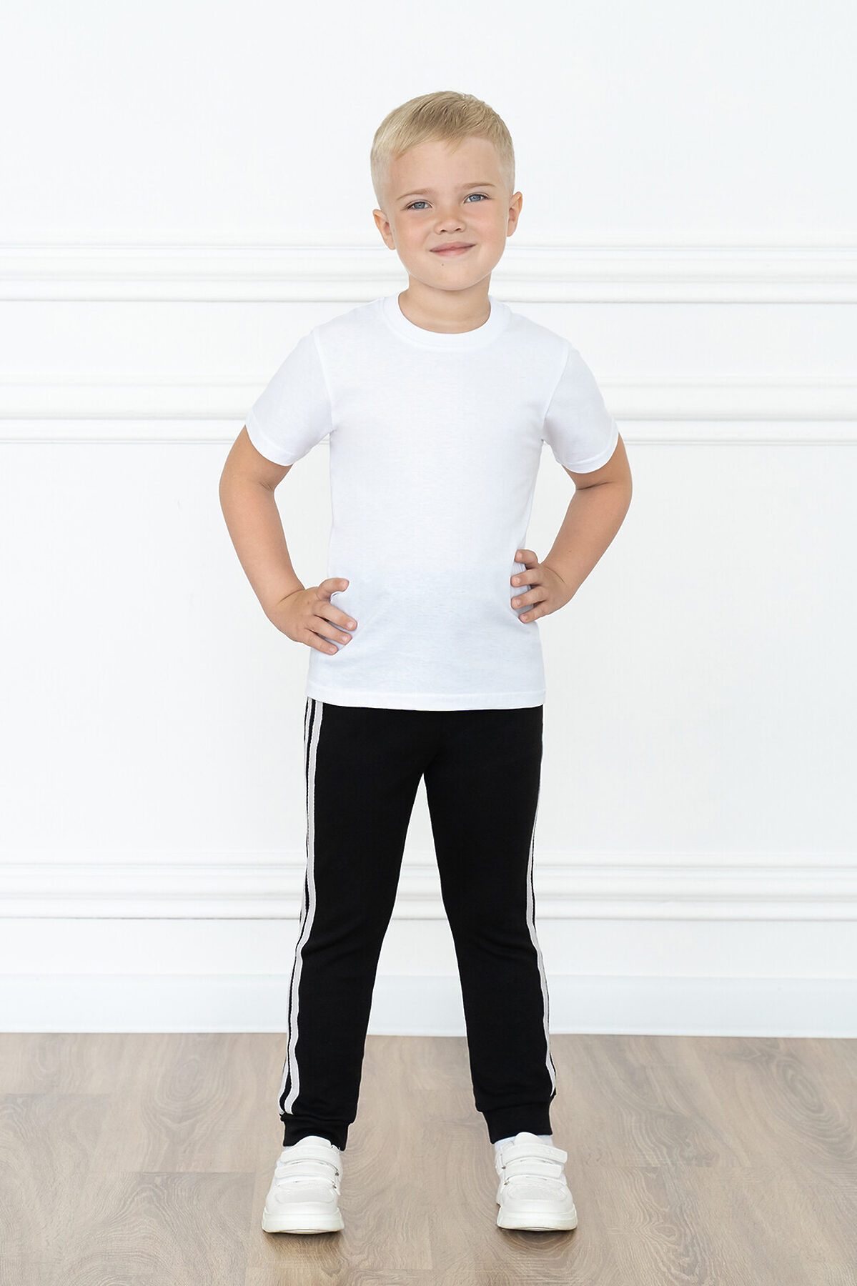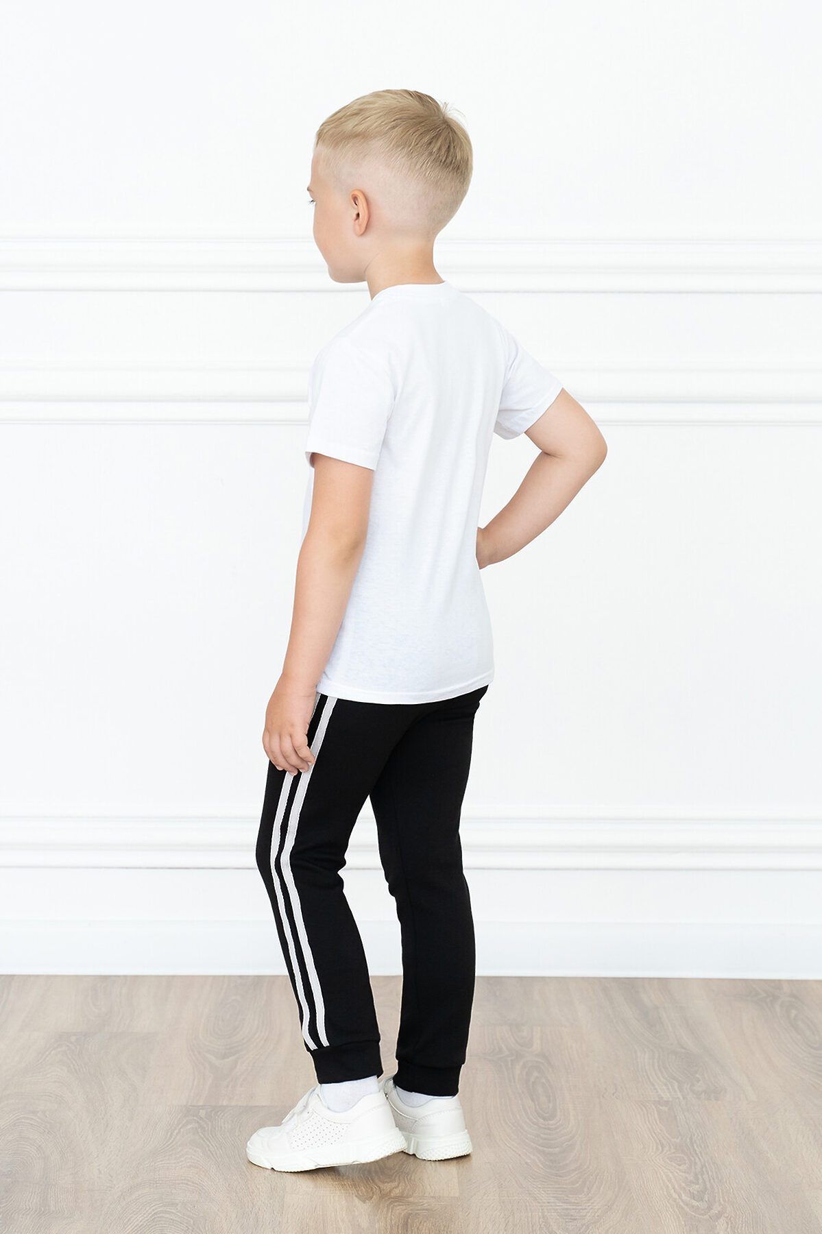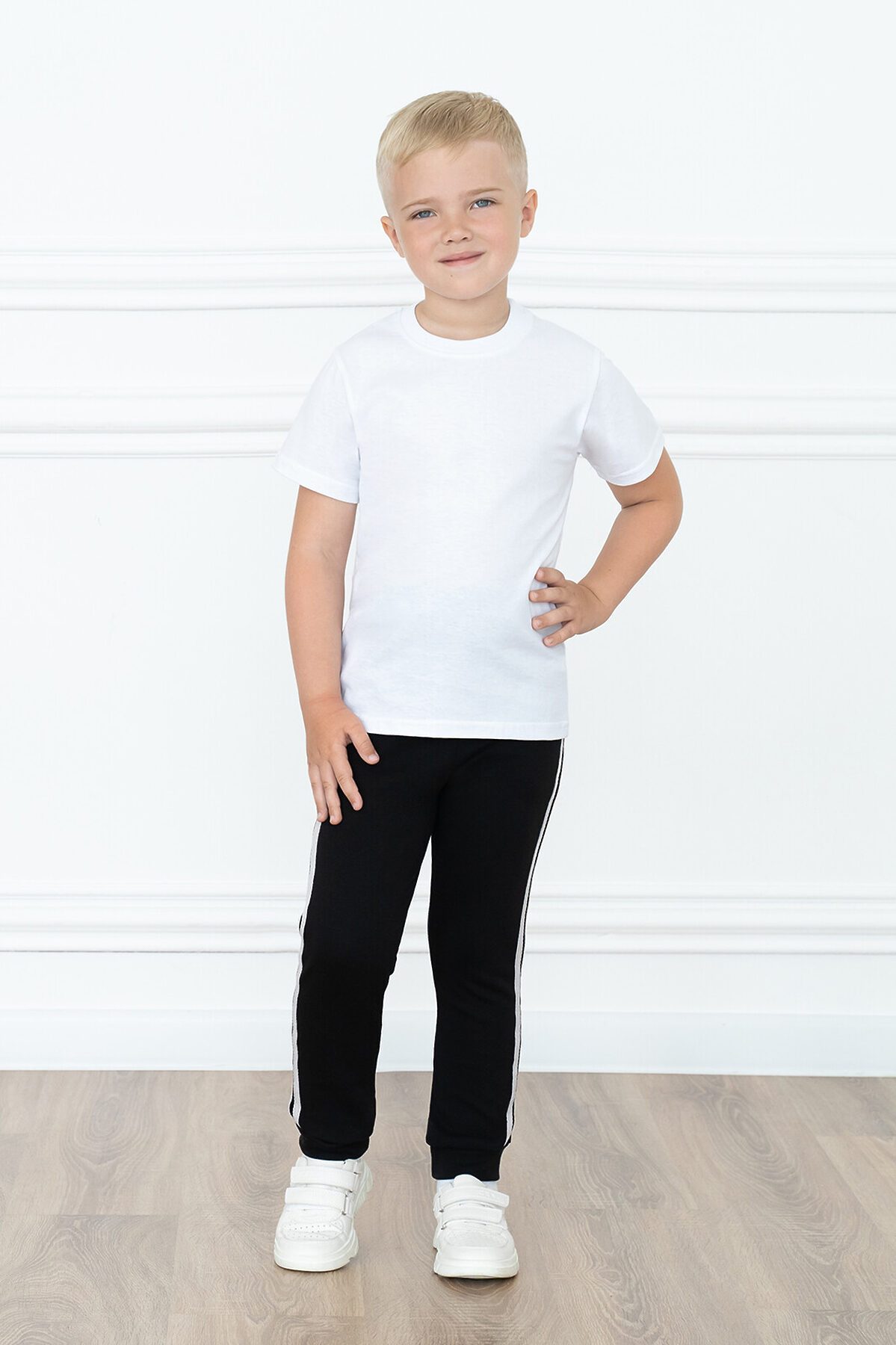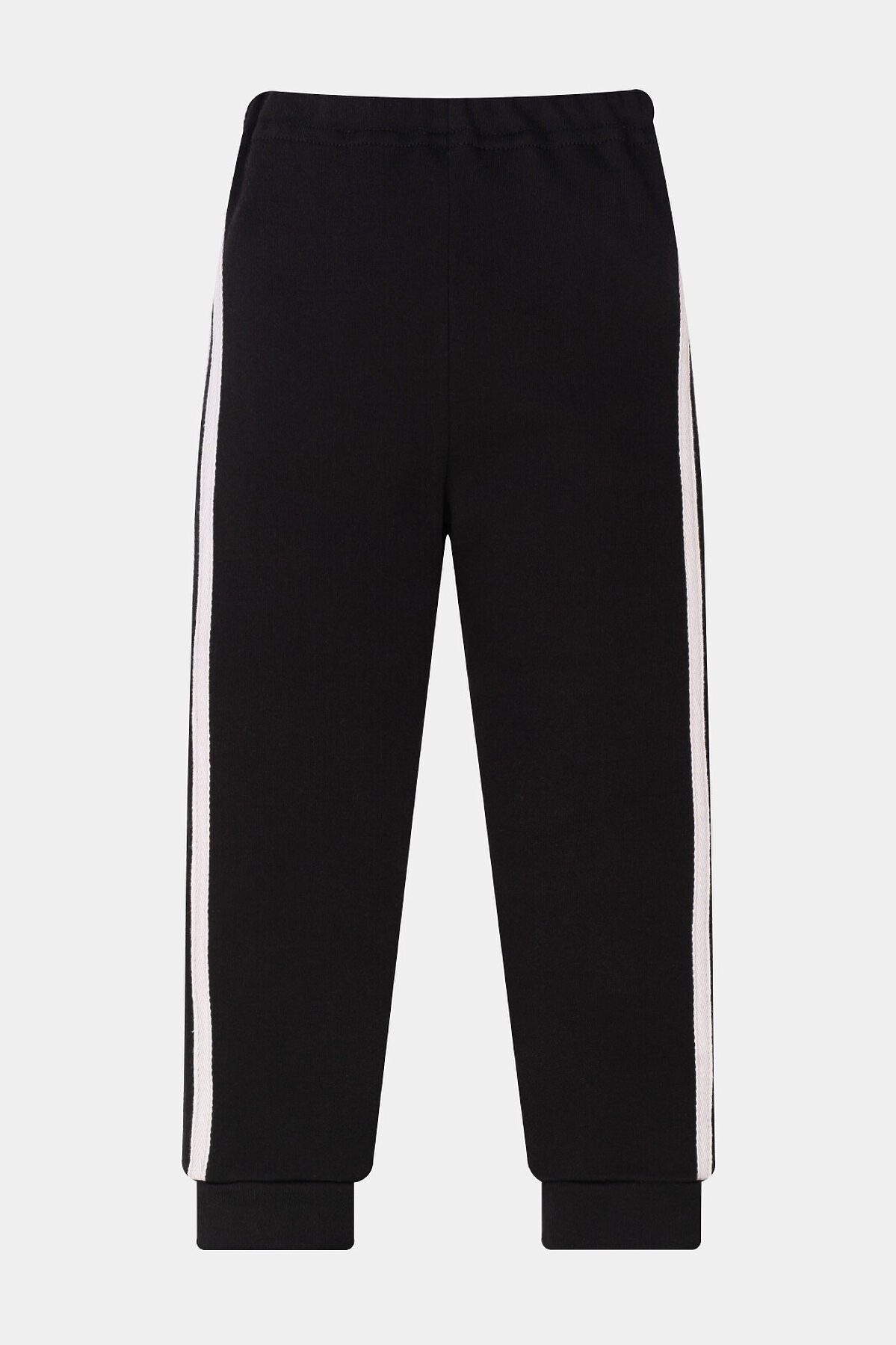 Детские трикотажные домашние штанишки черного цвета для мальчиков и девочек. Подходят для повседневной носки дома, прогулок на улице и занятий спортом. Сшиты из мягкого и нежного хлопкового трикотажа. Полуприлегающий силуэт. Пояс на резинке. По низу штанин двуслойные манжеты. По бокам две декоративные белые полоски (лампасы). >