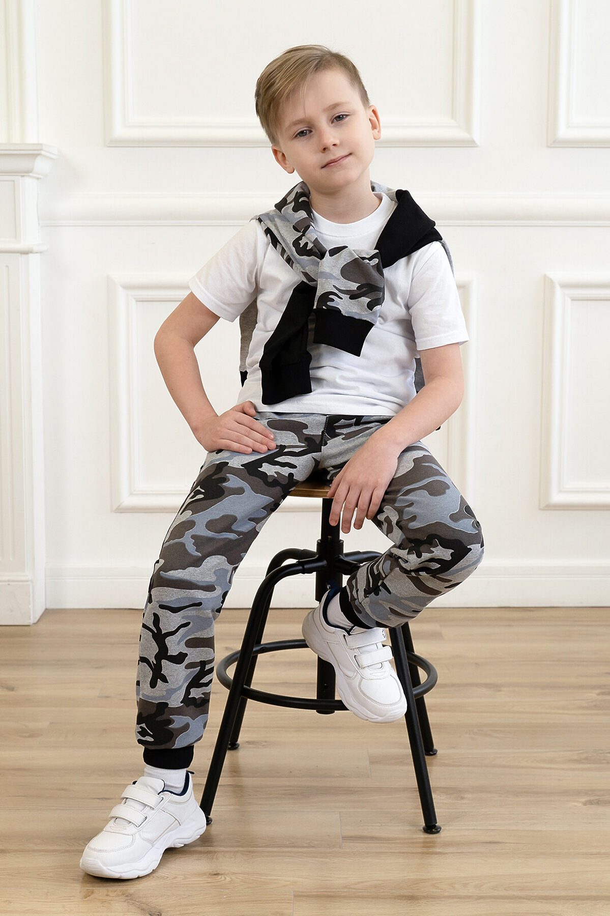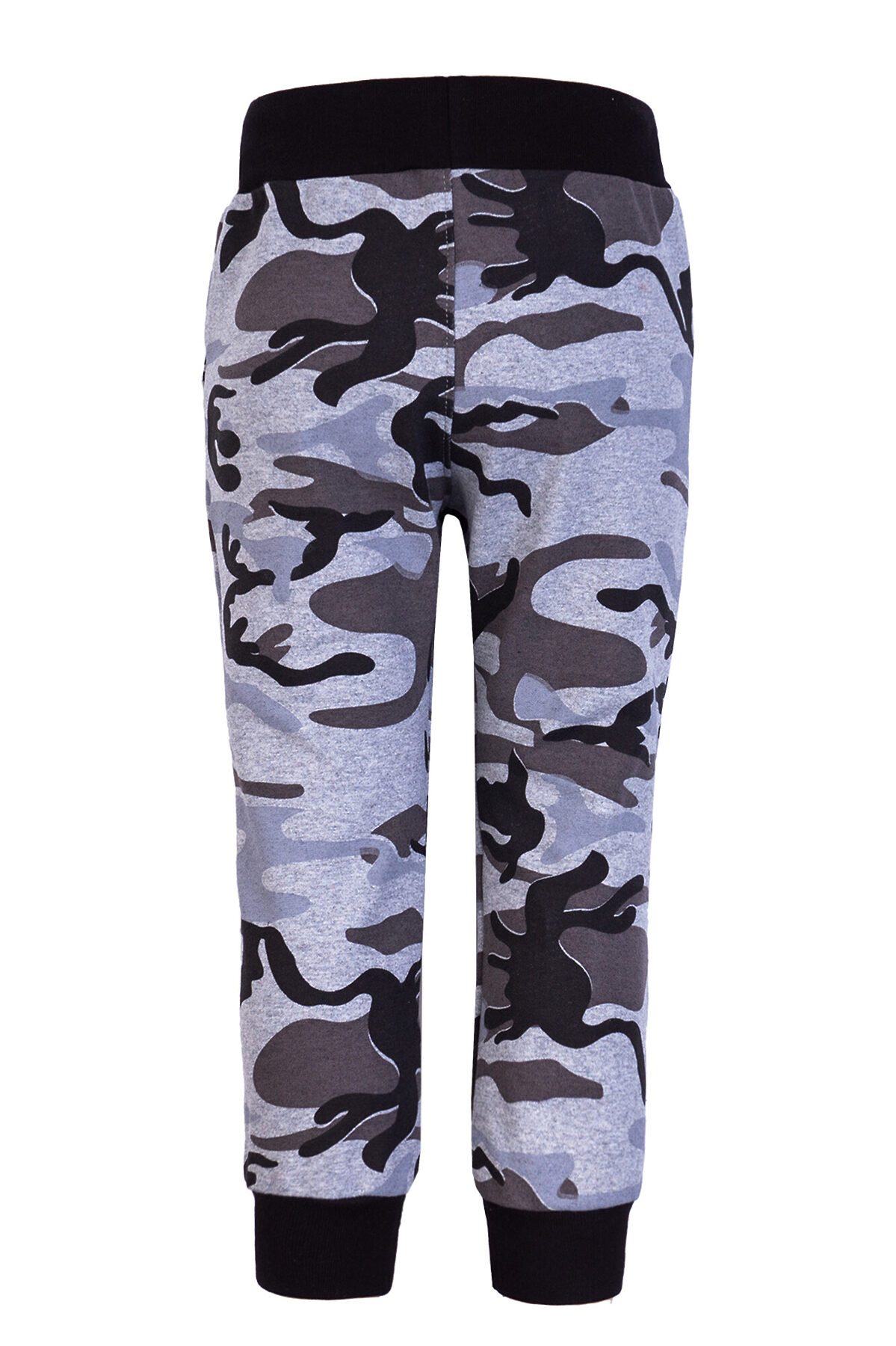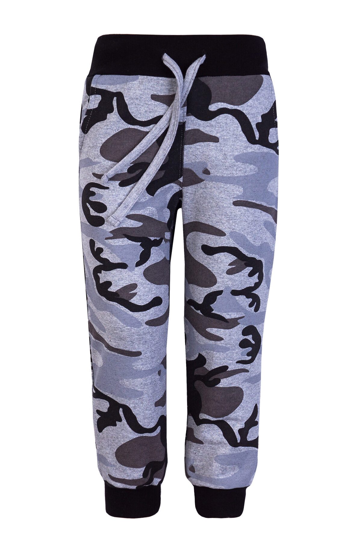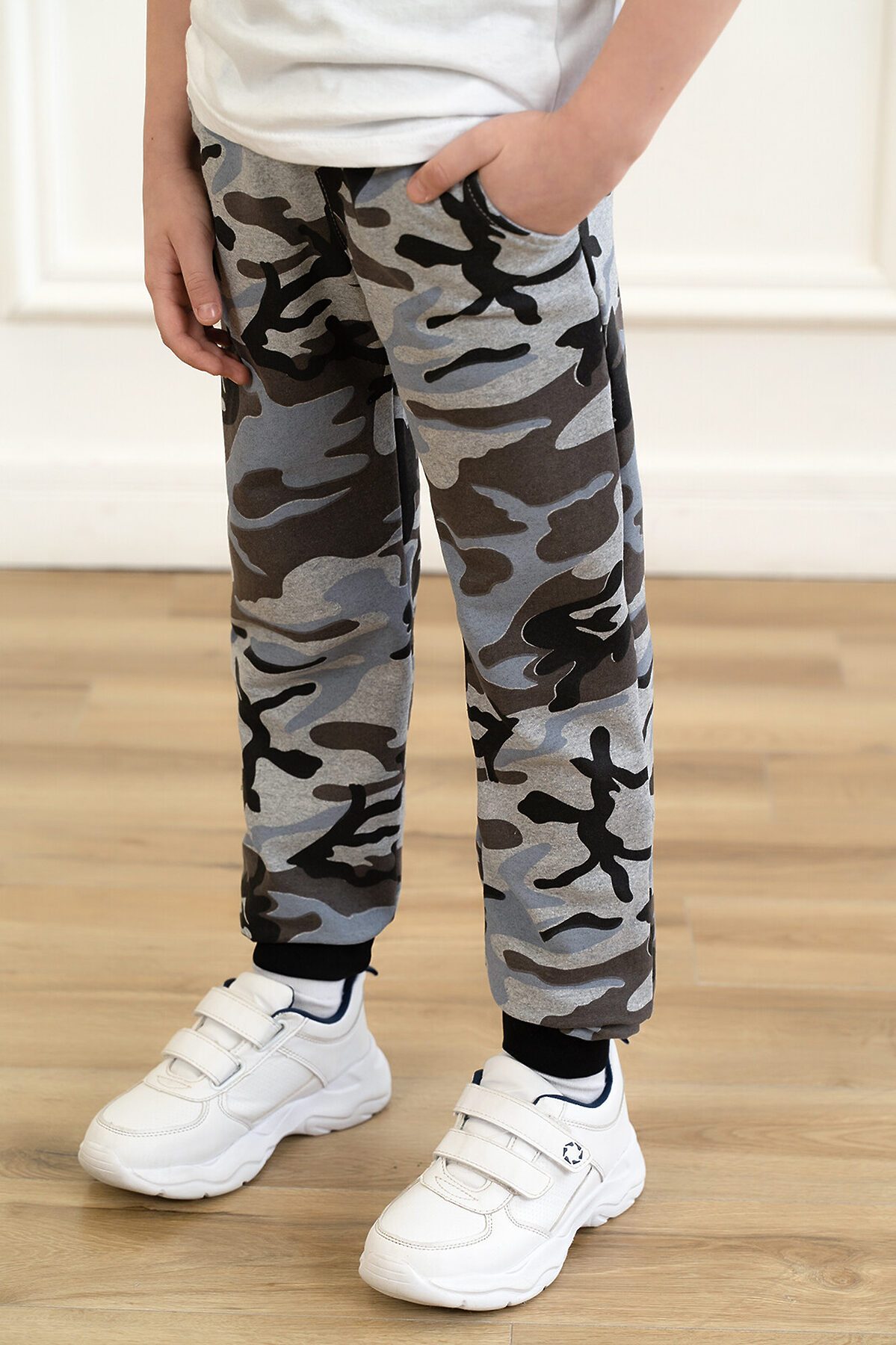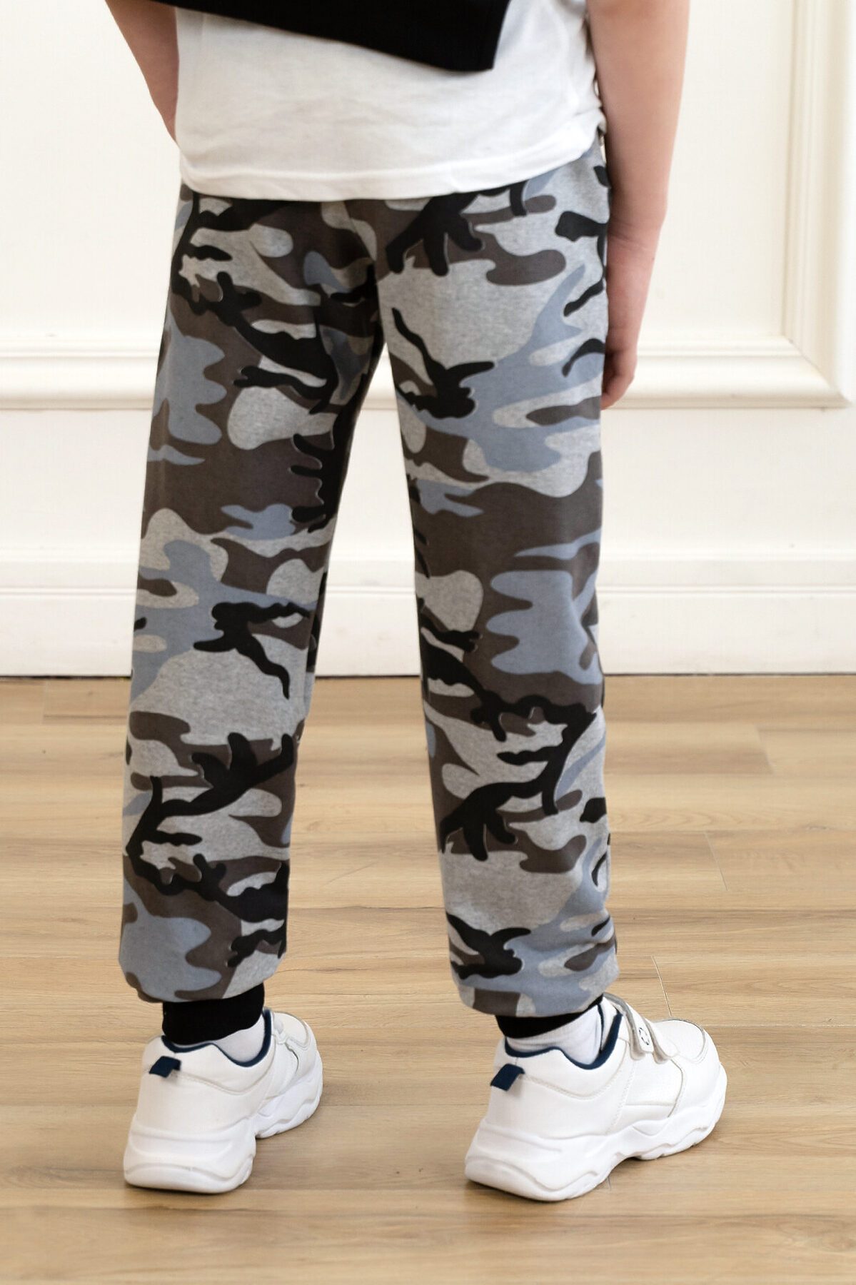 Детские трикотажные штаны из футера двухнитки для мальчиков и девочек серого камуфляжного цвета. Можно носить дома, в детском саду, школе и на улице. Свободный крой, по бокам карманы. Широкий эластичный пояс с трикотажным шнуром для регулировки на талии. По низу штанин трикотажные манжеты. >