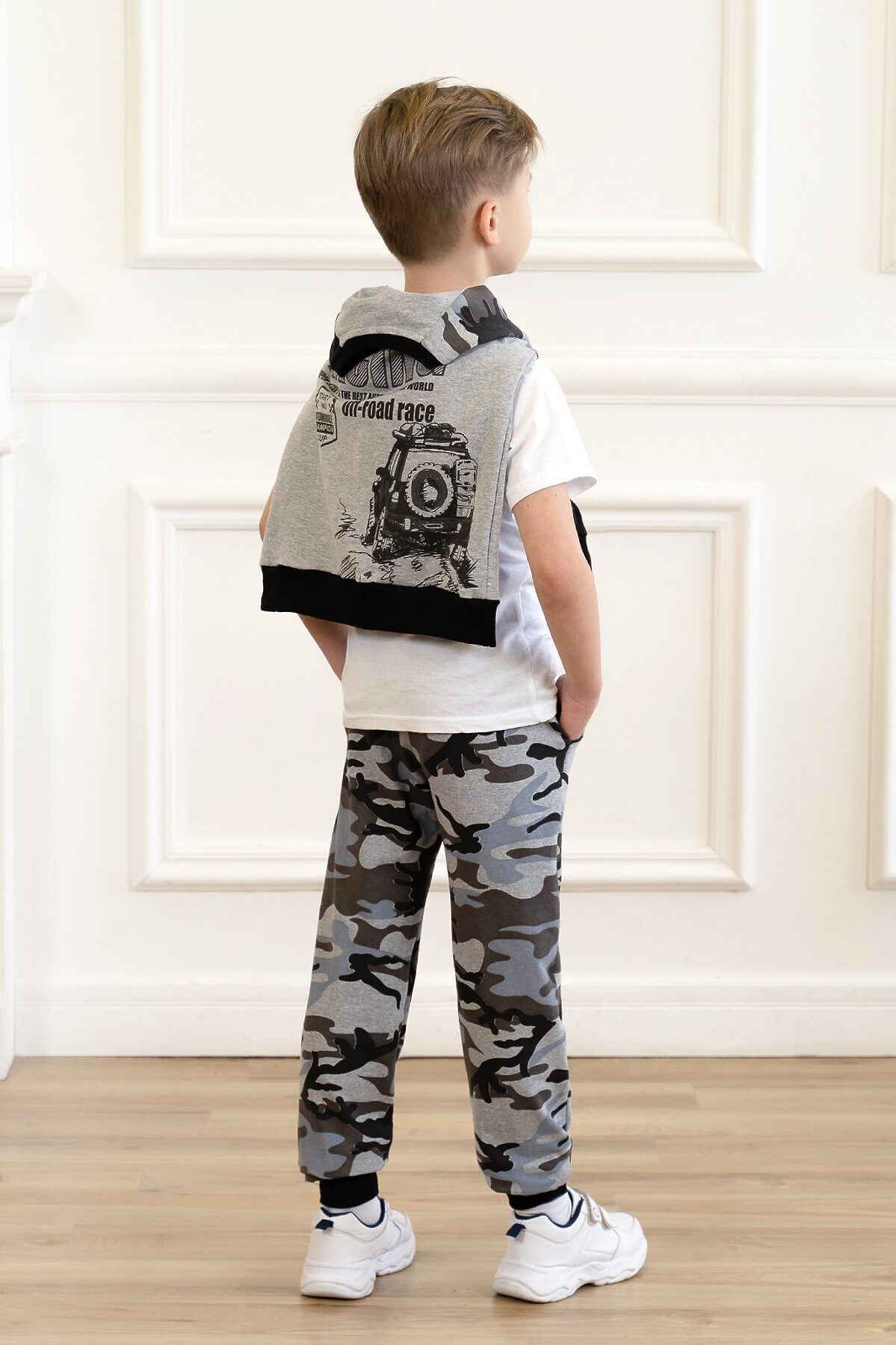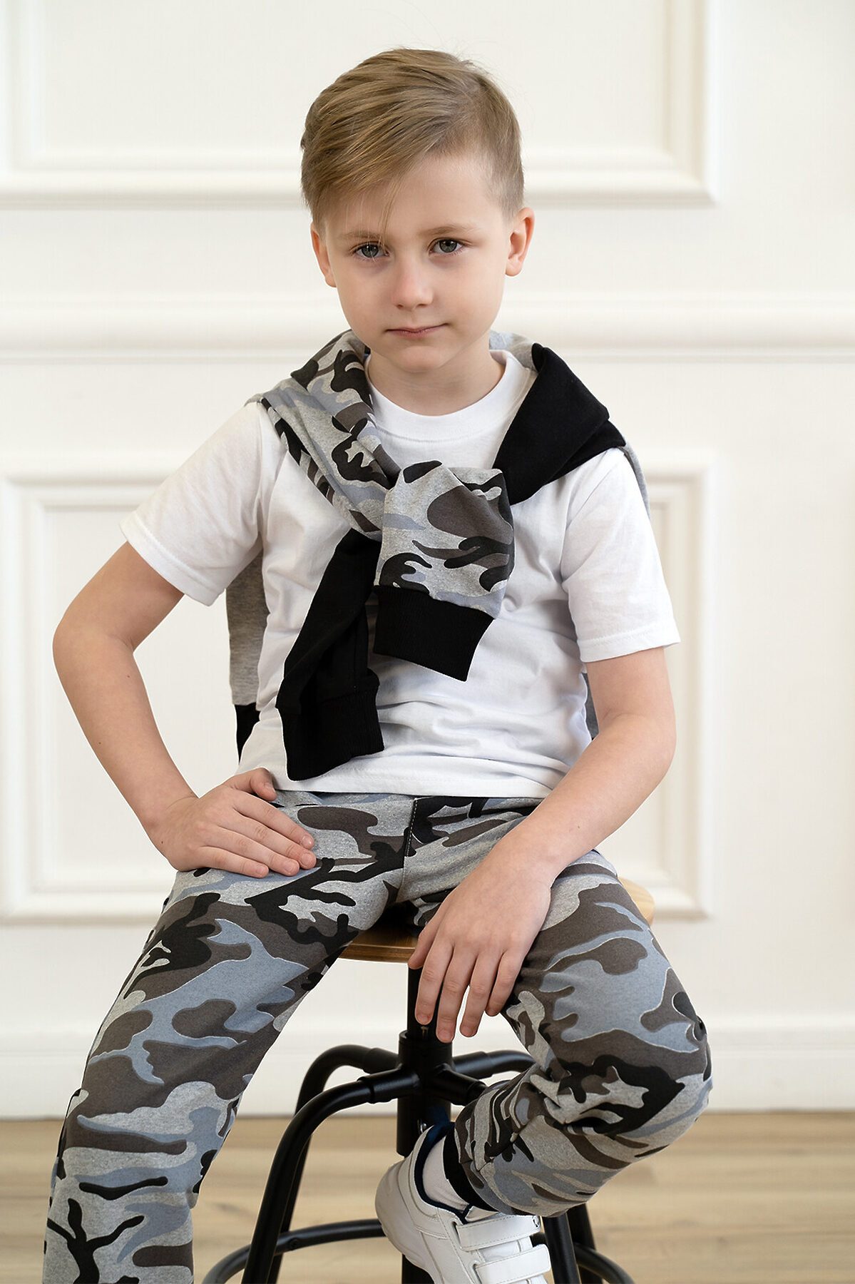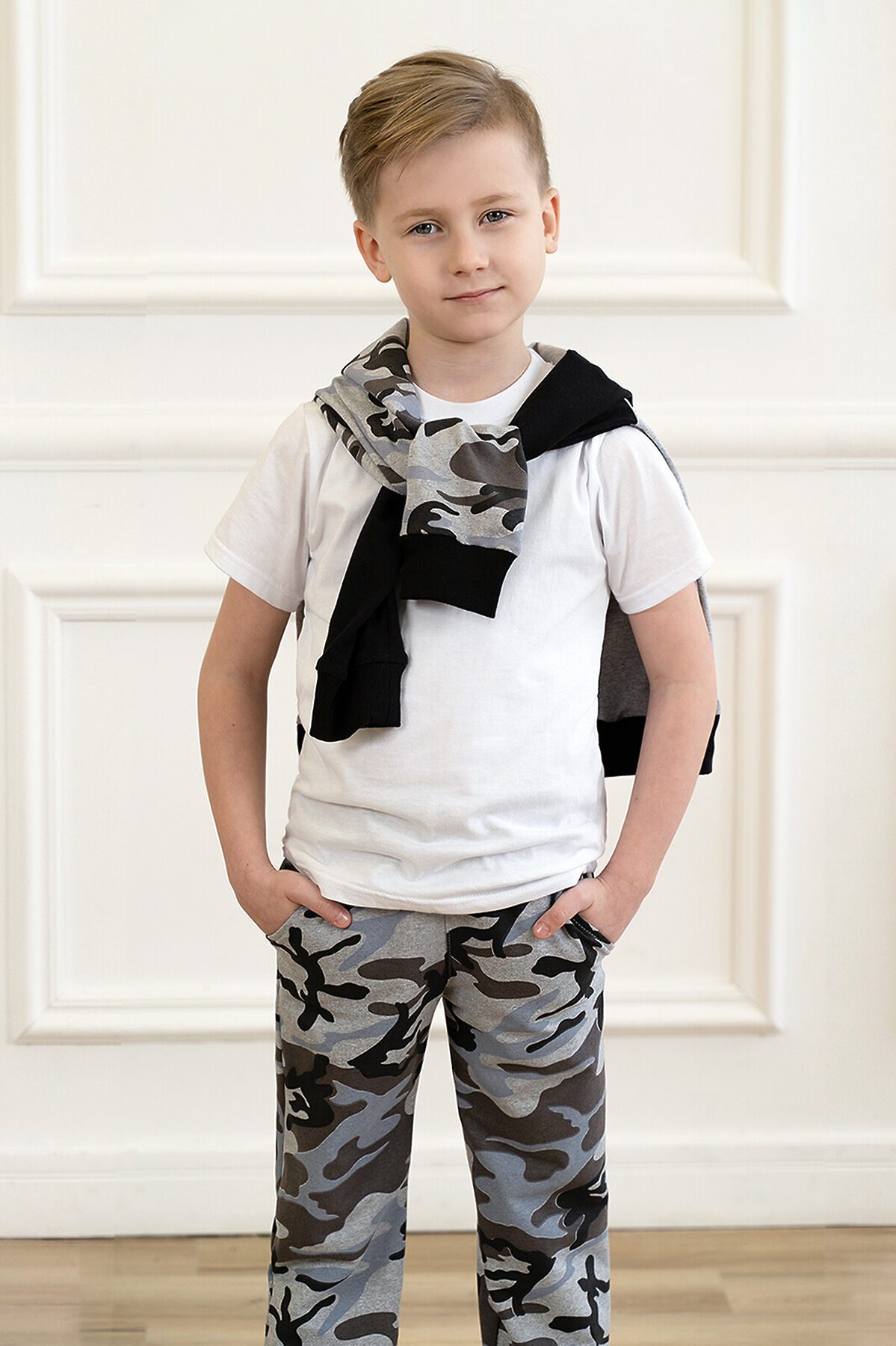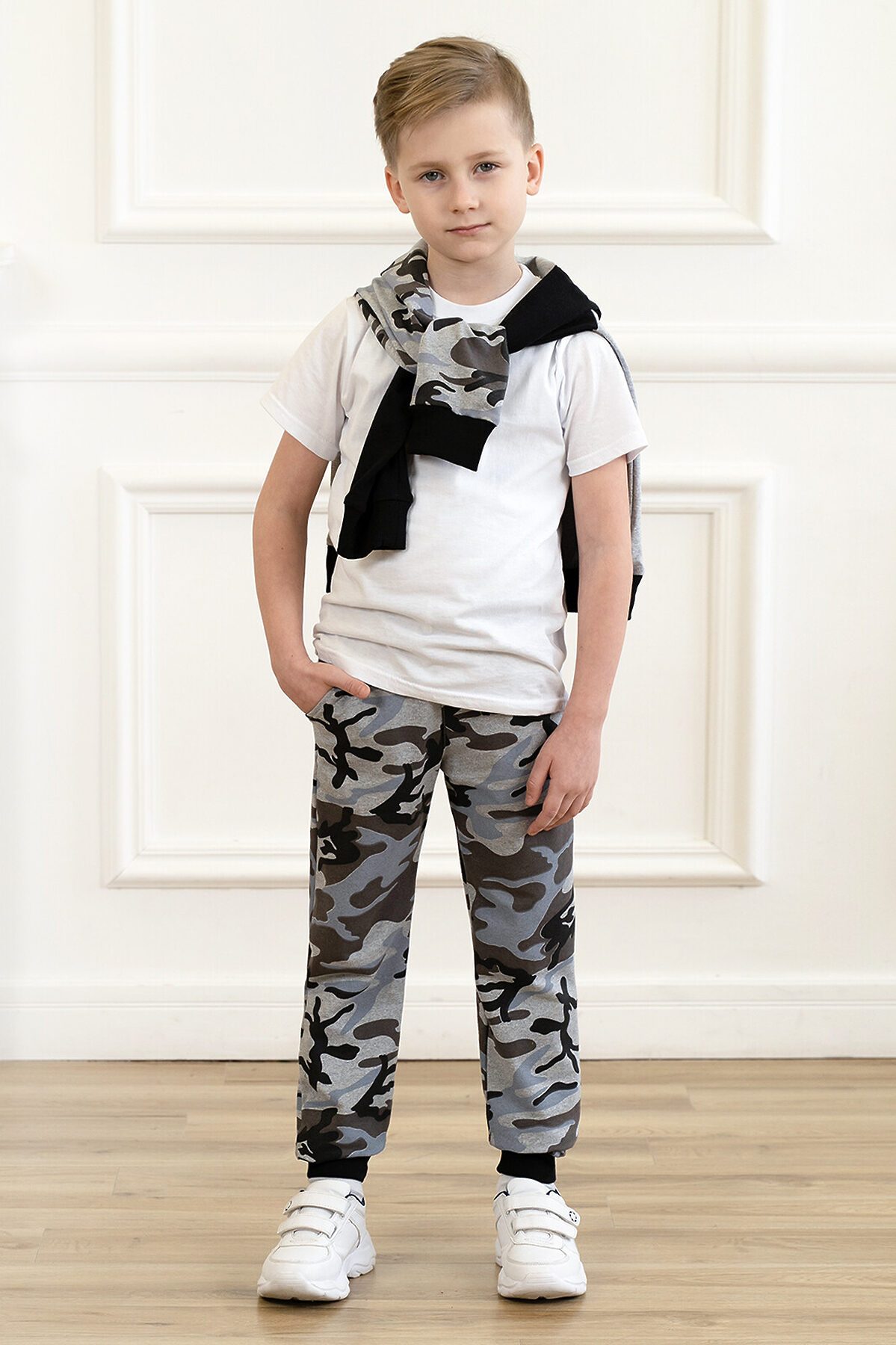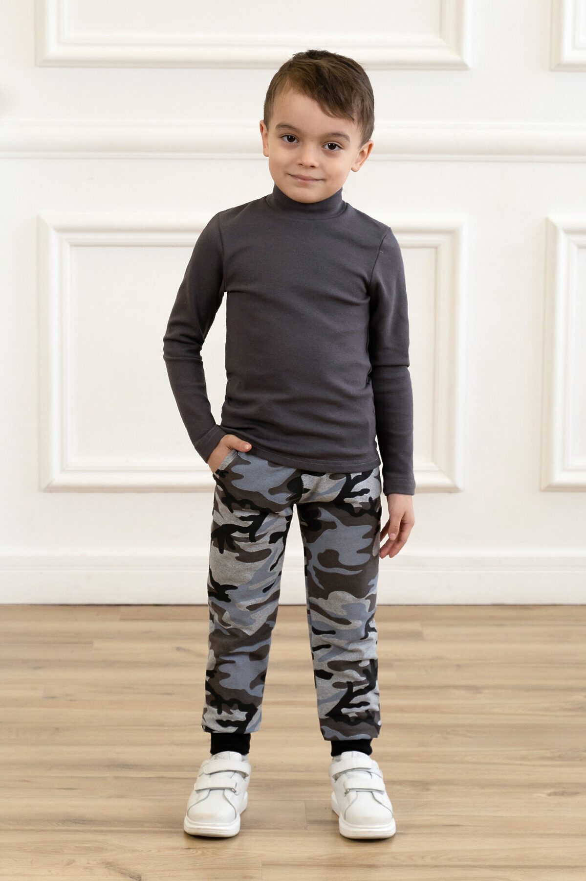 Детские трикотажные штаны из футера двухнитки для мальчиков и девочек серого камуфляжного цвета. Можно носить дома, в детском саду, школе и на улице. Свободный крой, по бокам карманы. Широкий эластичный пояс с трикотажным шнуром для регулировки на талии. По низу штанин трикотажные манжеты. >