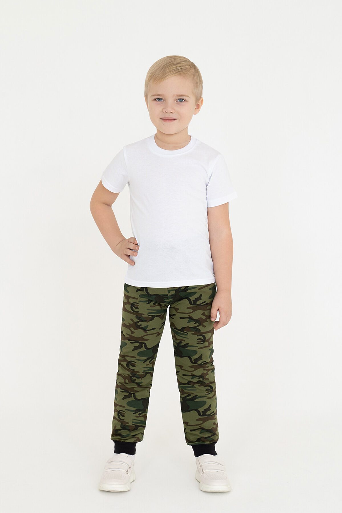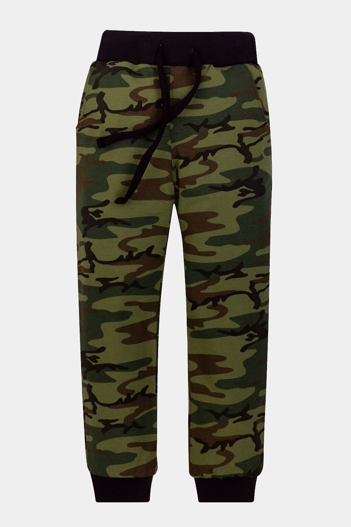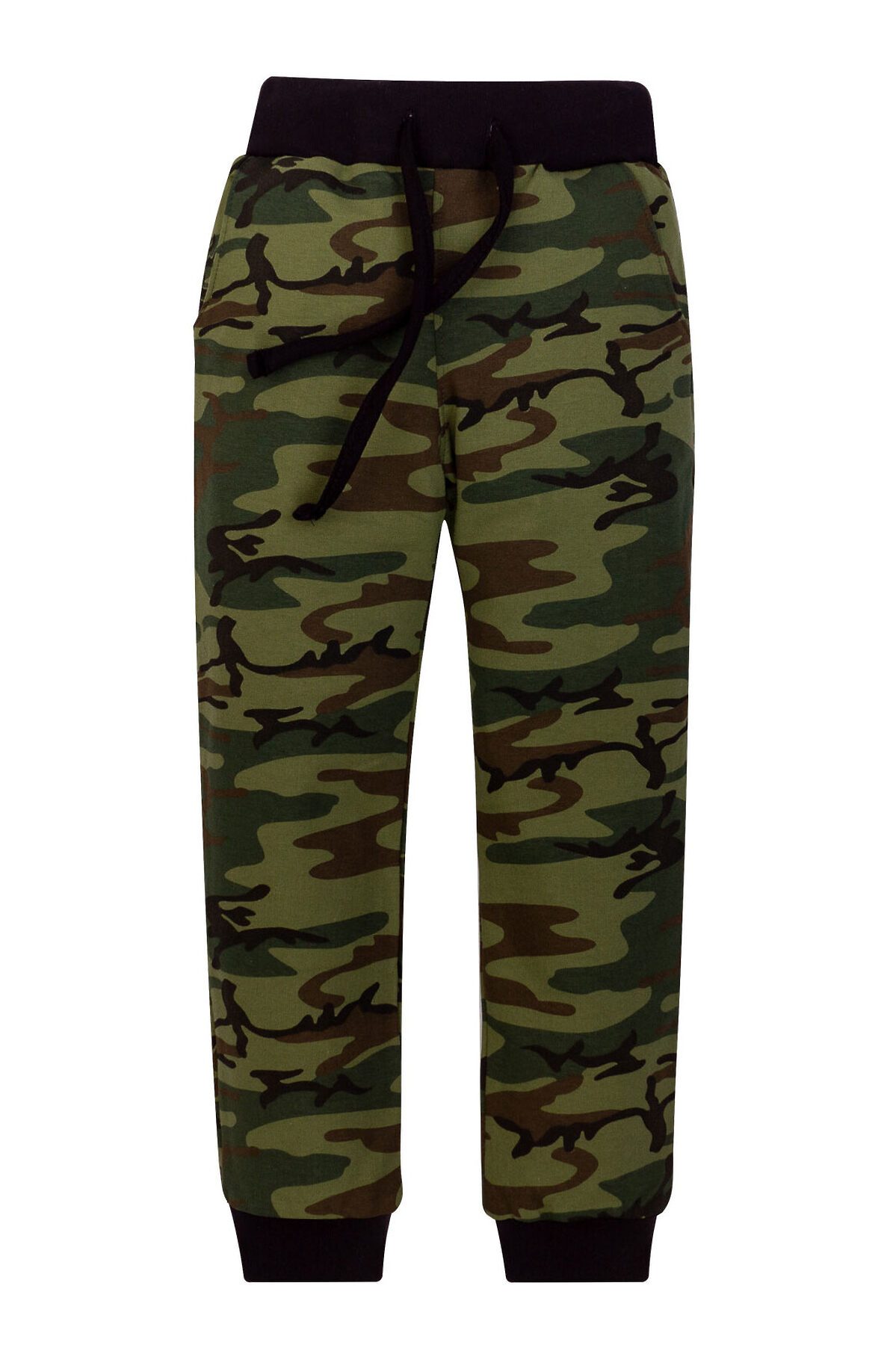 Детские трикотажные штаны из футера двухнитки для мальчиков и девочек зеленого (хаки) камуфляжного цвета. Можно носить дома, в детском саду, школе и на улице. Свободный крой, по бокам карманы. Широкий эластичный пояс с трикотажным шнуром для регулировки на талии. По низу штанин трикотажные манжеты. >