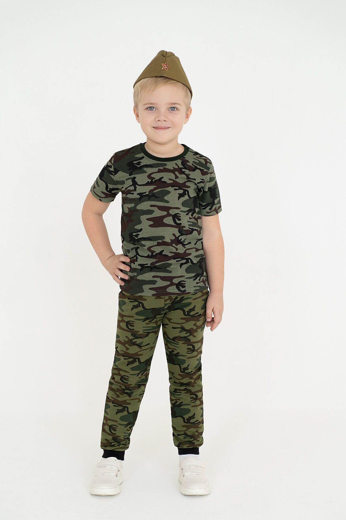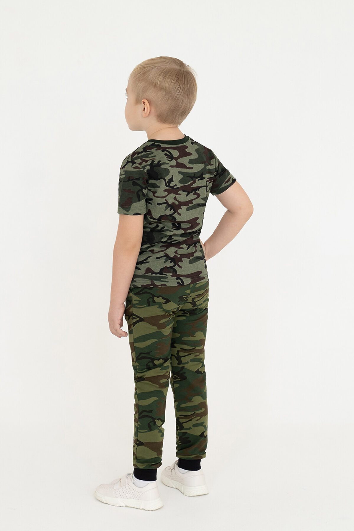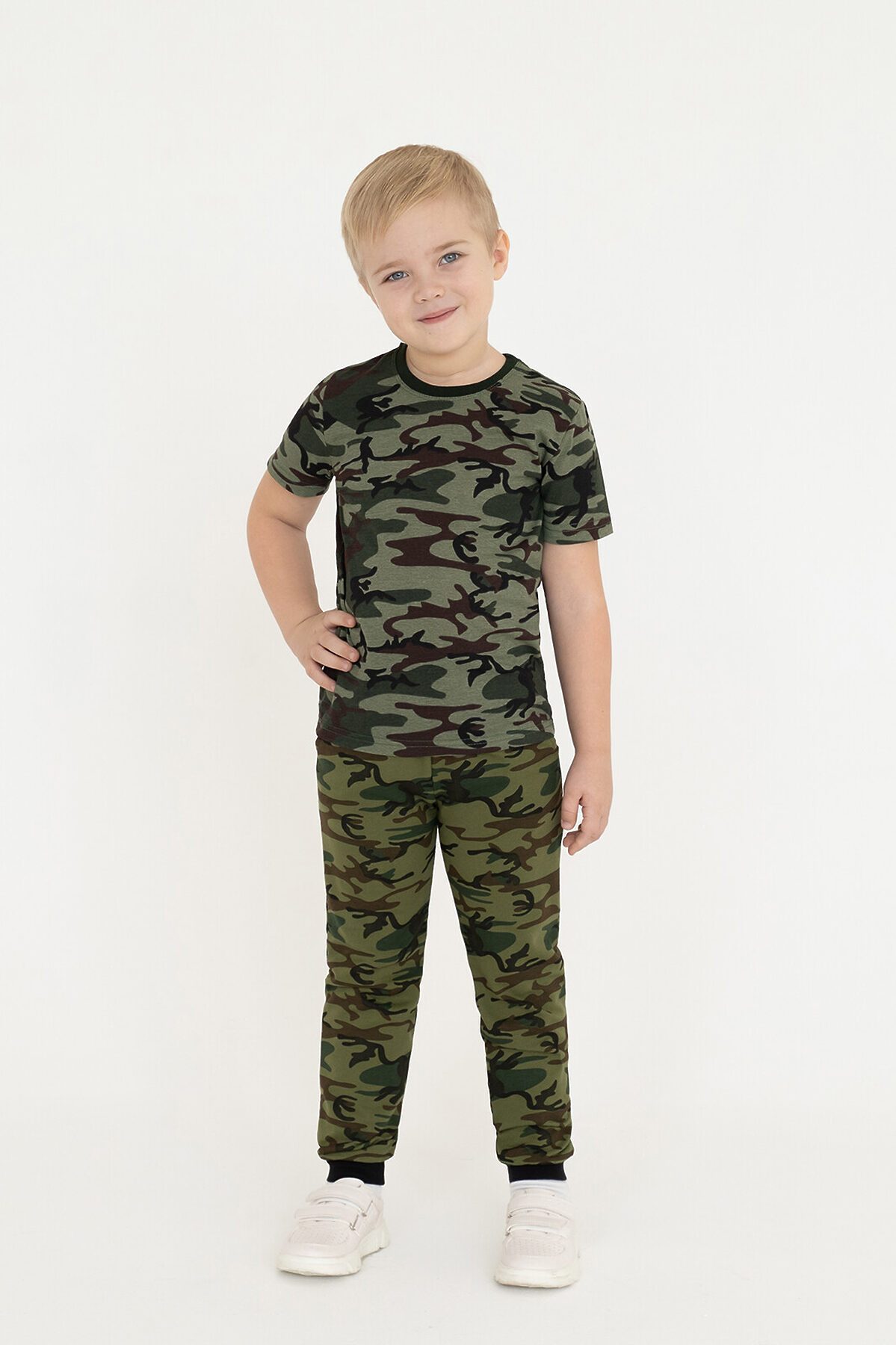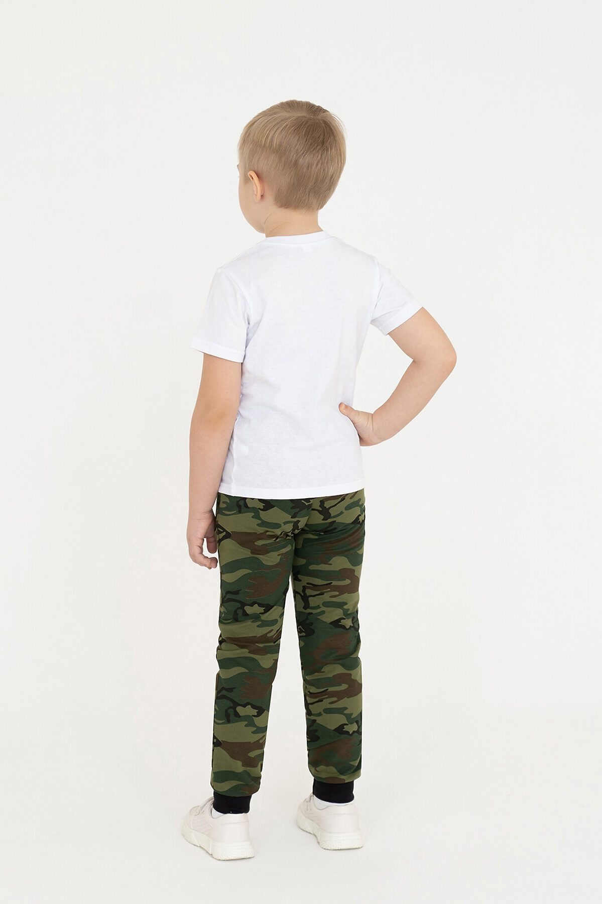 Детские трикотажные штаны из футера двухнитки для мальчиков и девочек зеленого (хаки) камуфляжного цвета. Можно носить дома, в детском саду, школе и на улице. Свободный крой, по бокам карманы. Широкий эластичный пояс с трикотажным шнуром для регулировки на талии. По низу штанин трикотажные манжеты. >