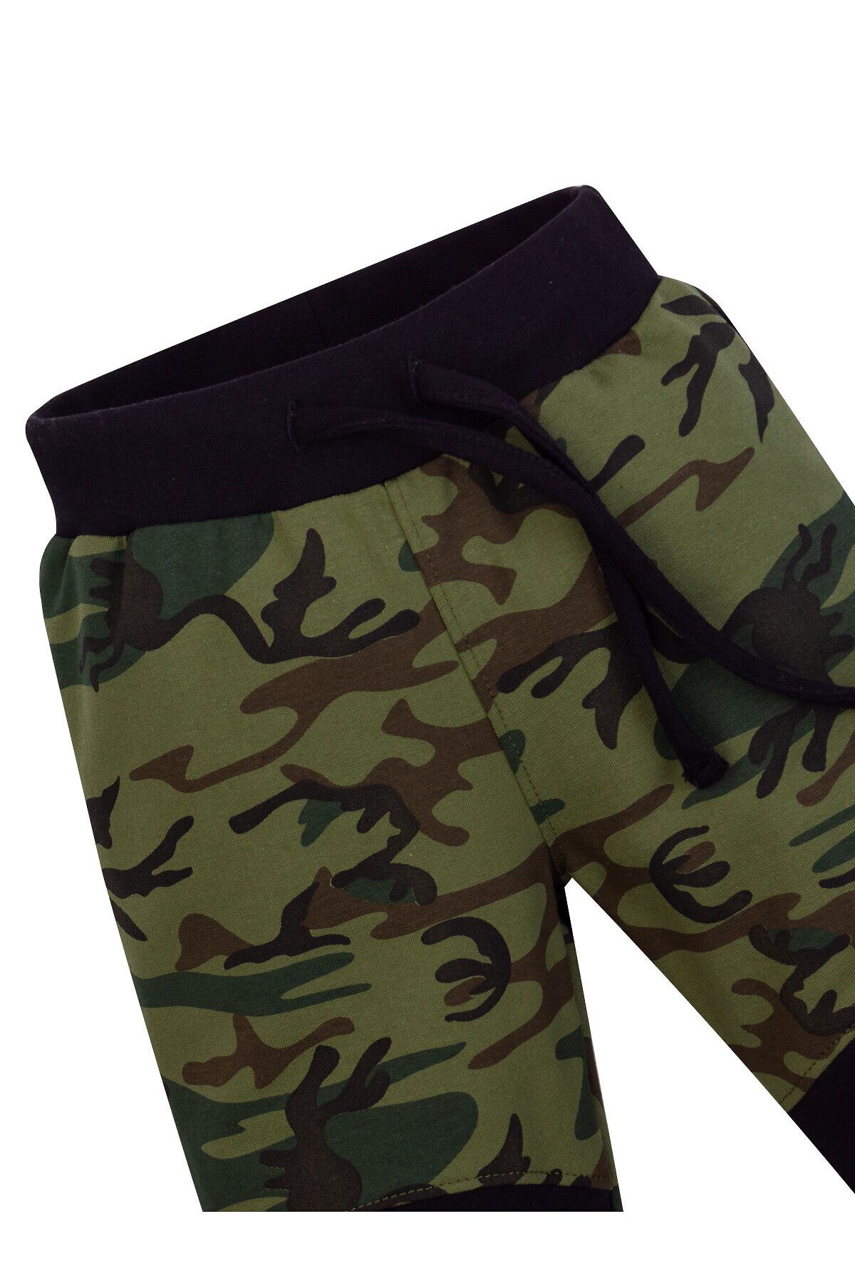 Детские трикотажные брюки камуфляжного цвета. Широкий пояс на манжете с резинкой и шнуром для утяжки. По низу штанин также манжеты. Спереди до середины колена однотонная вставка в цвет брюк. Практичные, подходят для ежедневной носки для мальчиков и девочек. >