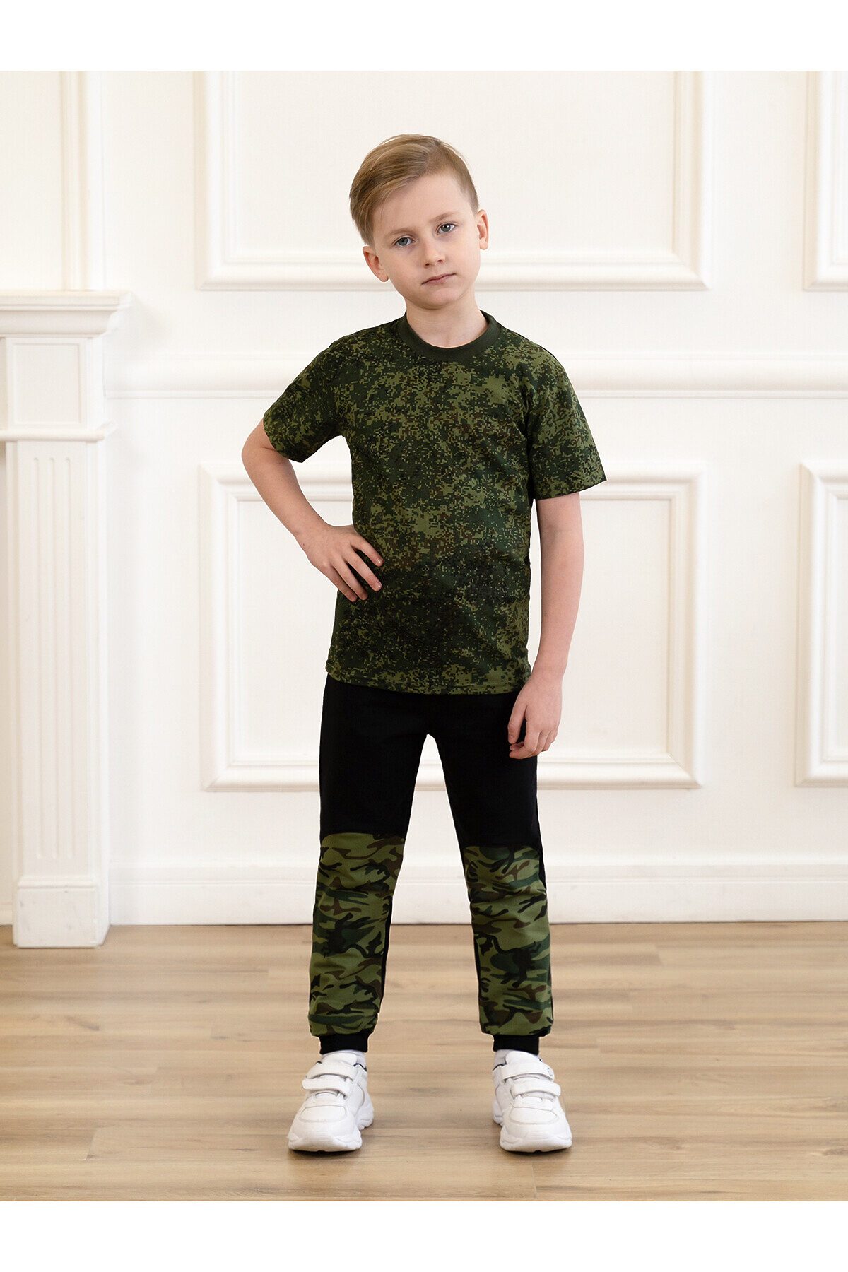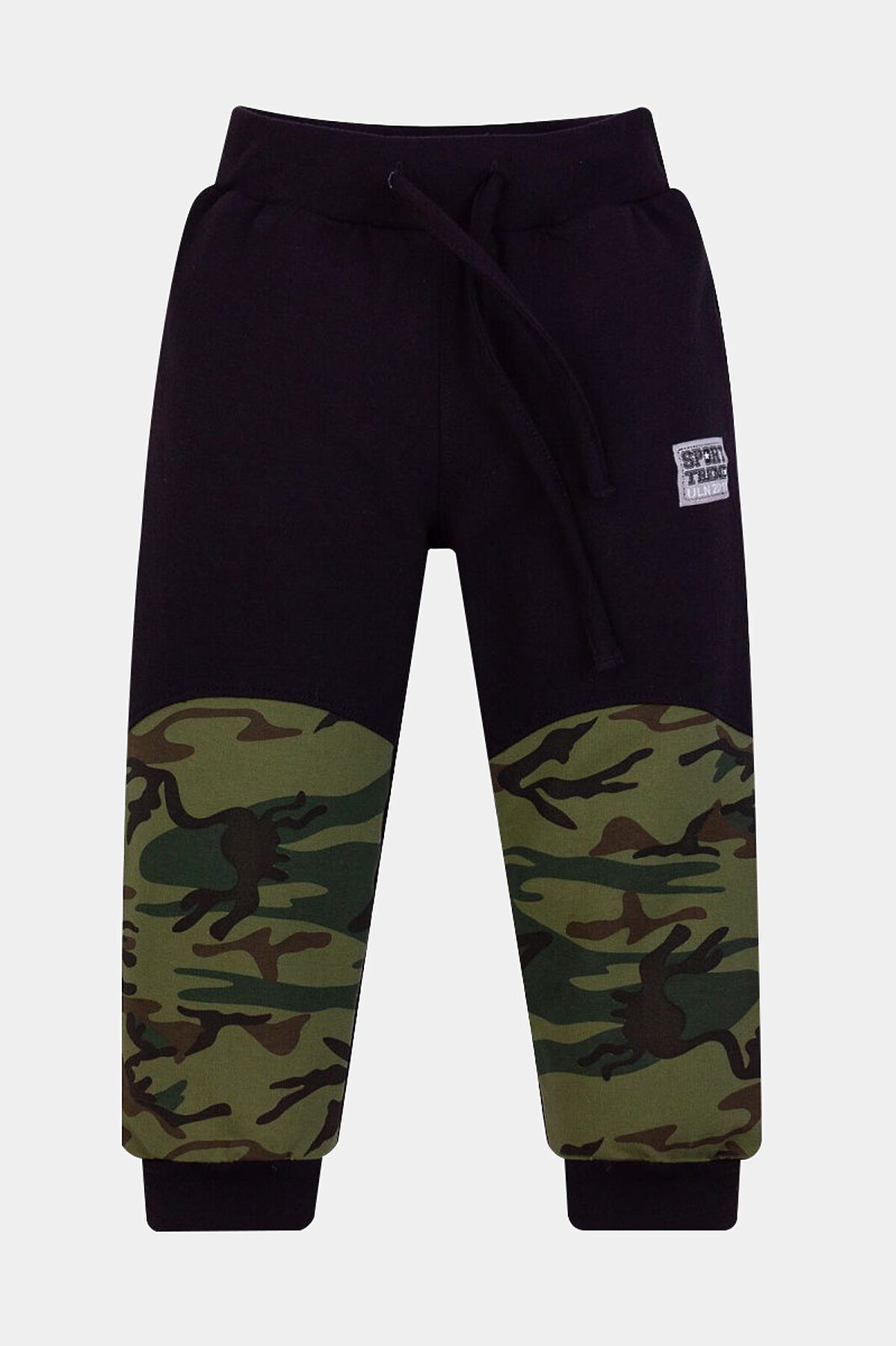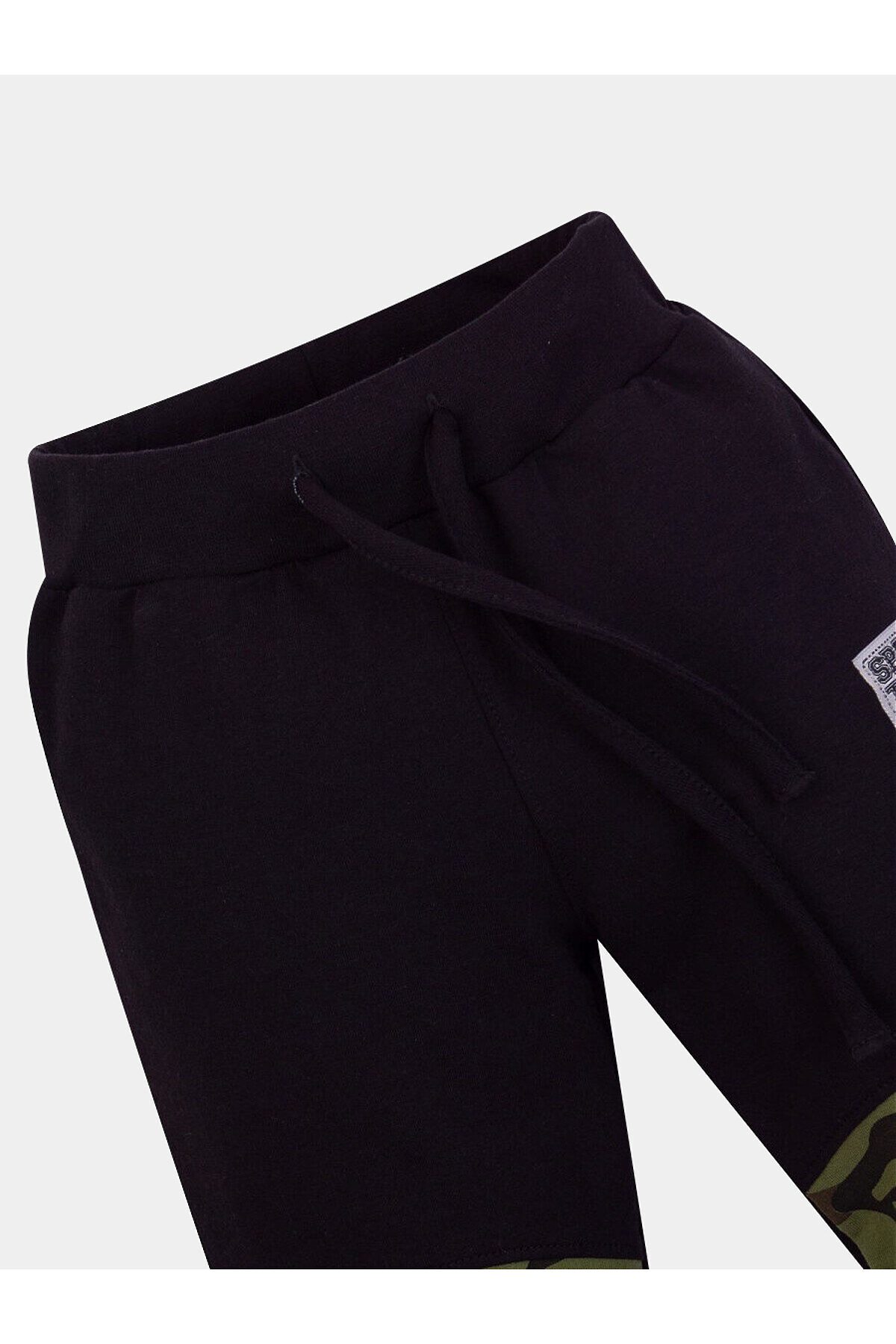 Практичные брюки, сшитые в спортивном стиле, оценят и дети, и взрослые. Изделие выполнено из плотного футера черного цвета с добавлением лайкры, благодаря которой штаны не покроются катышками, дольше сохранят свой первоначальный вид. В пояс брюк вставлен широкий трикотажный шнурок, низ штанин обработан манжетами. Спереди вставки зеленый камуфляж ниже колен и небольшая нашивка. >