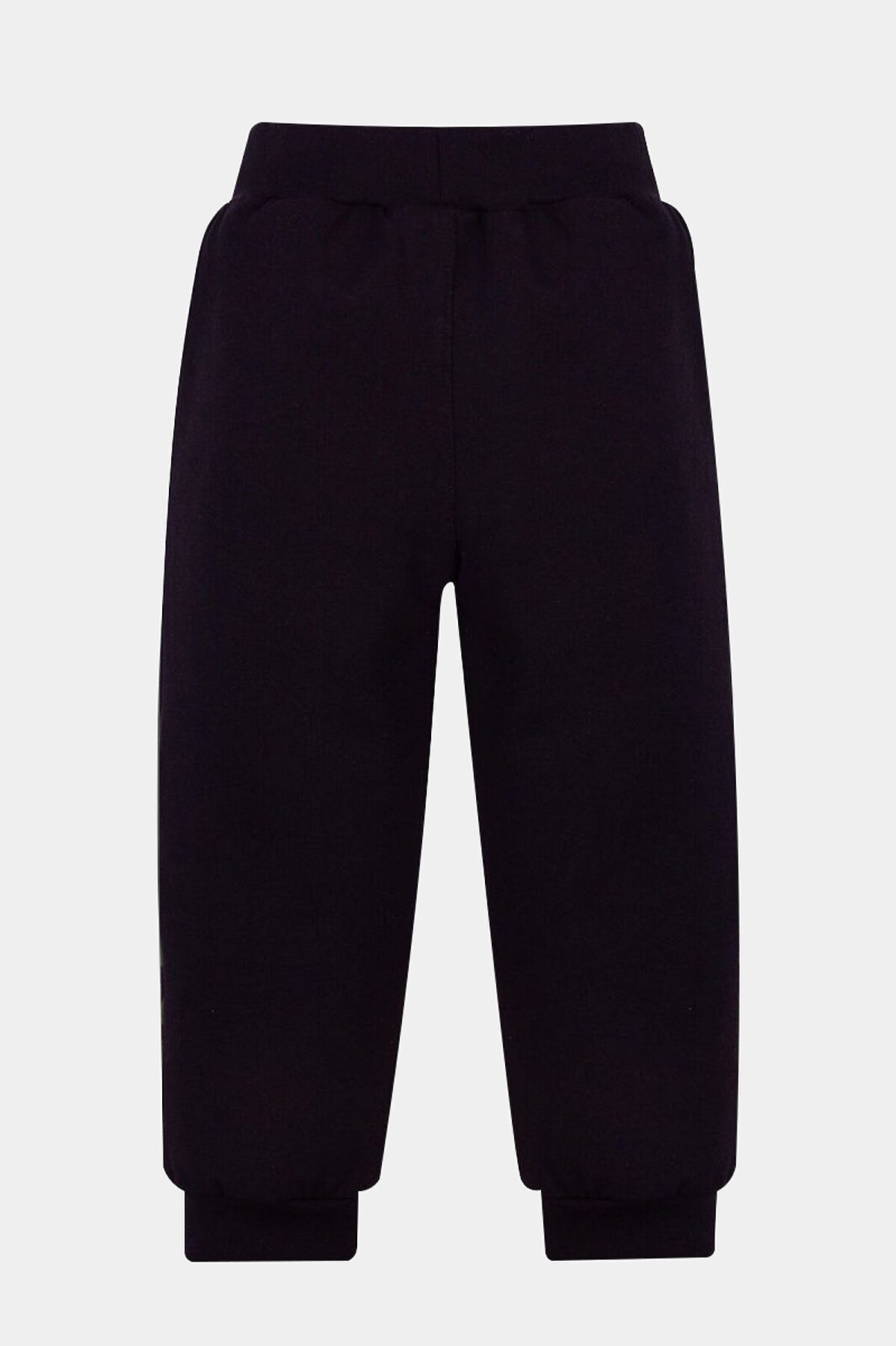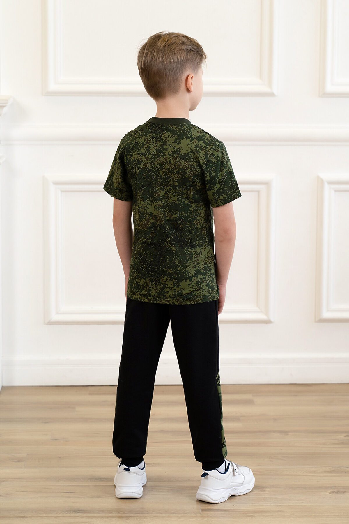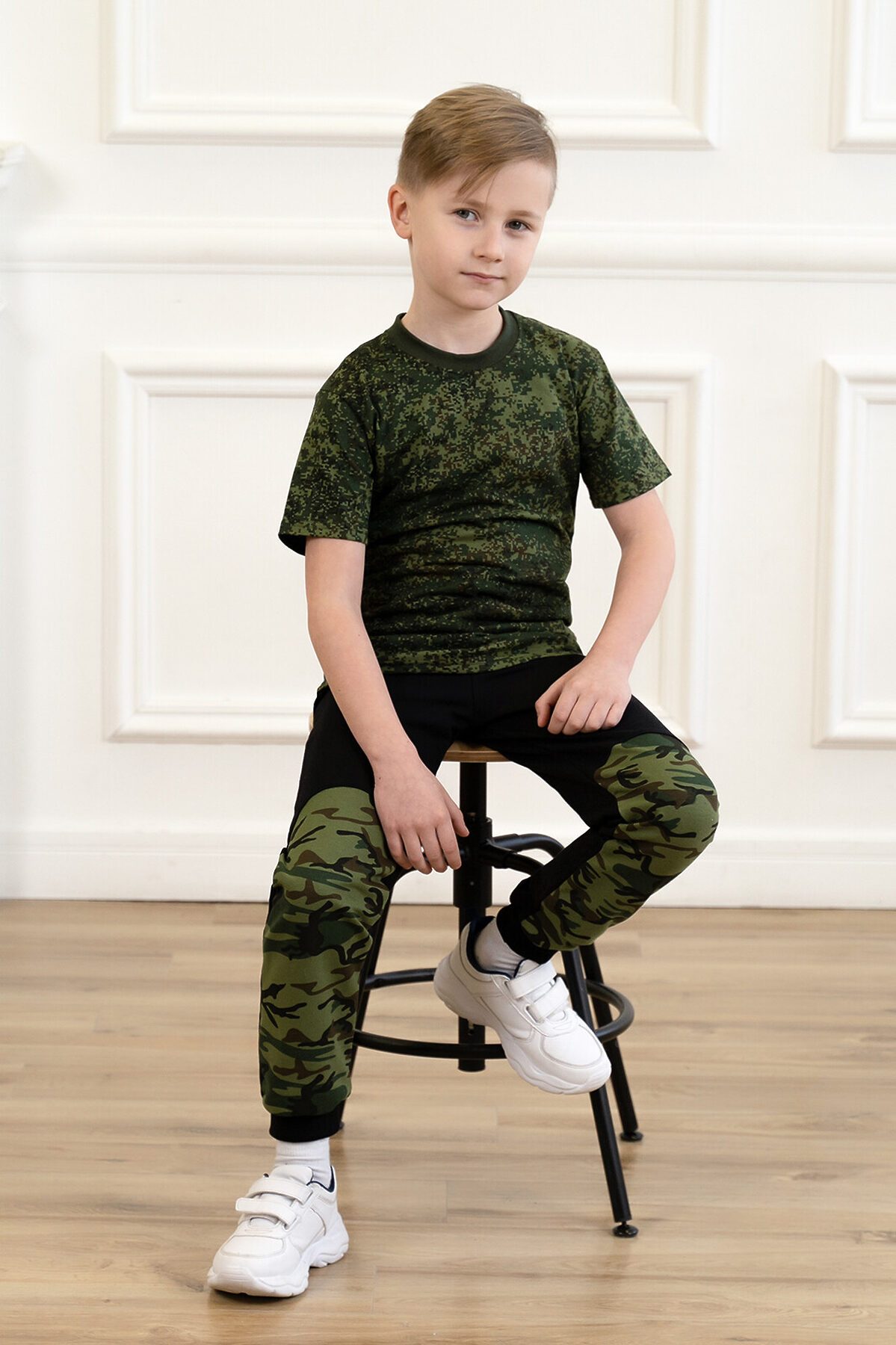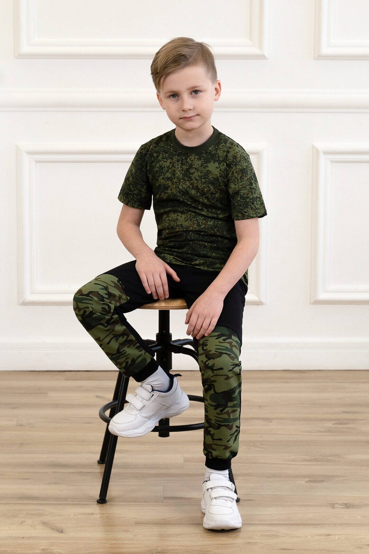 Практичные брюки, сшитые в спортивном стиле, оценят и дети, и взрослые. Изделие выполнено из плотного футера черного цвета с добавлением лайкры, благодаря которой штаны не покроются катышками, дольше сохранят свой первоначальный вид. В пояс брюк вставлен широкий трикотажный шнурок, низ штанин обработан манжетами. Спереди вставки зеленый камуфляж ниже колен и небольшая нашивка. >