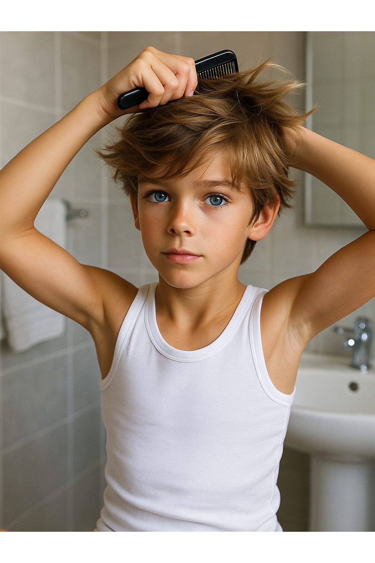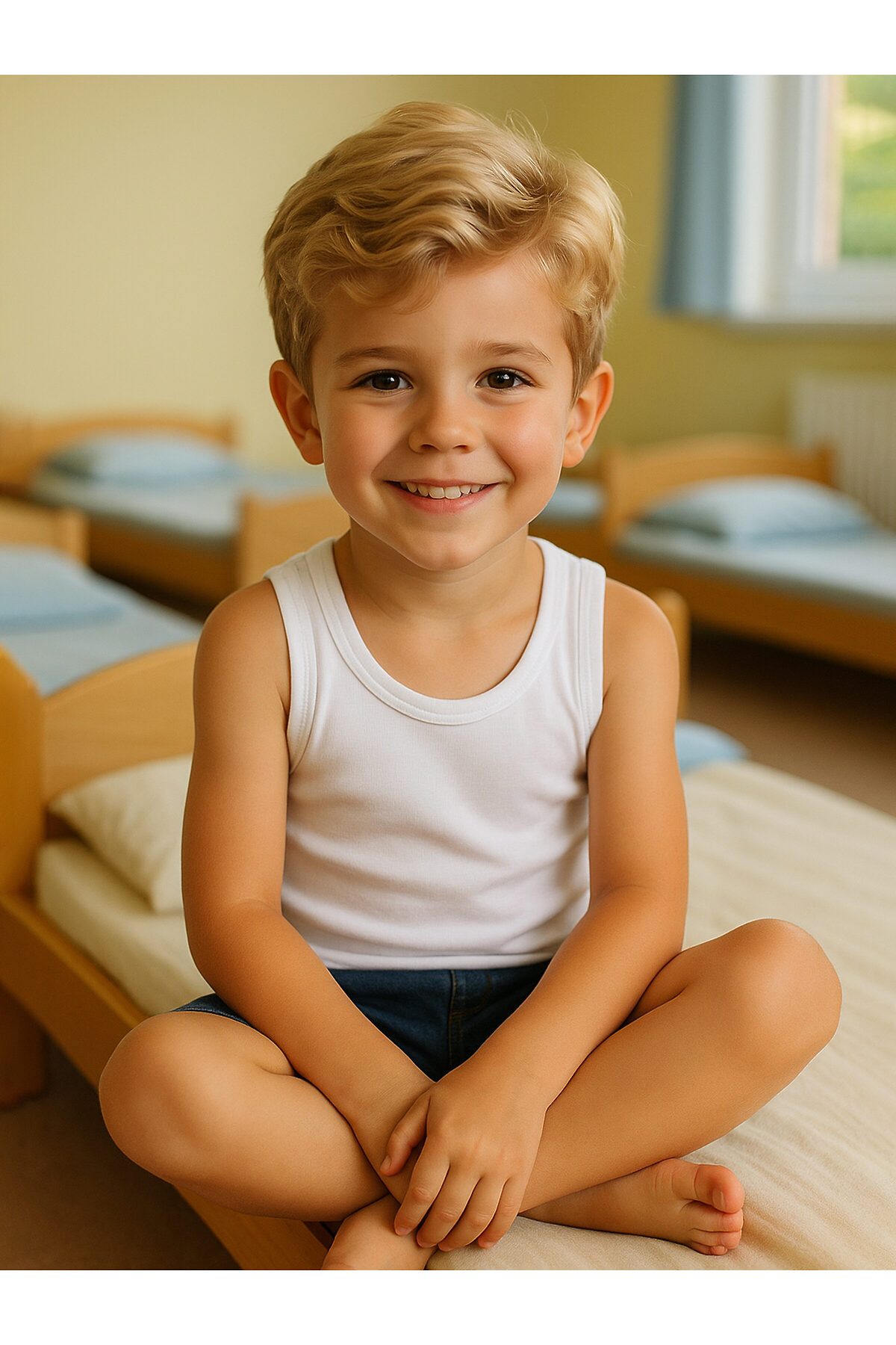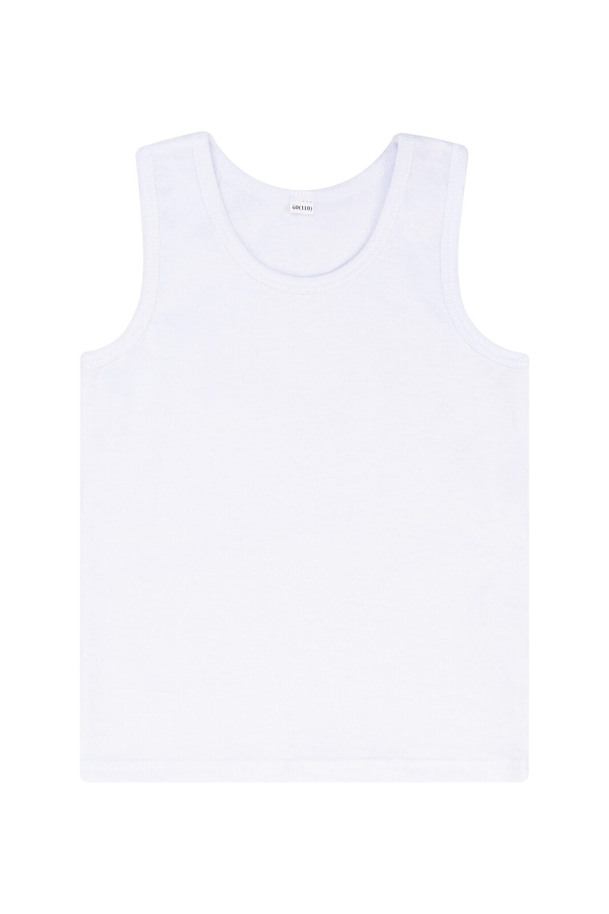 Лёгкий, приятный к телу, хорошо пропускающий воздух, гипоаллергенный трикотаж белого цвета. Горловина и пройма рукавов обработаны трикотажной бейкой. Низ подогнут и прошит. >
