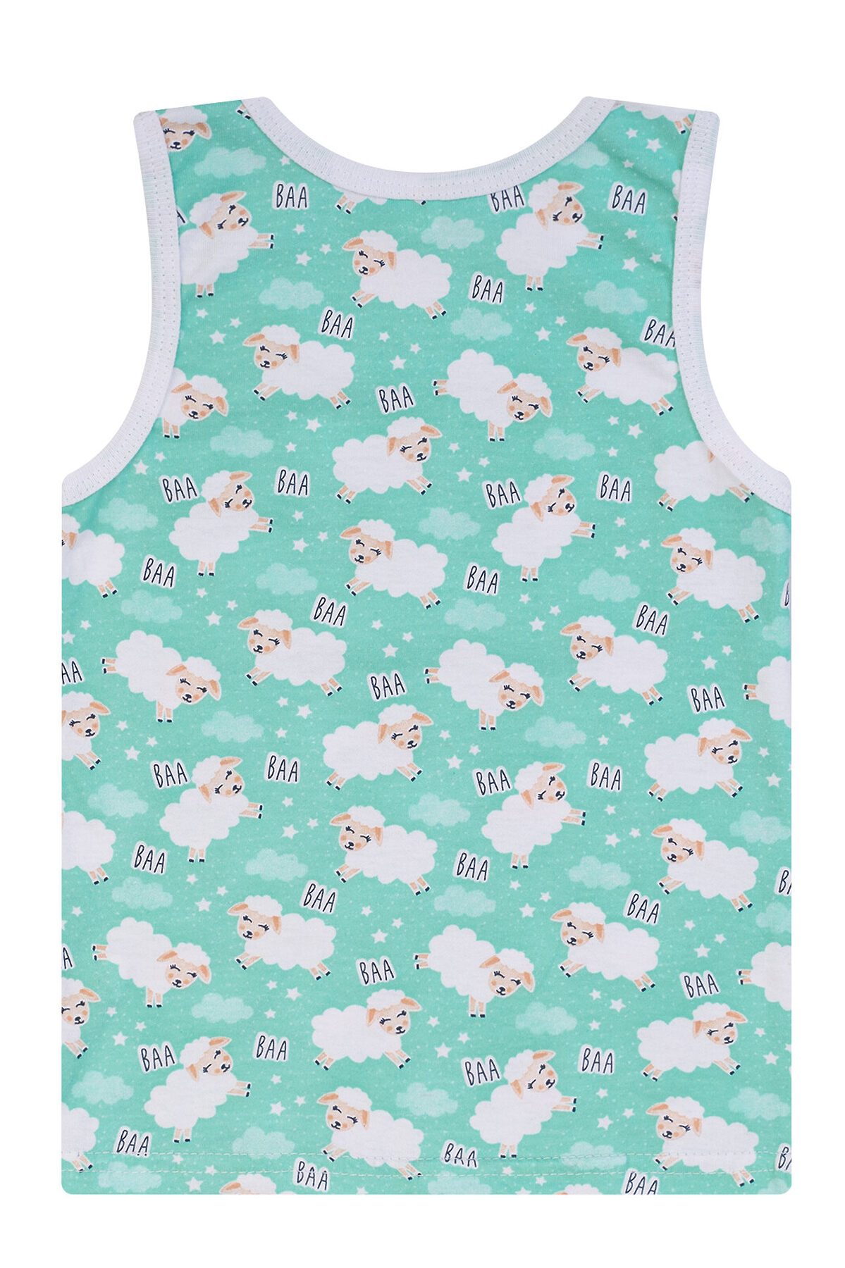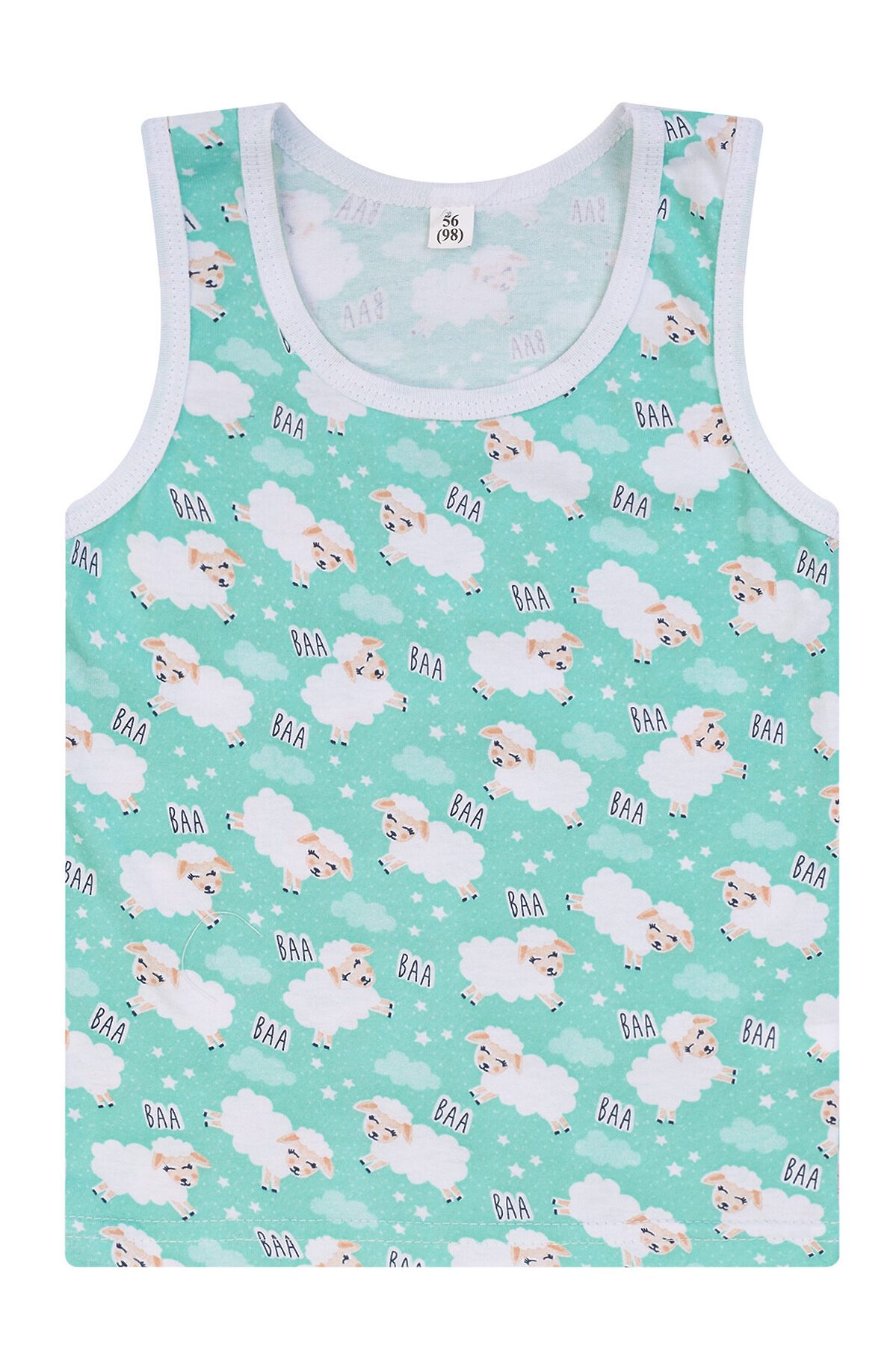 Лёгкий, приятный к телу, хорошо пропускающий воздух, гипоаллергенный трикотаж бирюзового цвета с принтом овечки. Горловина и пройма рукавов обработаны трикотажной бейкой. Низ подогнут и прошит. >