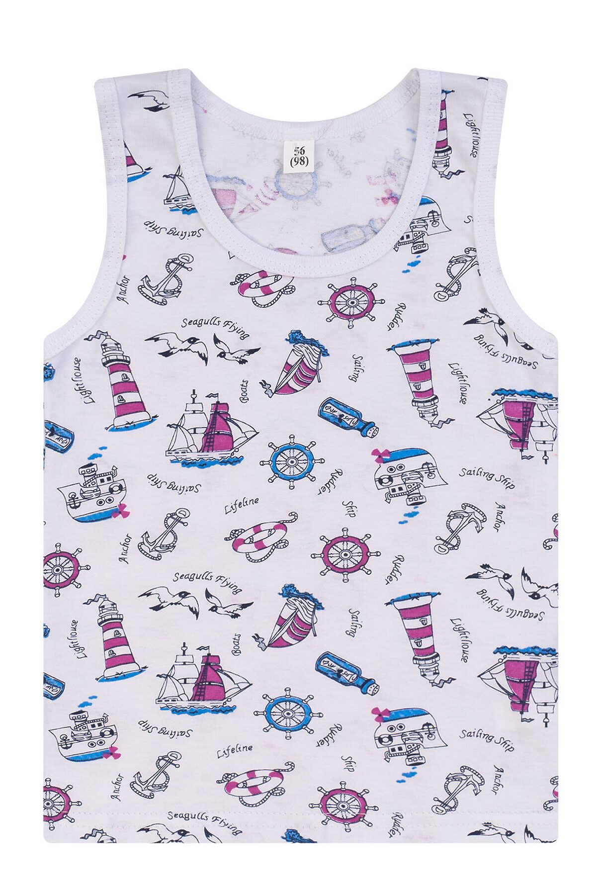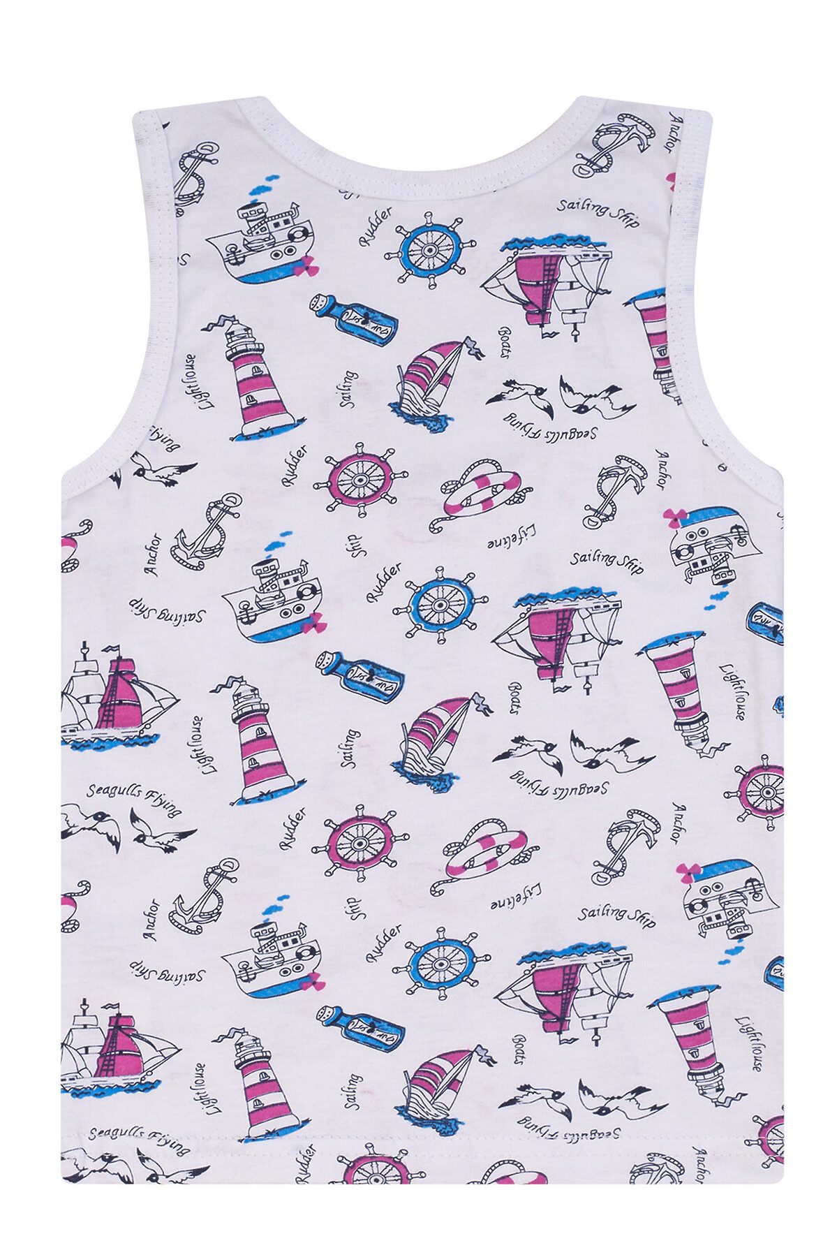 Лёгкий, приятный к телу, хорошо пропускающий воздух, гипоаллергенный трикотаж белого цвета с принтом корабли, парусники и маяки. Горловина и пройма рукавов обработаны трикотажной бейкой. Низ подогнут и прошит. >