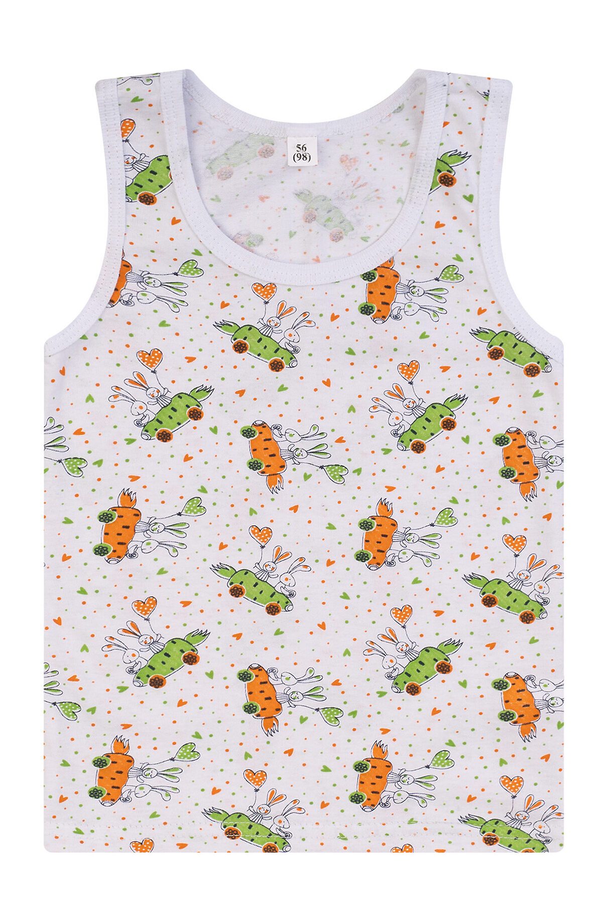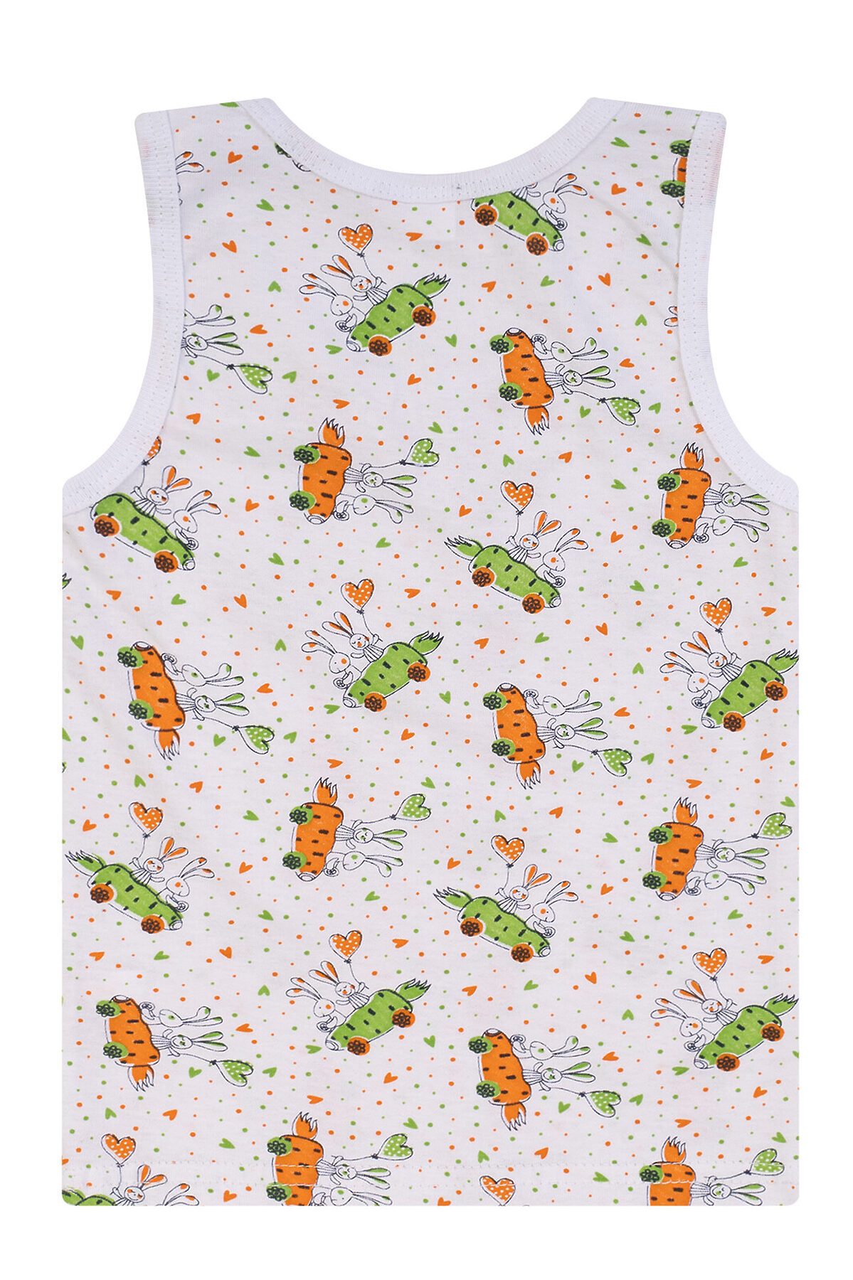 Лёгкий, приятный к телу, хорошо пропускающий воздух, гипоаллергенный трикотаж белого цвета с принтом морковки-машинки с кроликами. Горловина и пройма рукавов обработаны трикотажной бейкой. Низ подогнут и прошит. >