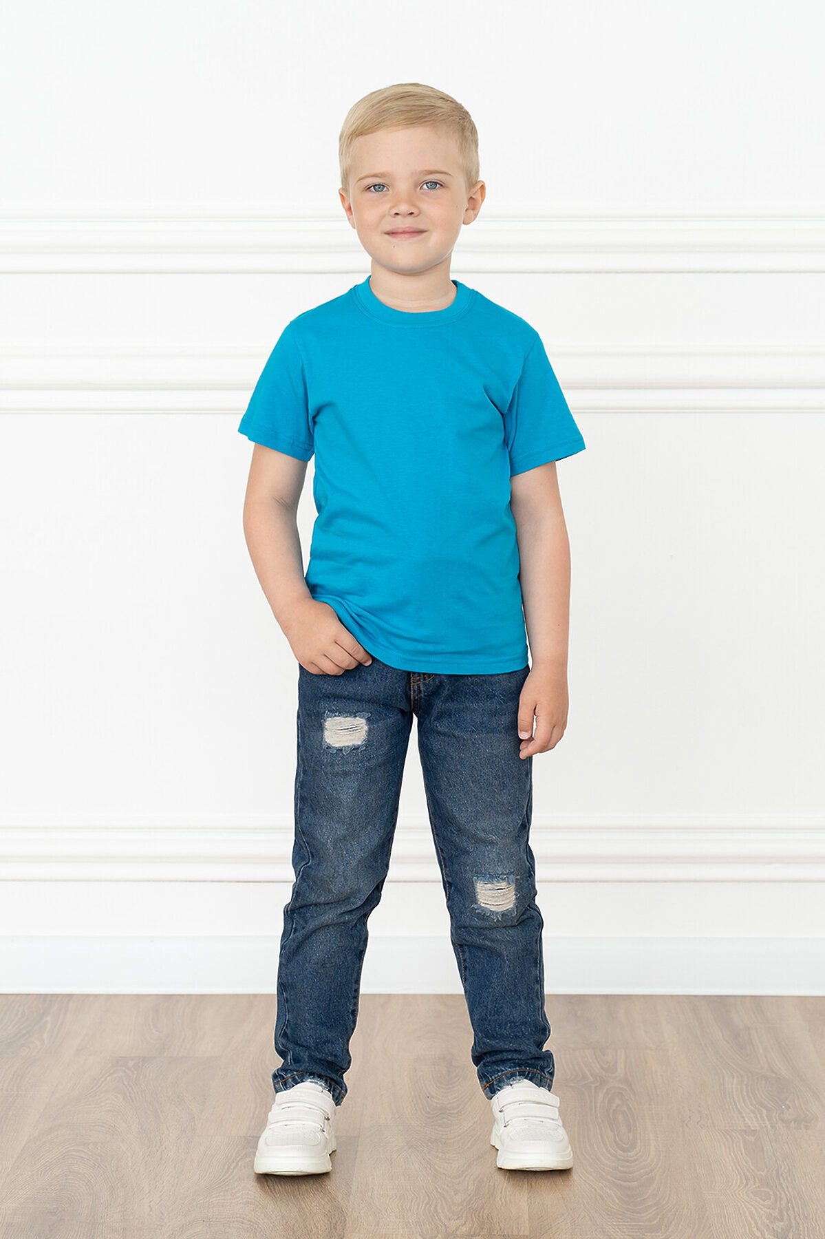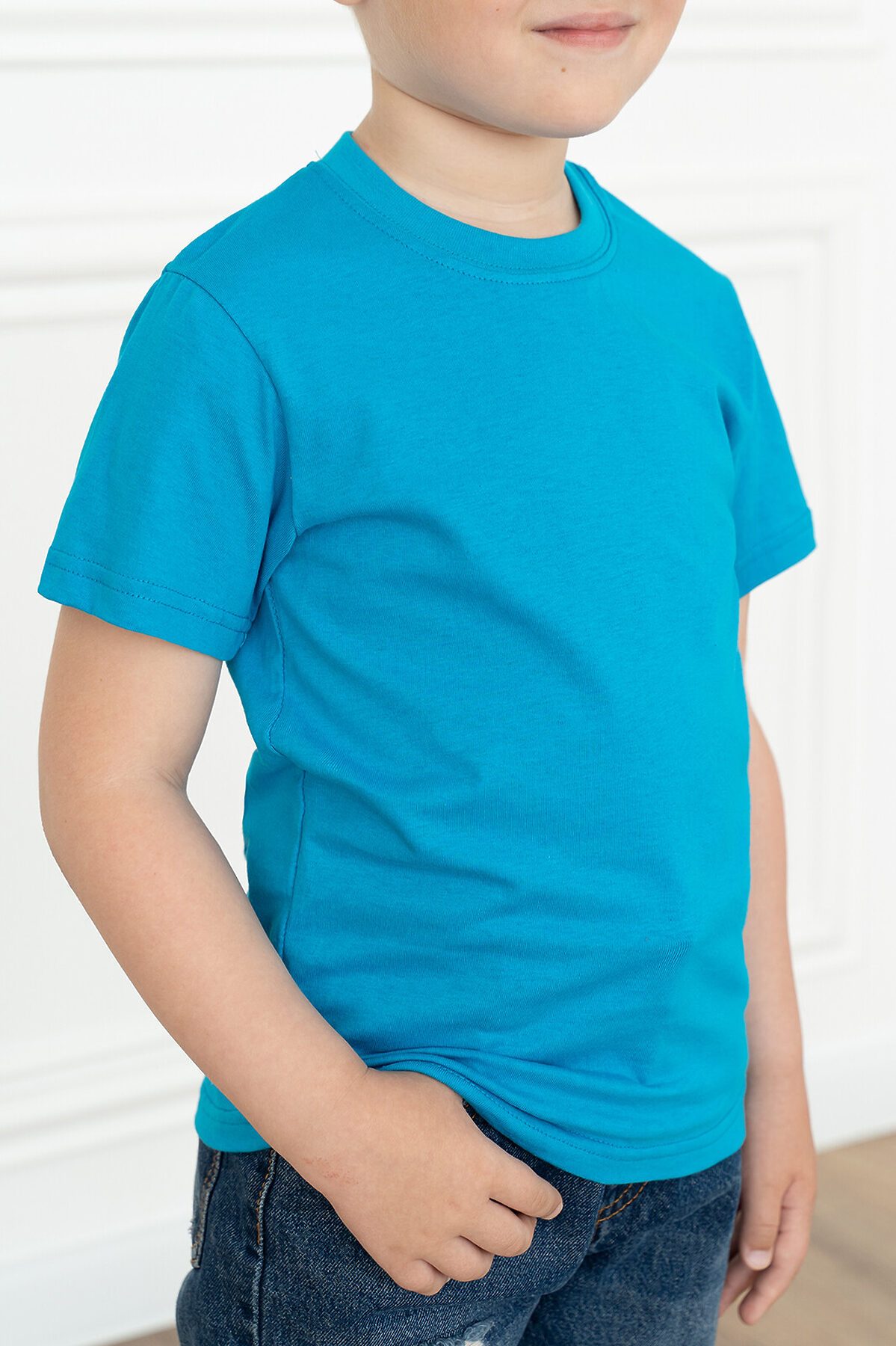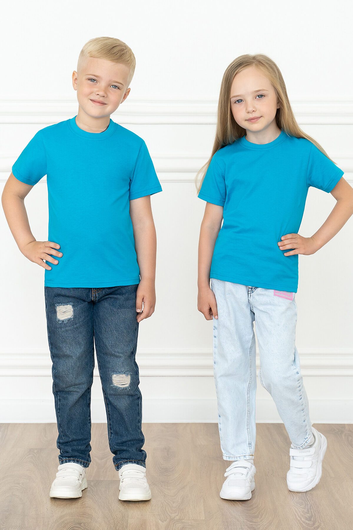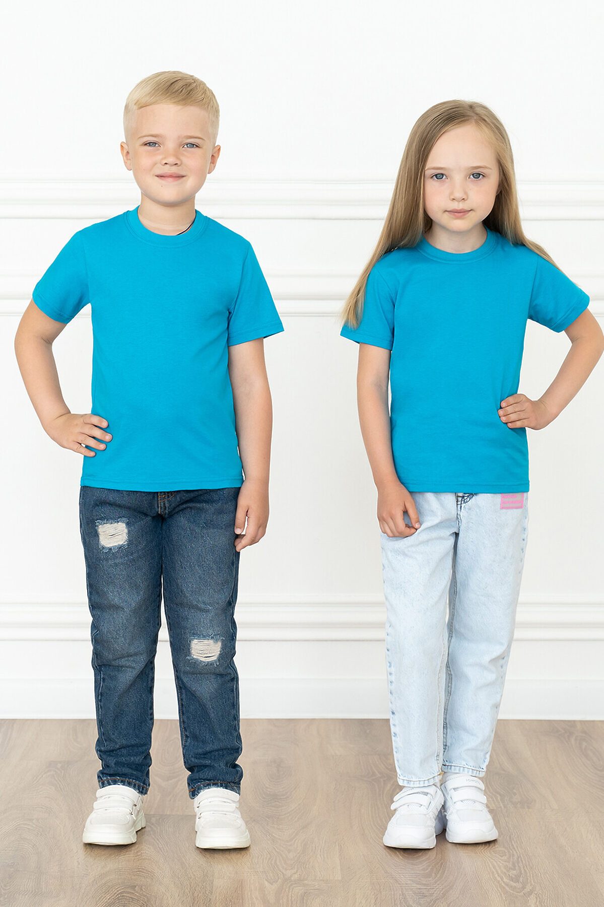 Удобный и универсальный предмет гардероба. Футболка однотонного бирюзового цвета. Горловина отделана трикотажной бейкой. Край рукавов и низ прошиты швом вподгибку. >