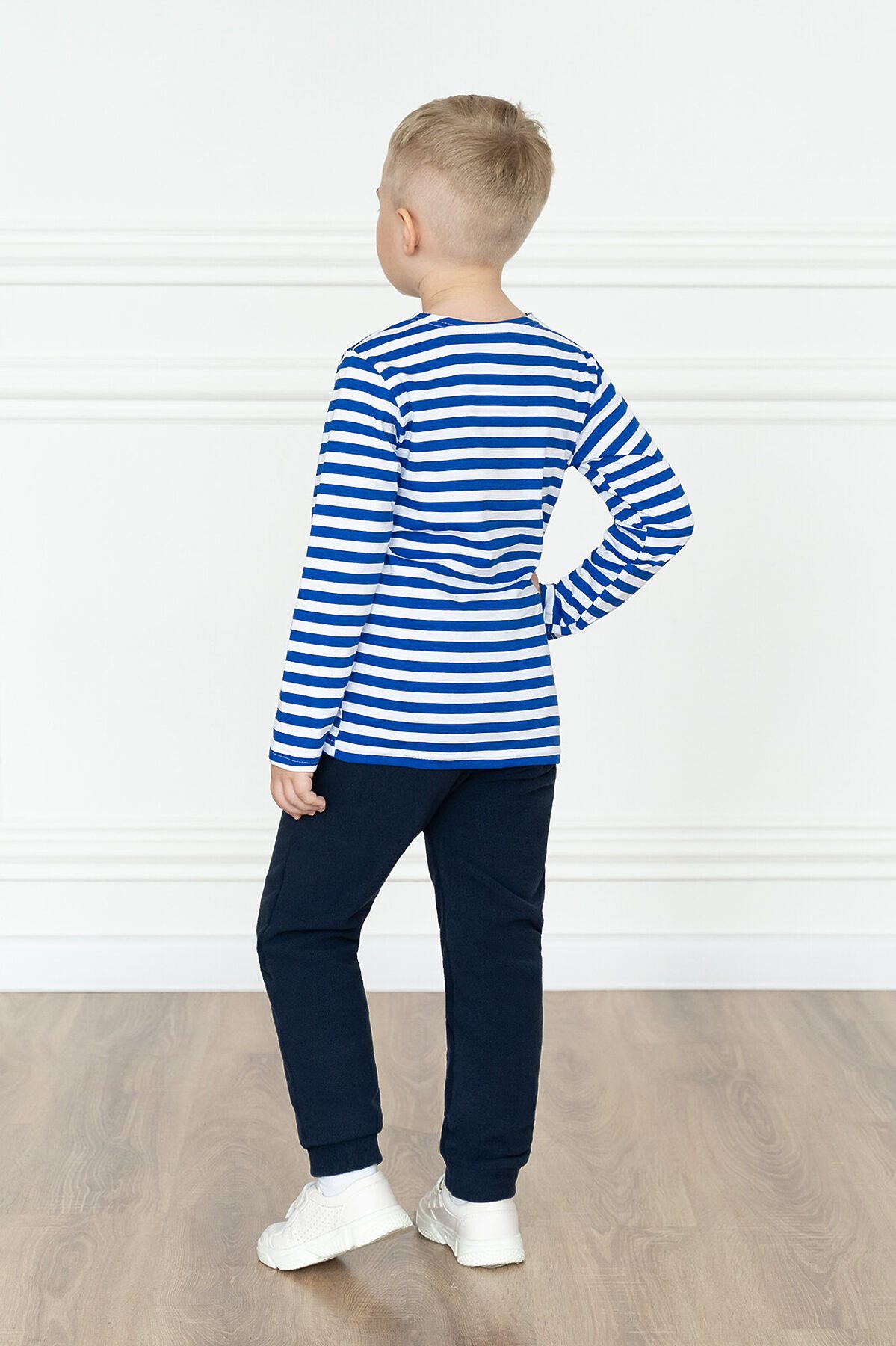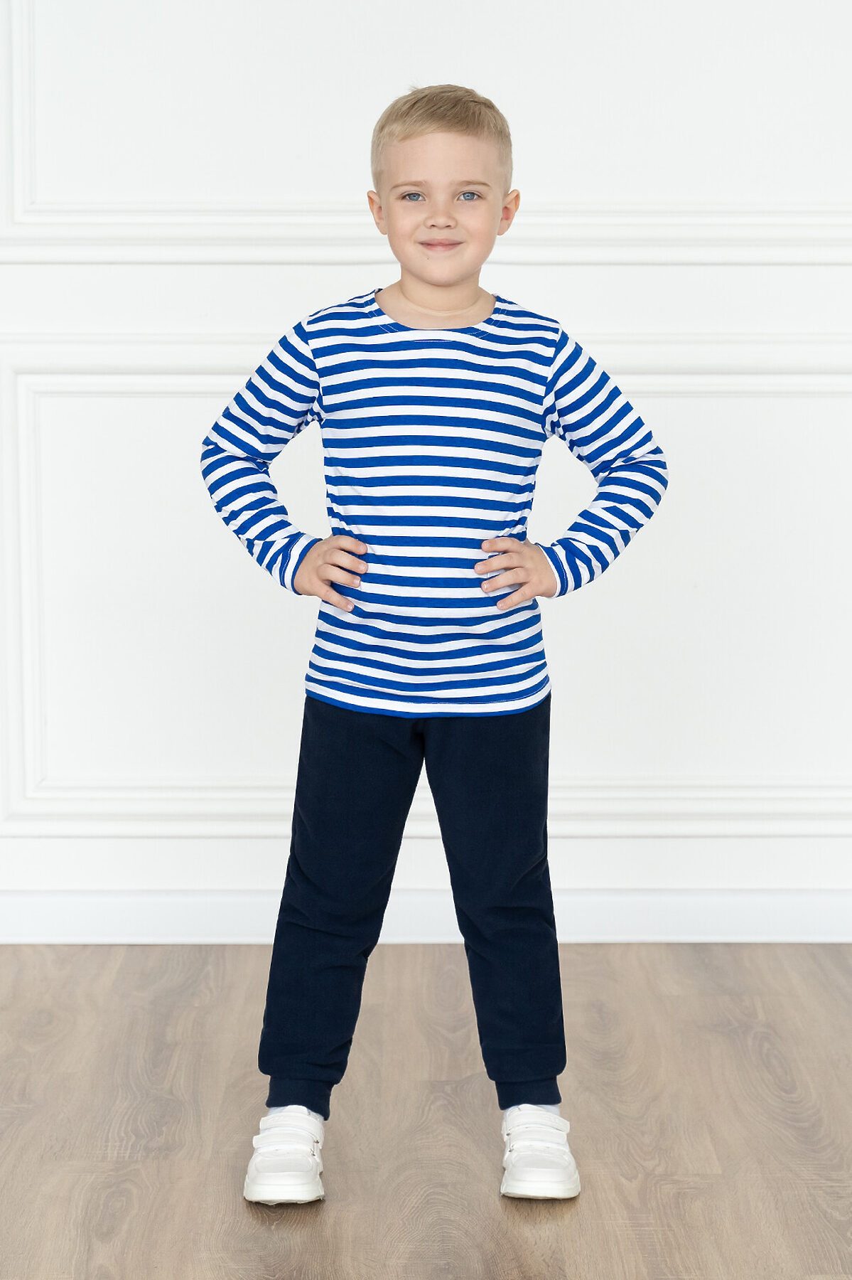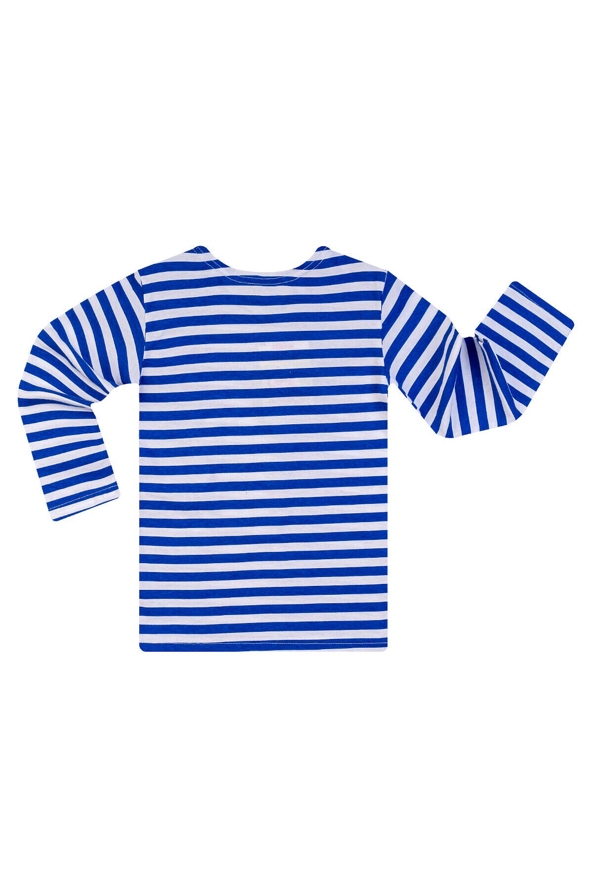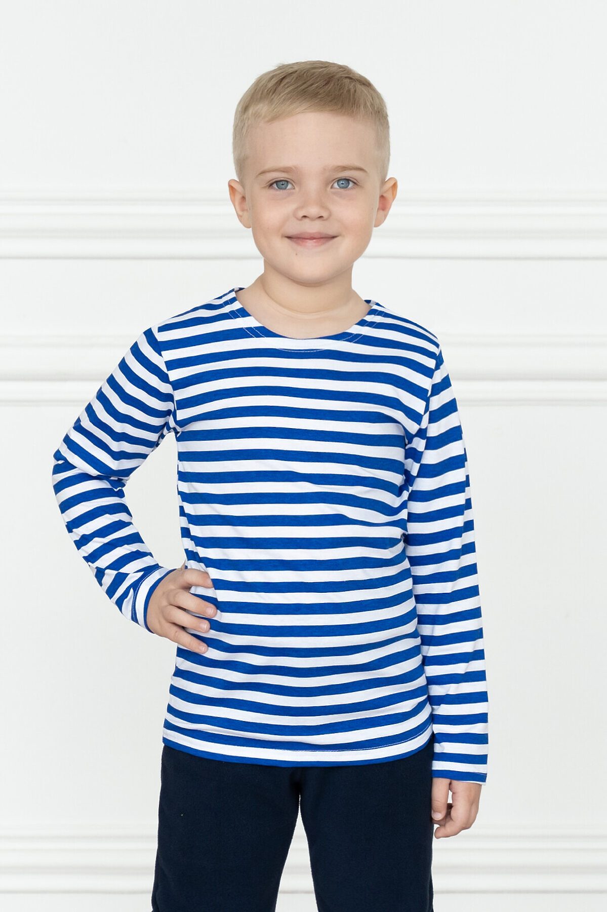 Детская трикотажная тельняшка с длинными рукавами (лонгслив) в ярко-синюю полоску. Сшита из мягкой, приятной и дышащей кулирки (100 % хлопок). Край рукавов, горловина и низ изделия подогнуты и прошиты крепкой строчкой. Тельняшка подходит для повседневной носки дома и на улице. Может стать деталью костюма пирата, военного или моряка. >