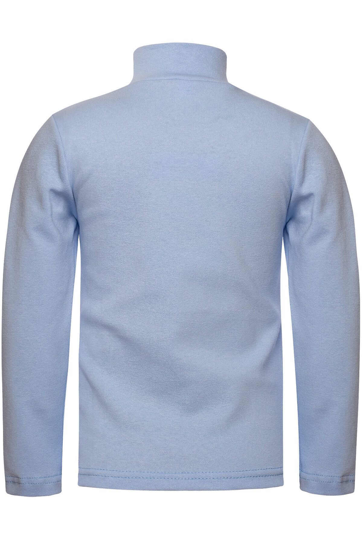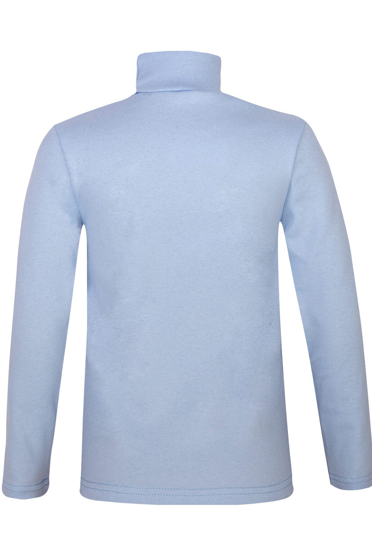 Удобная детская водолазка голубого цвета одинаково хорошо будет смотреться как с юбками, так и с брючками. Изделие сшито из хлопковой рибаны с добавлением нитей лайкры – водолазка хорошо тянется и плотно облегает тело, при этом она довольно нежная на ощупь. Небольшая двуслойная горловина надежно закрывает шею ребёнка. >