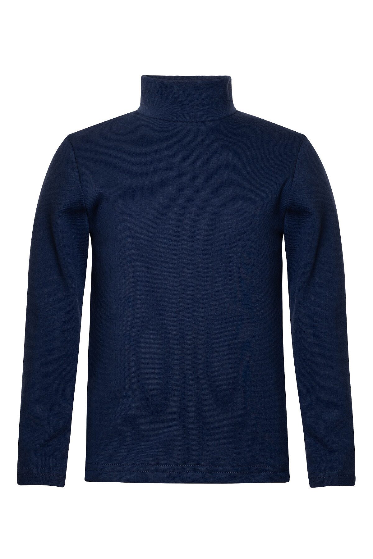 Удобная детская водолазка темно-синего цвета одинаково хорошо будет смотреться как с юбками, так и с брючками. Изделие сшито из хлопковой рибаны с добавлением нитей лайкры – водолазка хорошо тянется и плотно облегает тело, при этом она довольно нежная на ощупь. Небольшая двуслойная горловина надежно закрывает шею ребёнка.>