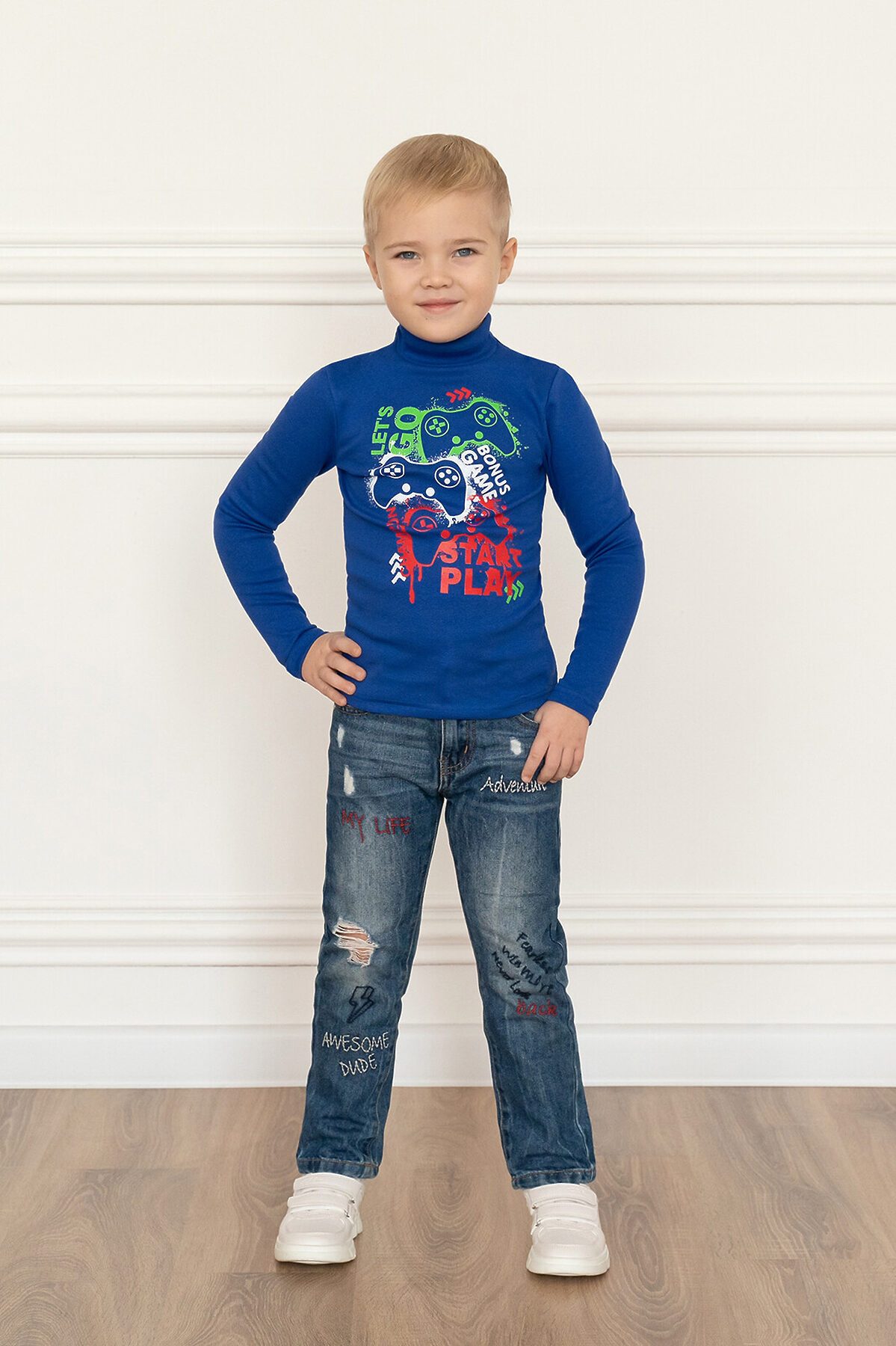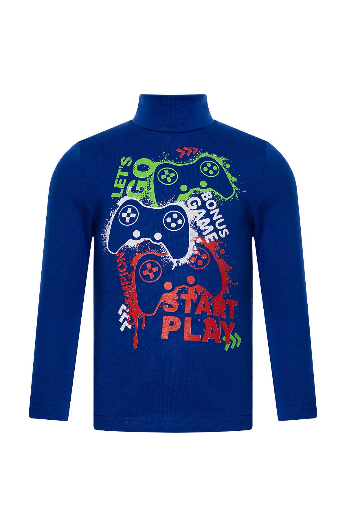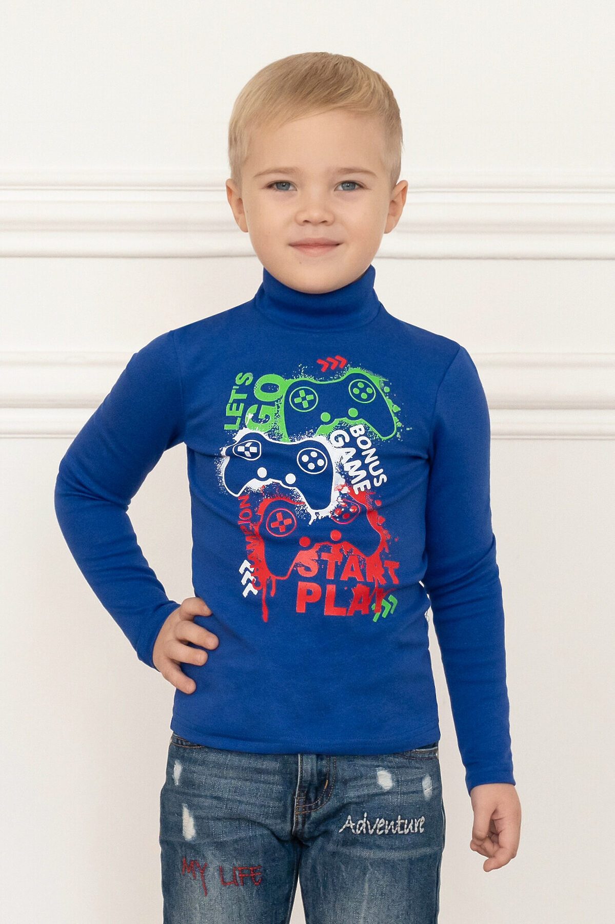 Удобная детская водолазка василькового цвета одинаково хорошо будет смотреться как с юбками, так и с брючками. Изделие сшито из хлопковой рибаны с добавлением нитей лайкры – водолазка хорошо тянется и плотно облегает тело, при этом она довольно нежная на ощупь. Небольшая двуслойная горловина надежно закрывает шею ребёнка. Спереди большой красочный принт игровые джойстики.>