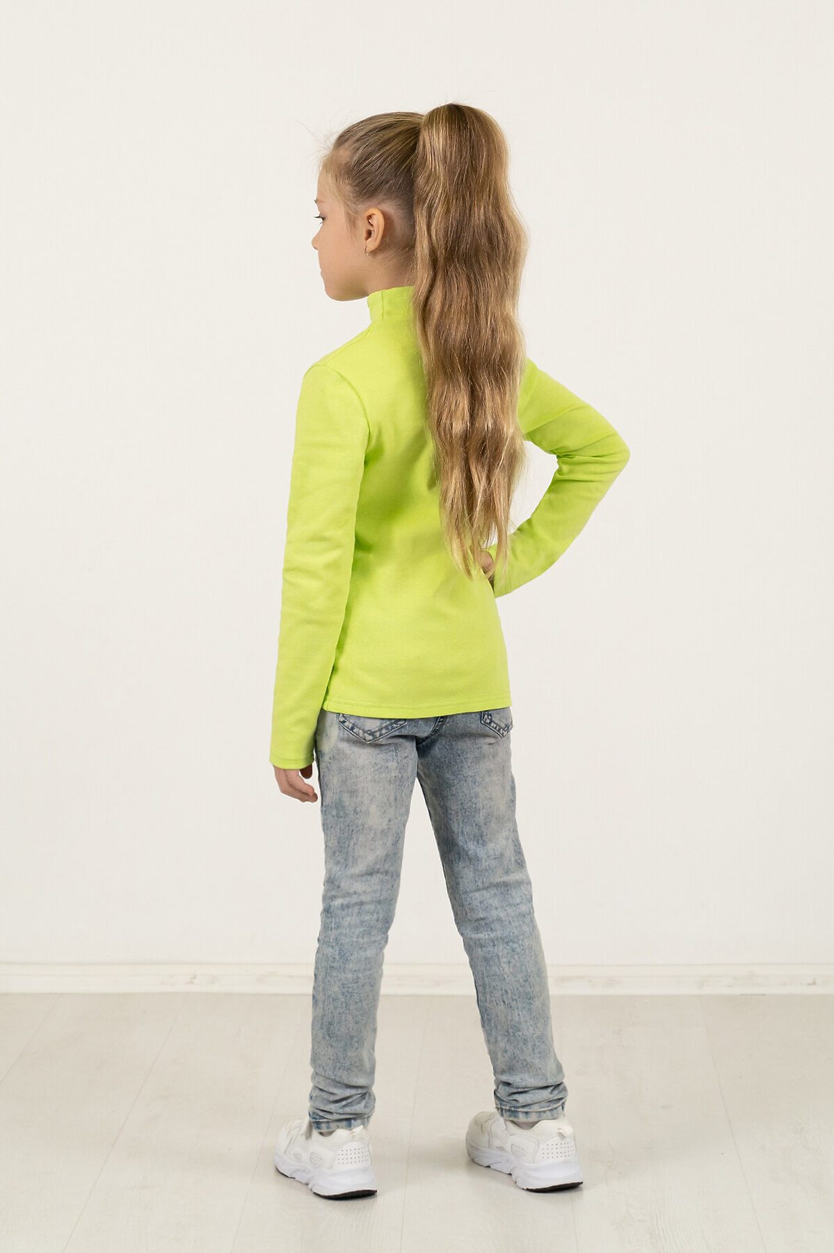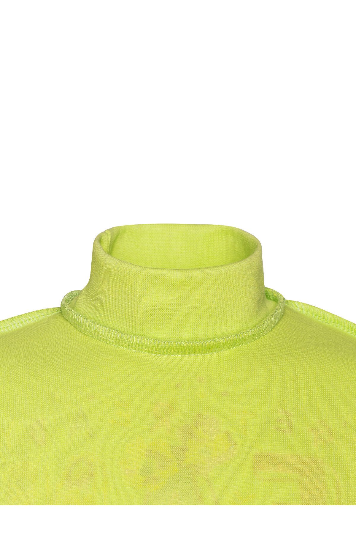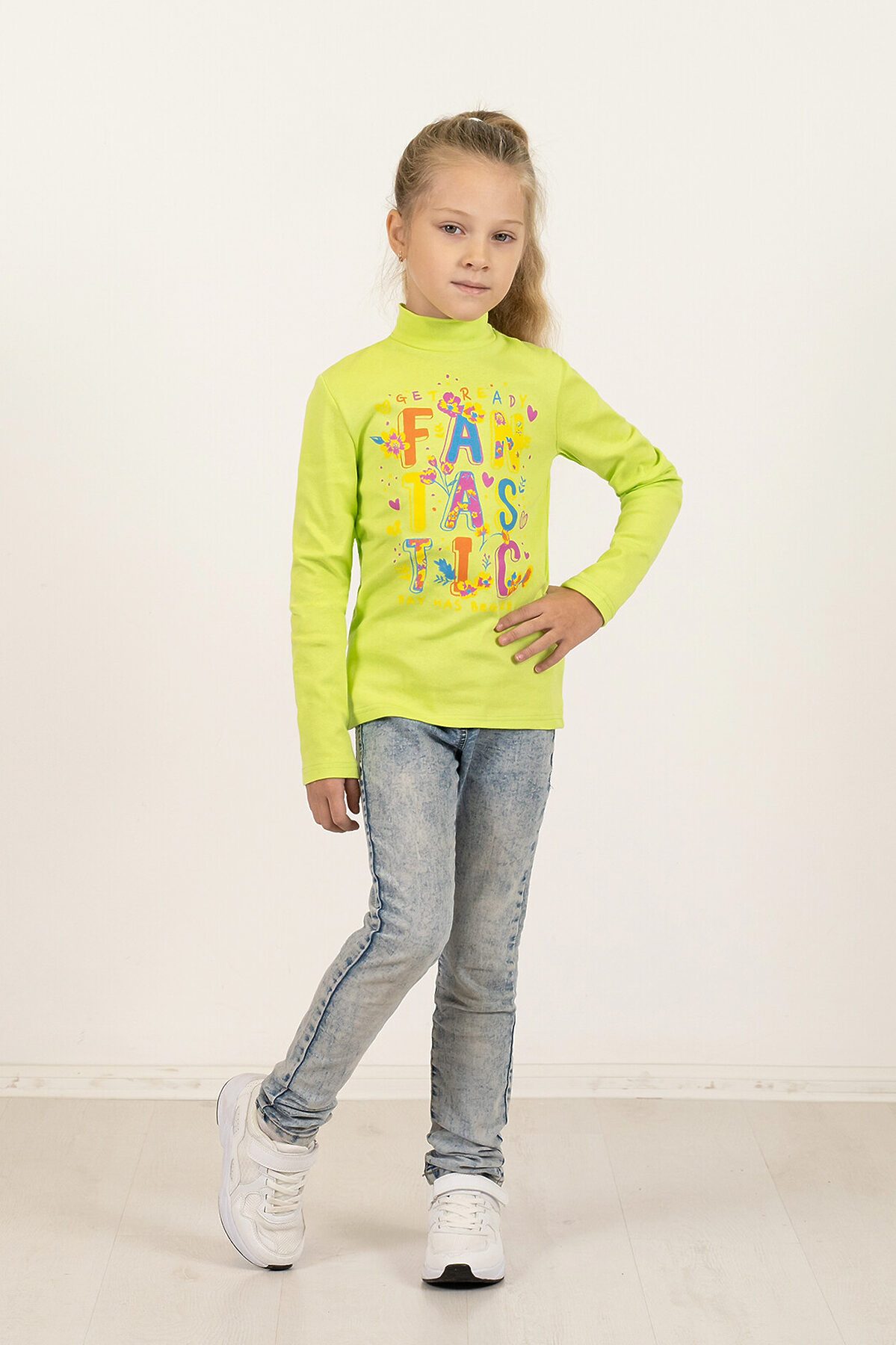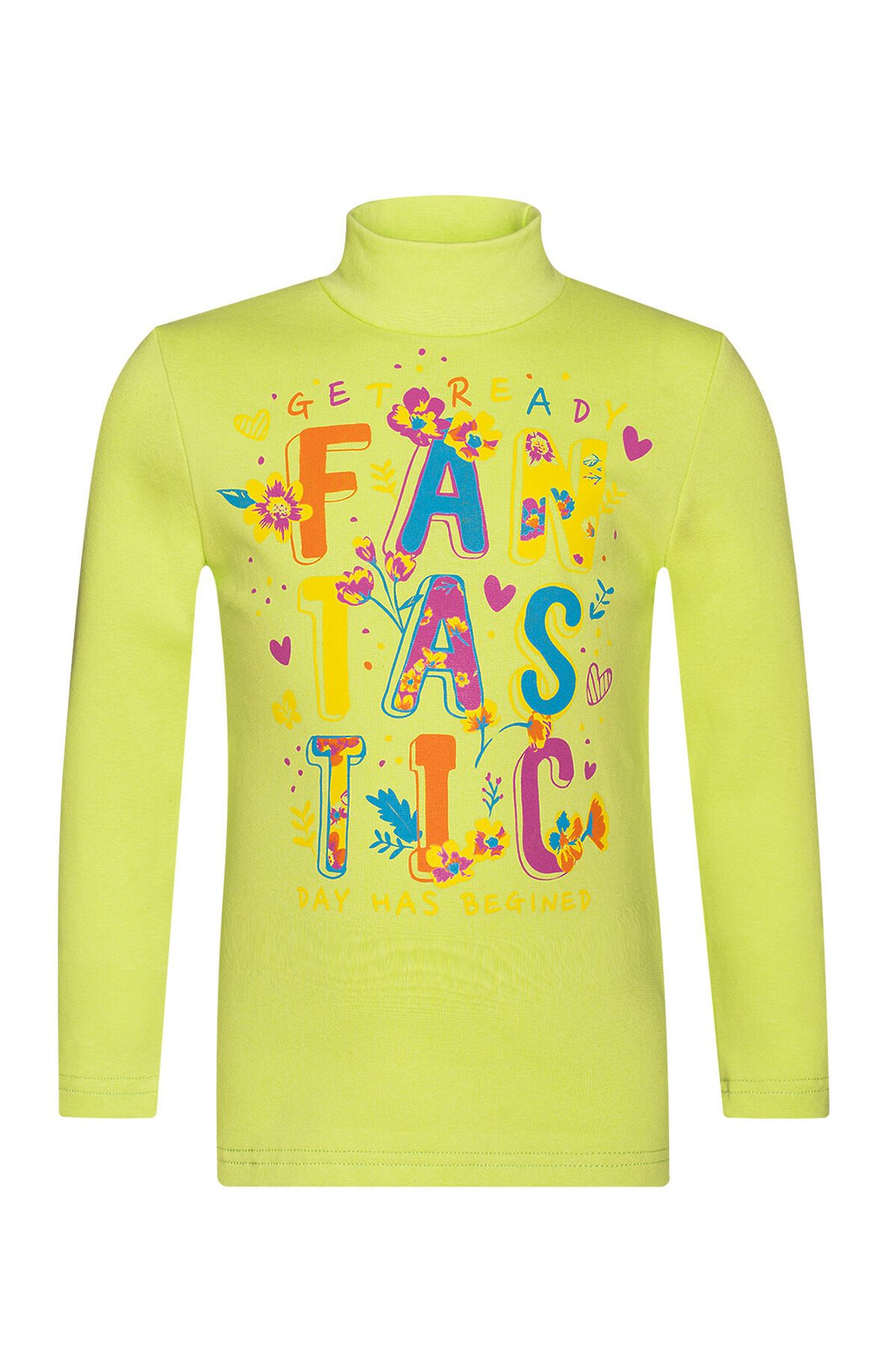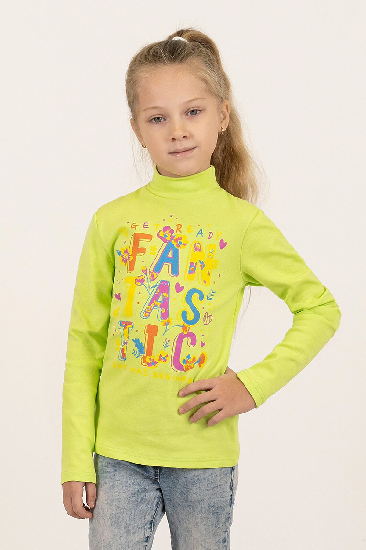 Удобная детская водолазка салатового цвета одинаково хорошо будет смотреться как с юбками, так и с брючками. Изделие сшито из хлопковой рибаны с добавлением нитей лайкры – водолазка хорошо тянется и плотно облегает тело, при этом она довольно нежная на ощупь. Небольшая двуслойная горловина надежно закрывает шею ребёнка. Спереди большой красочный принт Fantastic.>